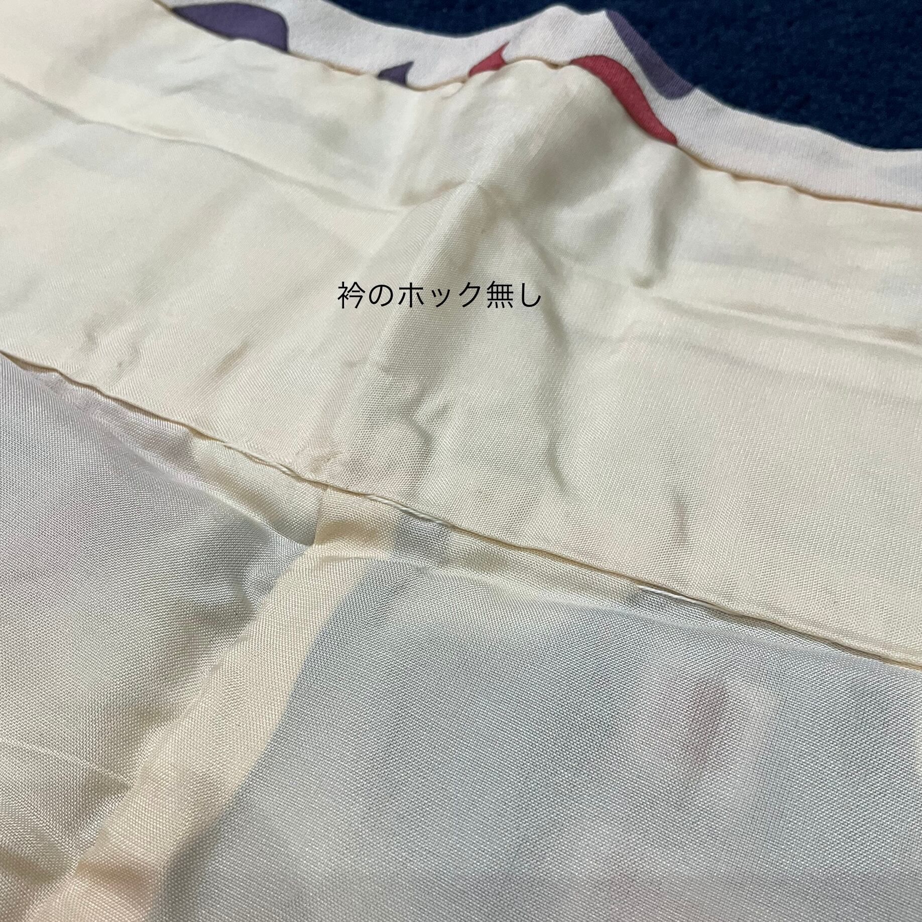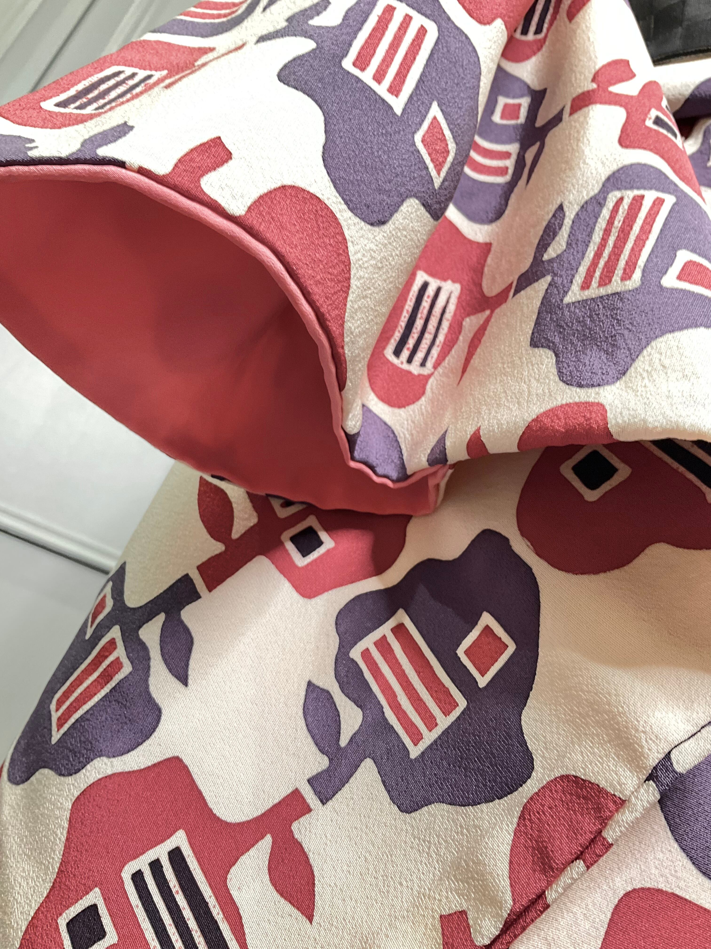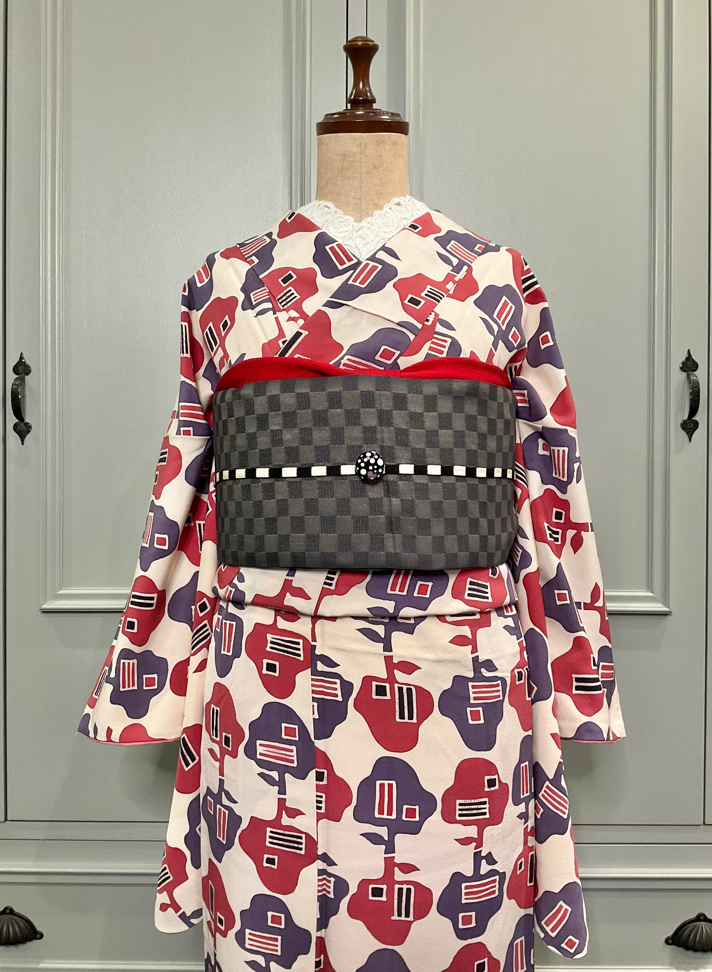アイボリー系の地色に、レッド系×パープル系の抽象柄がデザインされた小紋着物です♪