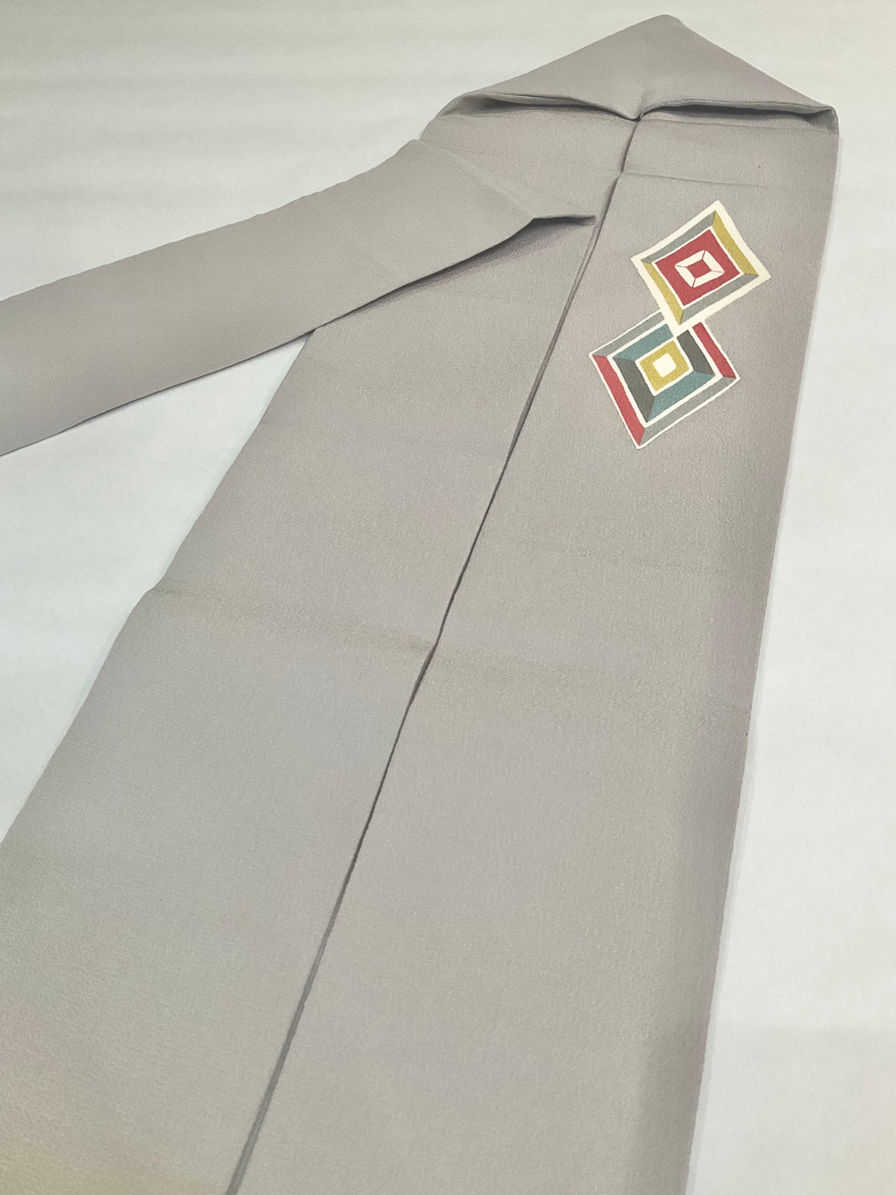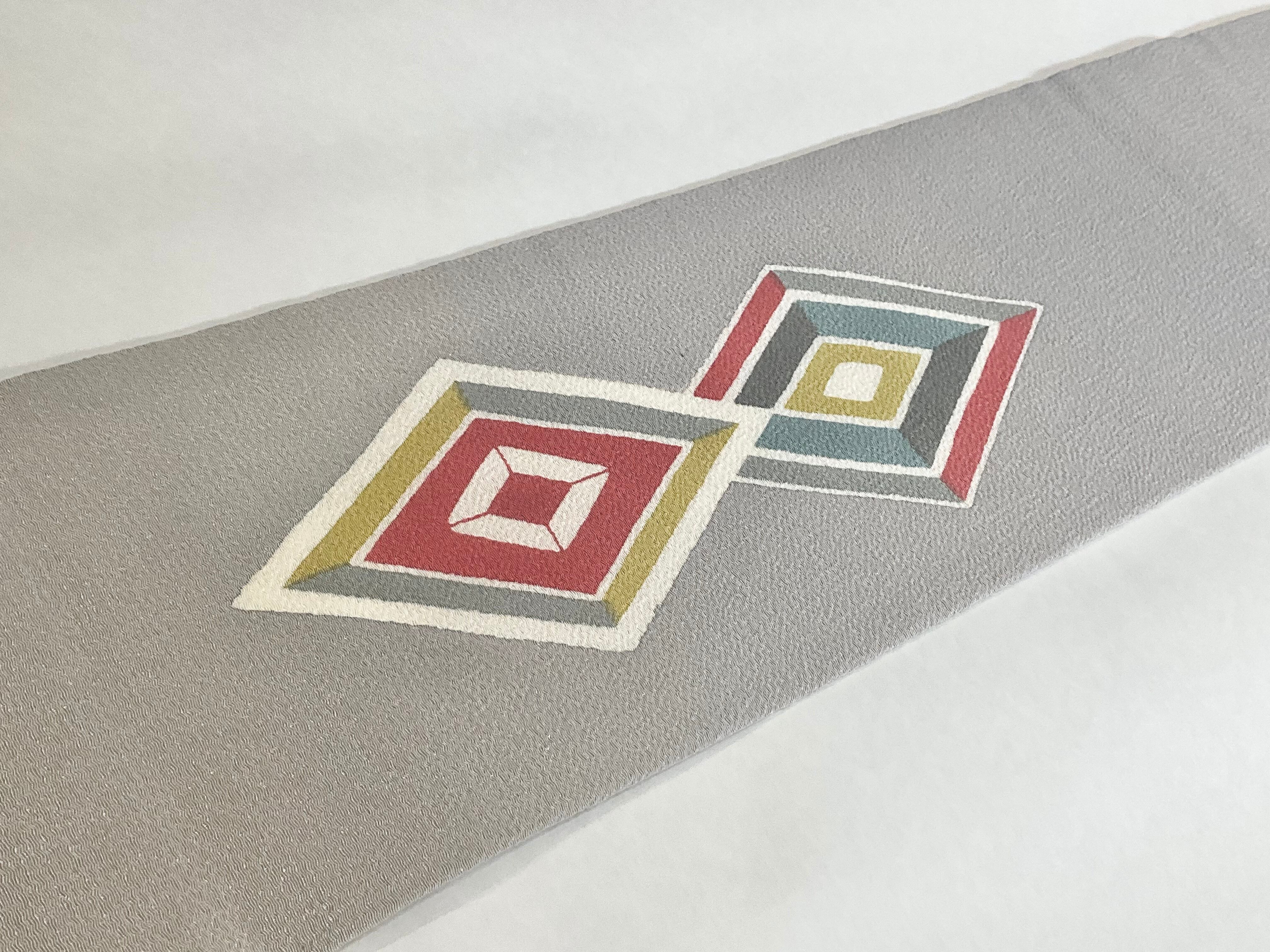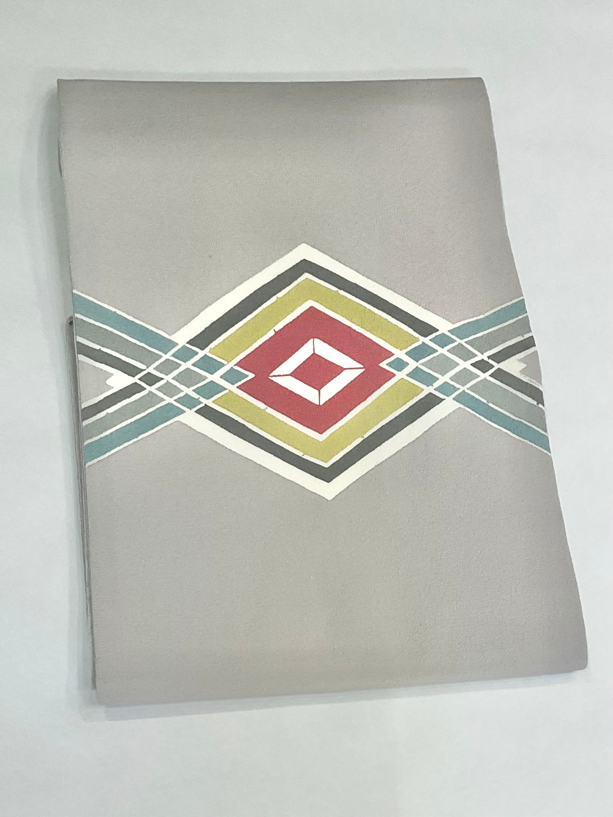ライトグレーの地色に、菱形の模様がデザインされた名古屋帯です。