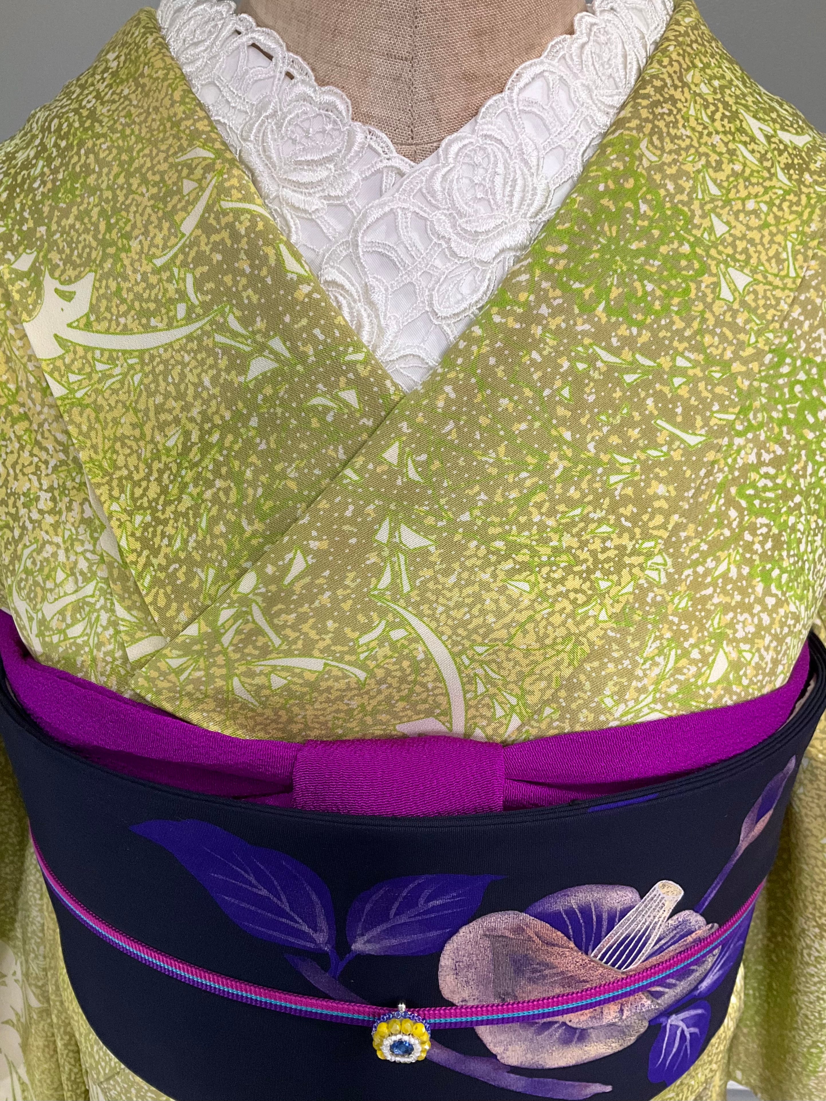 ホワイト×イエローが、絵の具を散らしたようにデザインされたこちらのお着物。