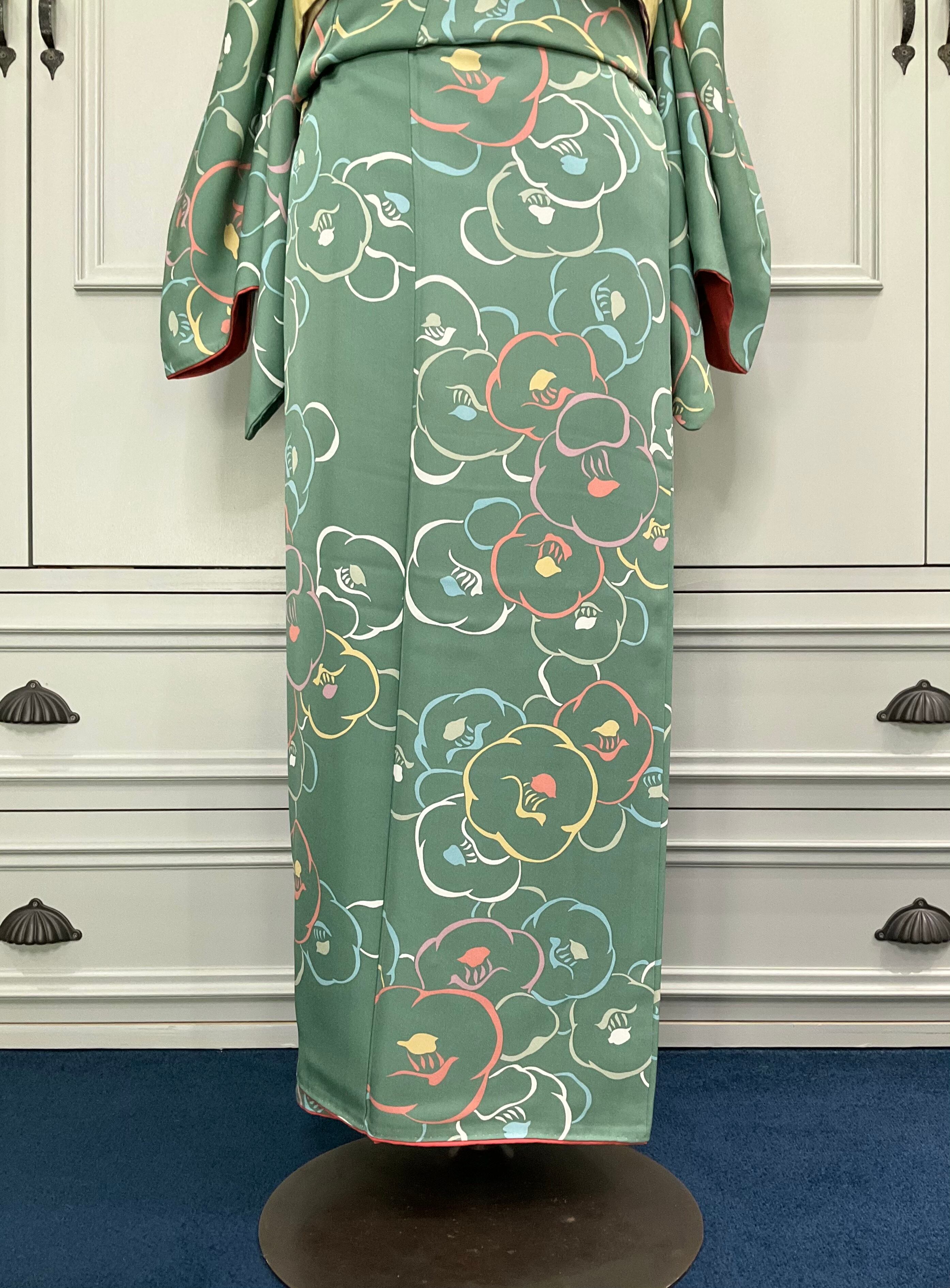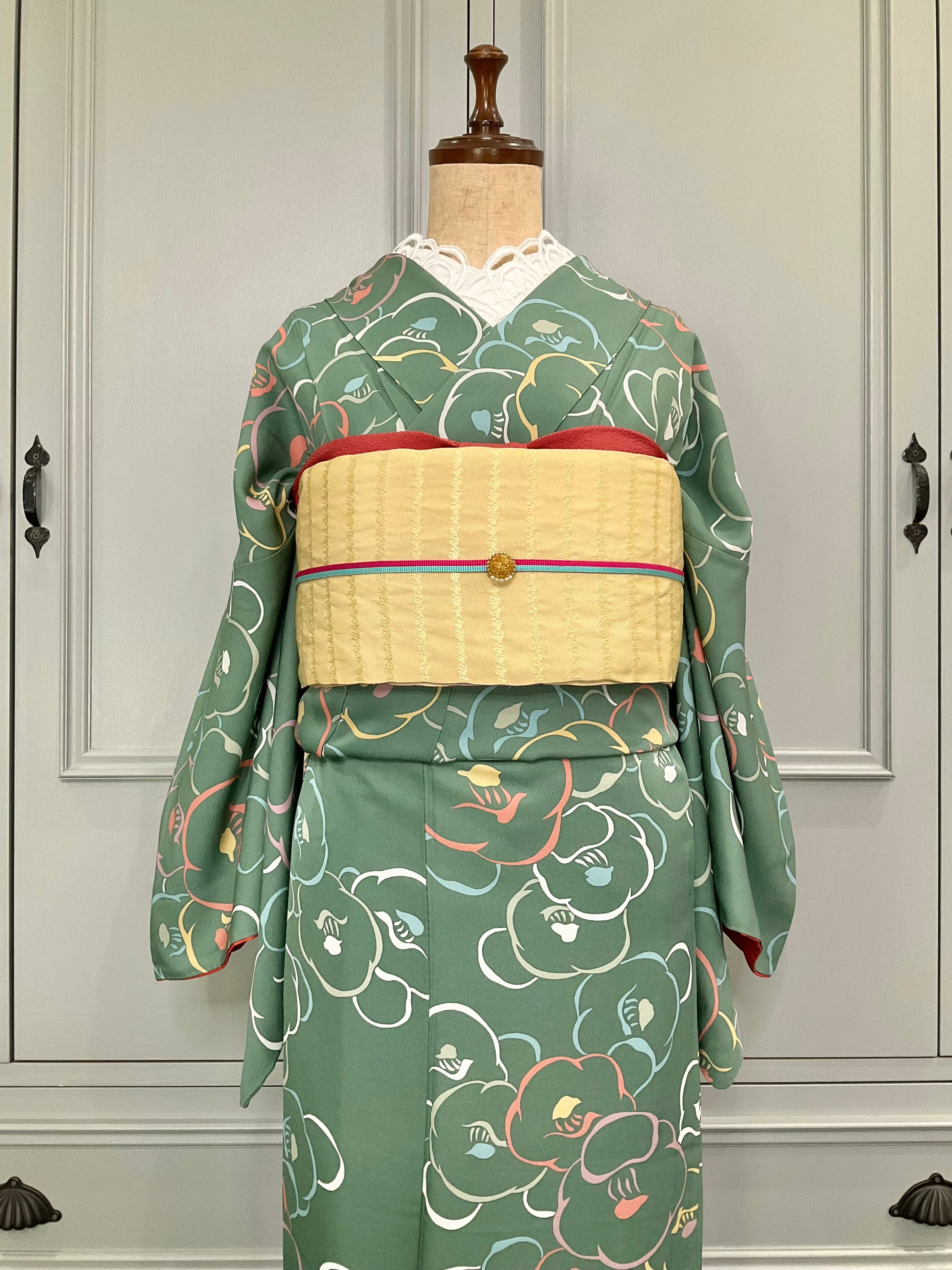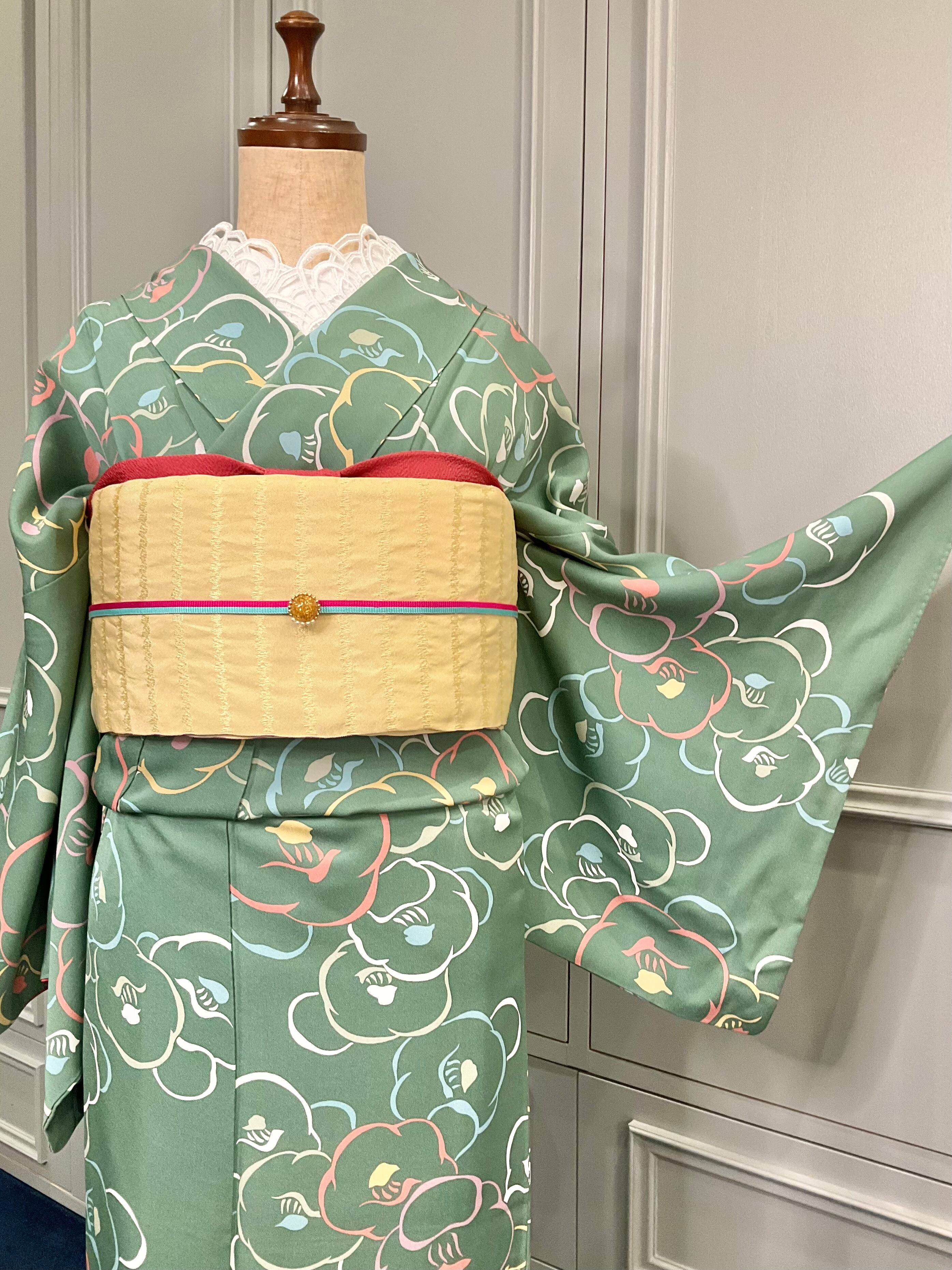 グリーン系の地色に、椿の花模様がデザインされた小紋着物です♪