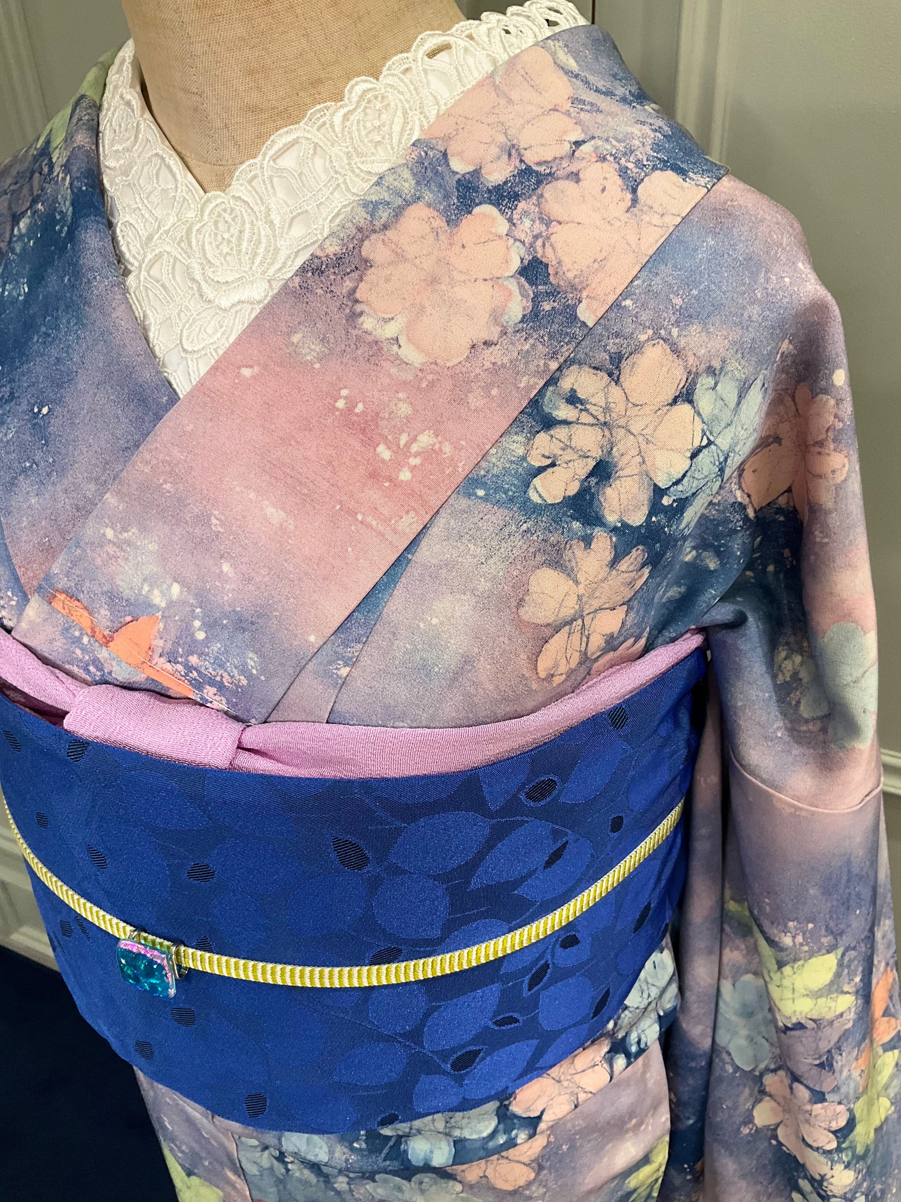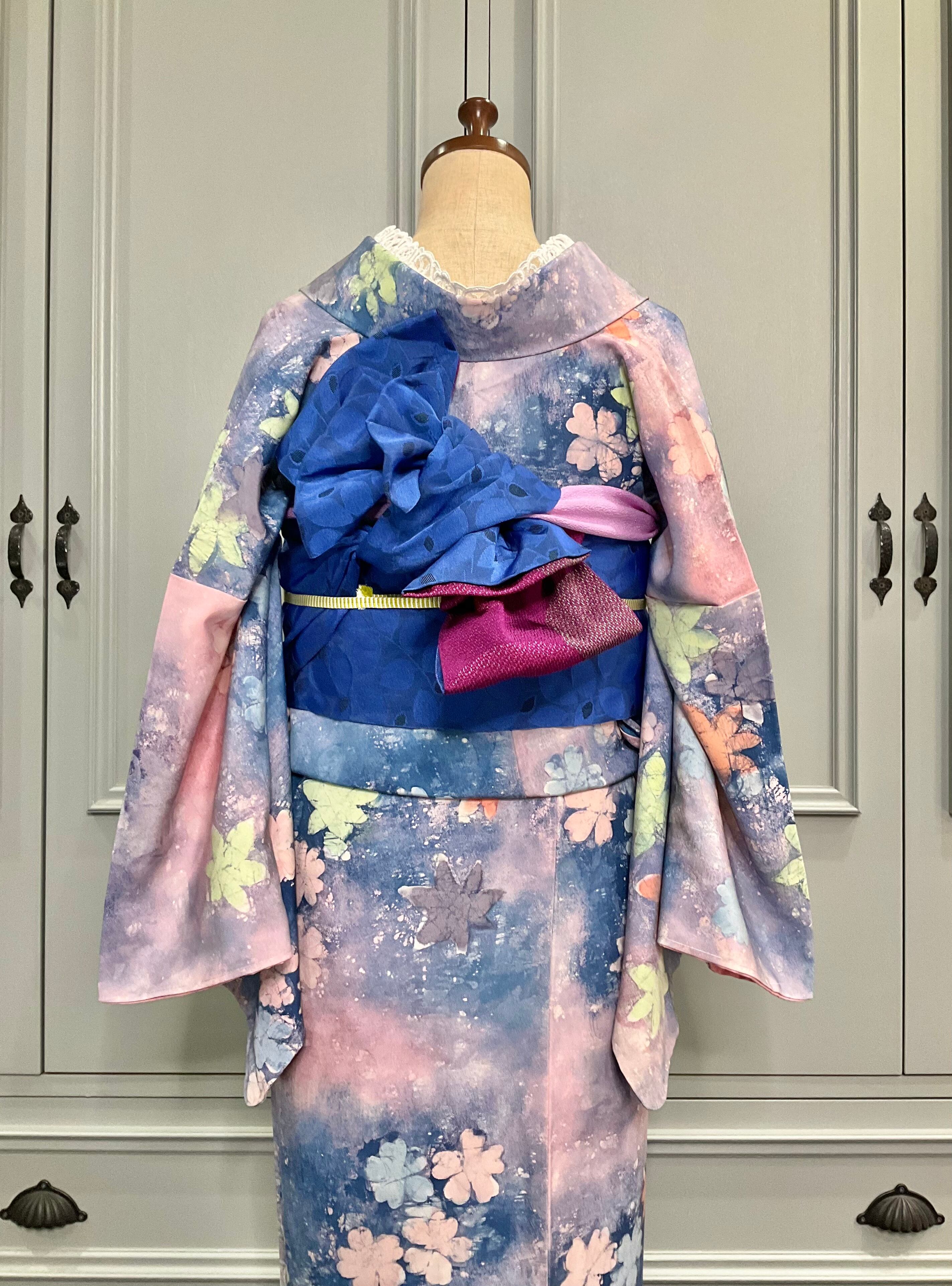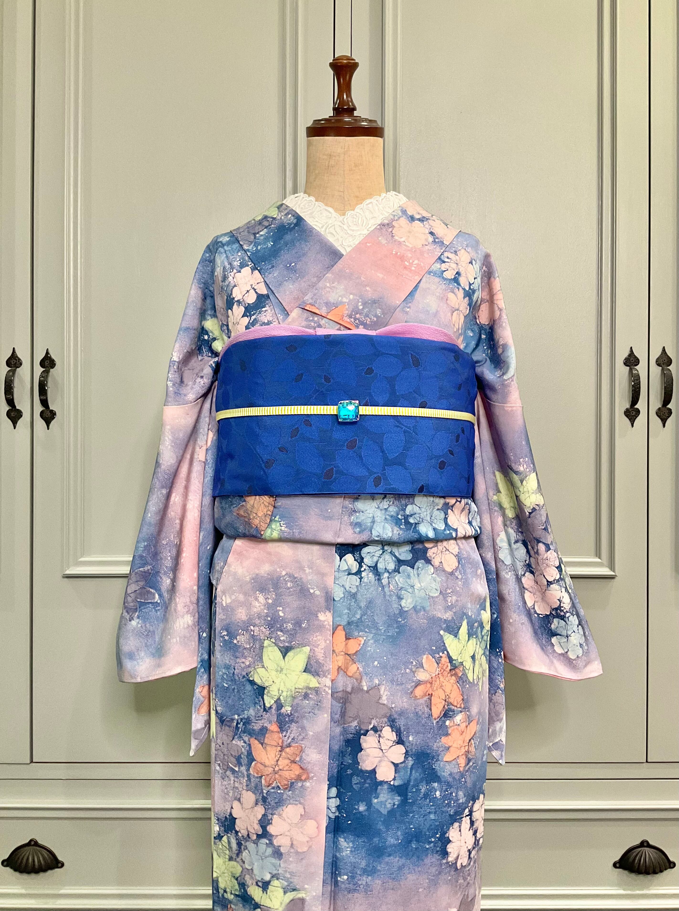 ブルー×ピンクの地色に、花模様がデザインされた小紋着物です♪