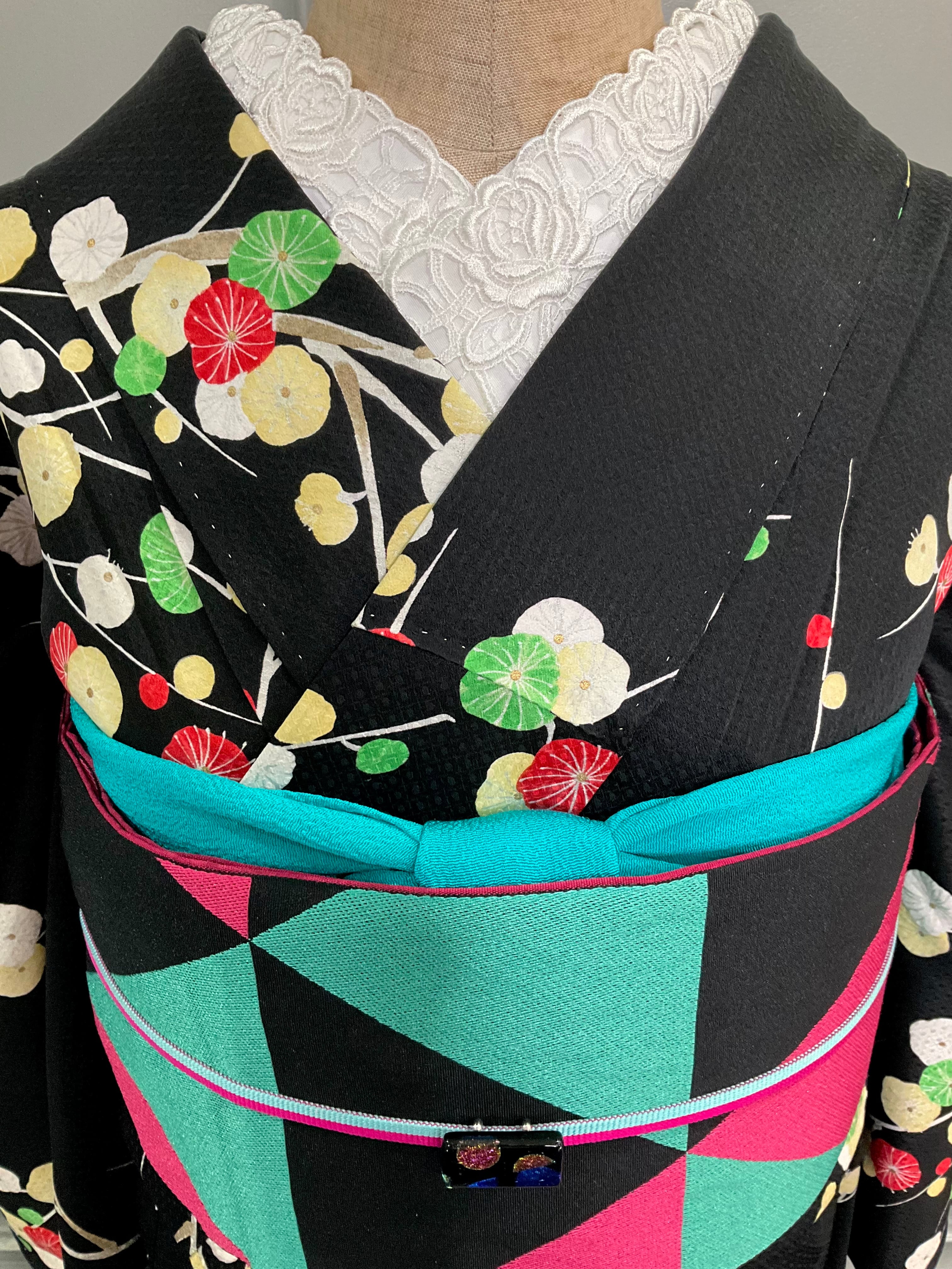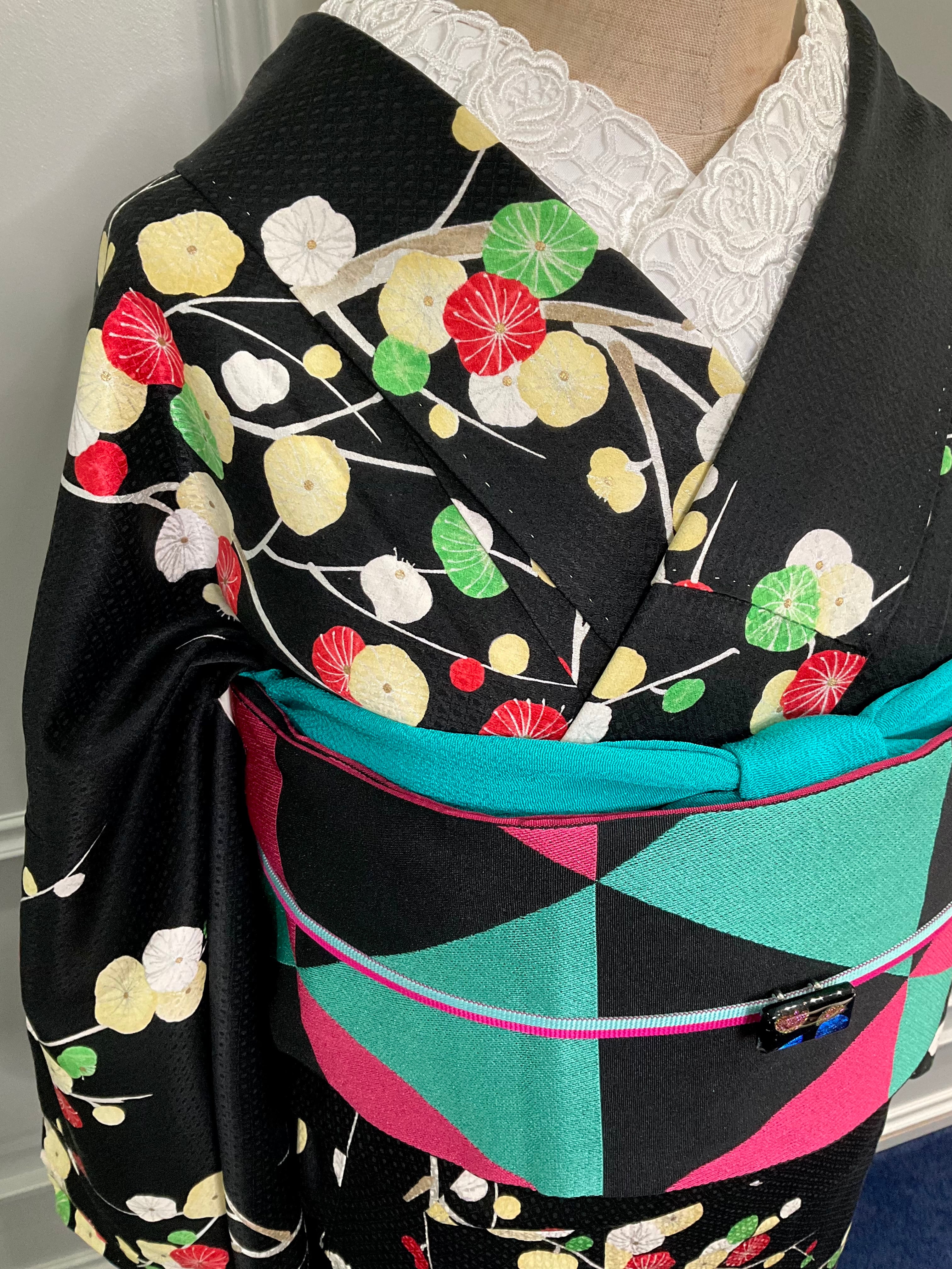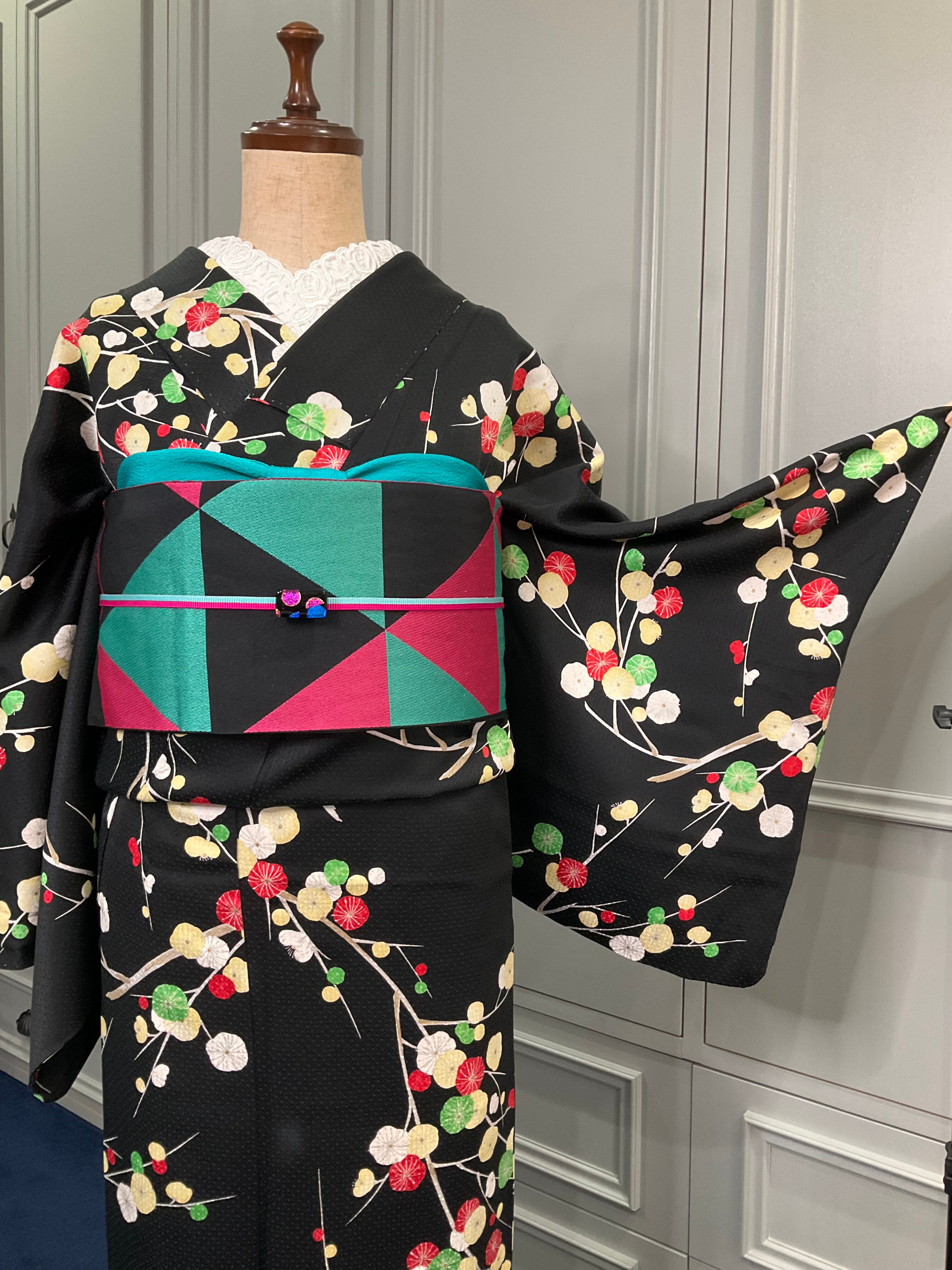 こちらのお着物、ブラックの地色に、まあるい梅がなんとも素敵ですよね✨