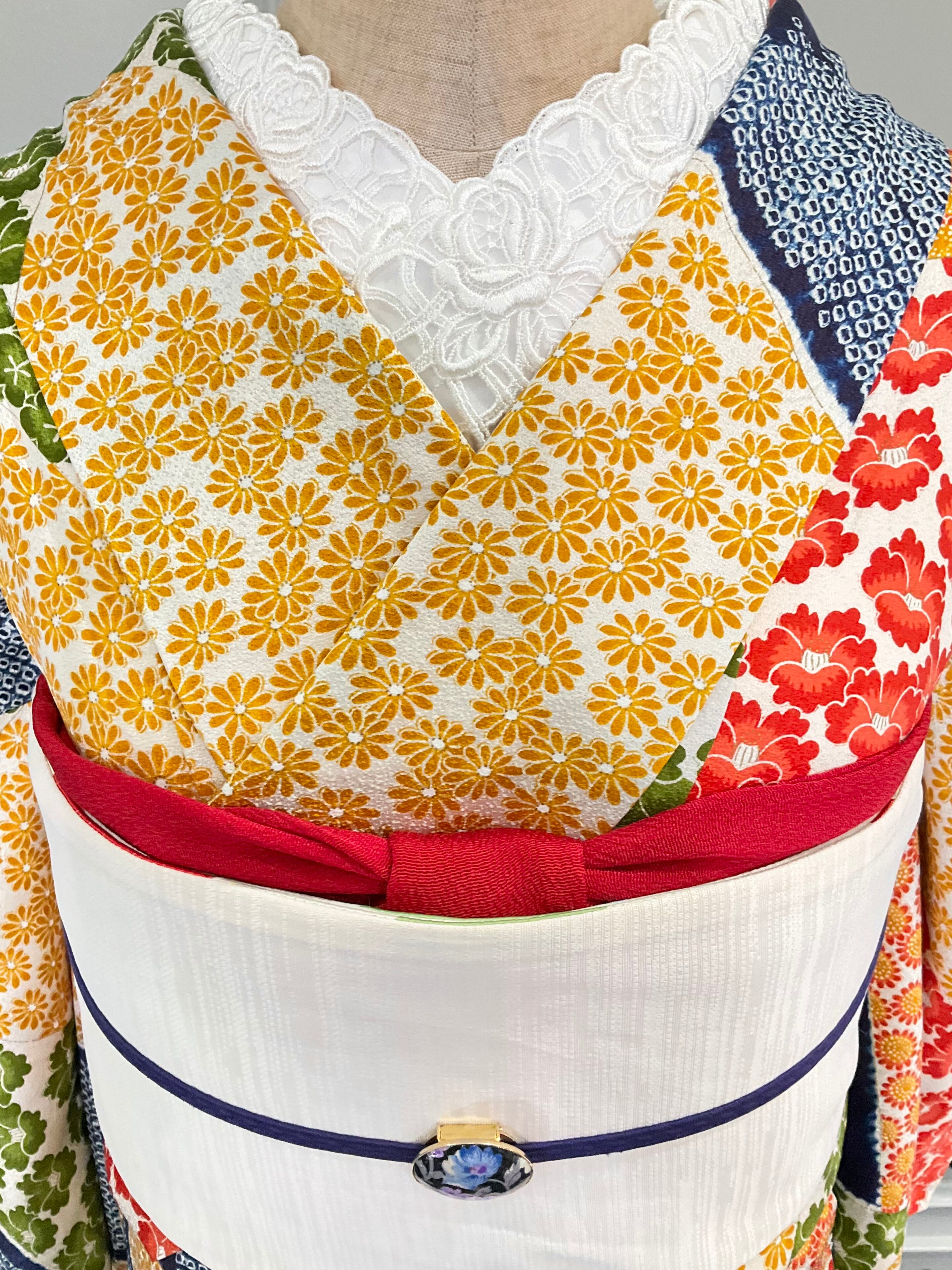 花模様と鹿の子模様が、直線的に区切られているデザインは、なんだか小箱に詰まった花たちを見ているようで、乙女ゴコロをくすぐられます♡