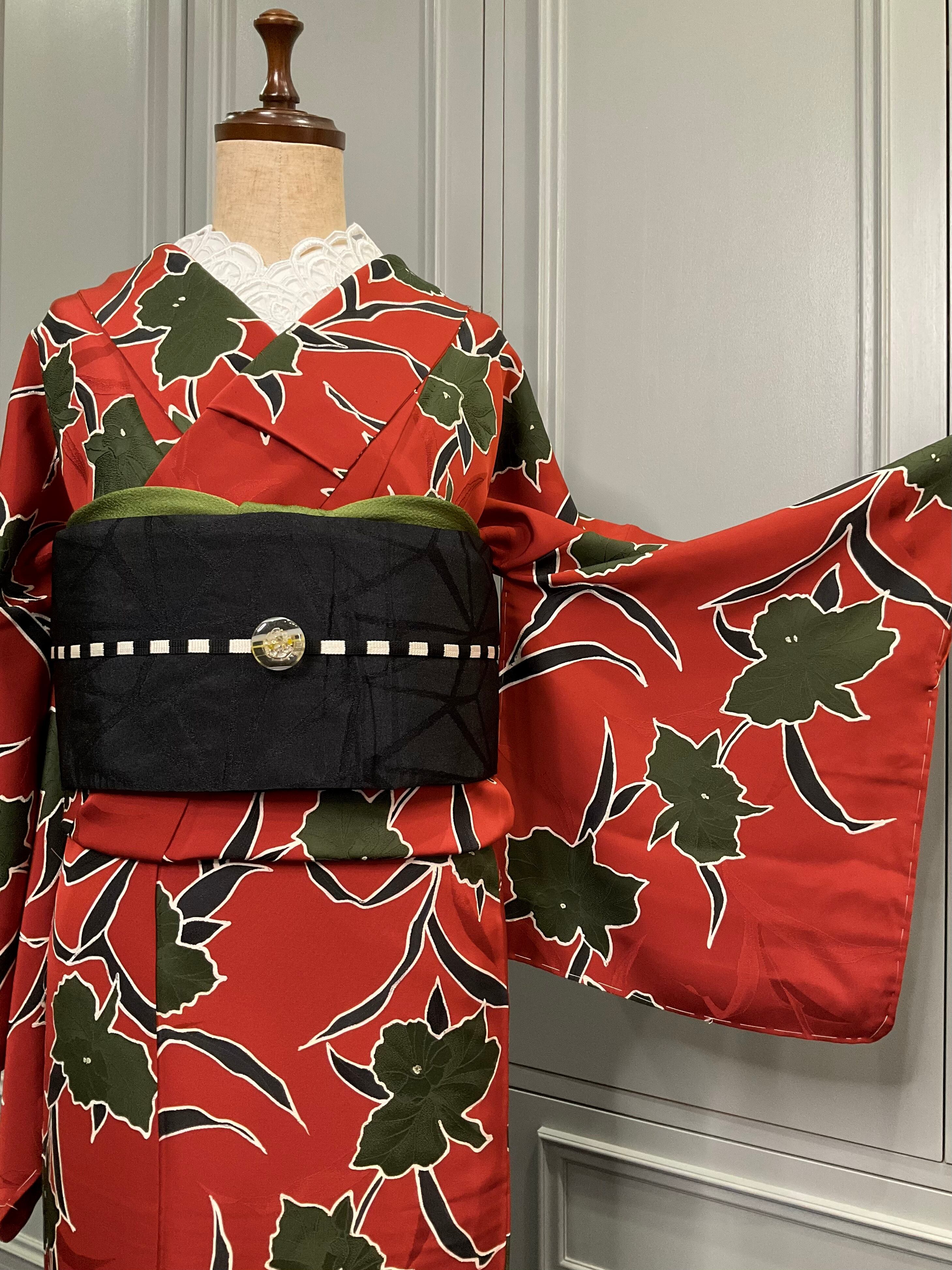 ロング*スカーレット モダンフラワー*未使用品*リサイクル小紋キモノ 0533