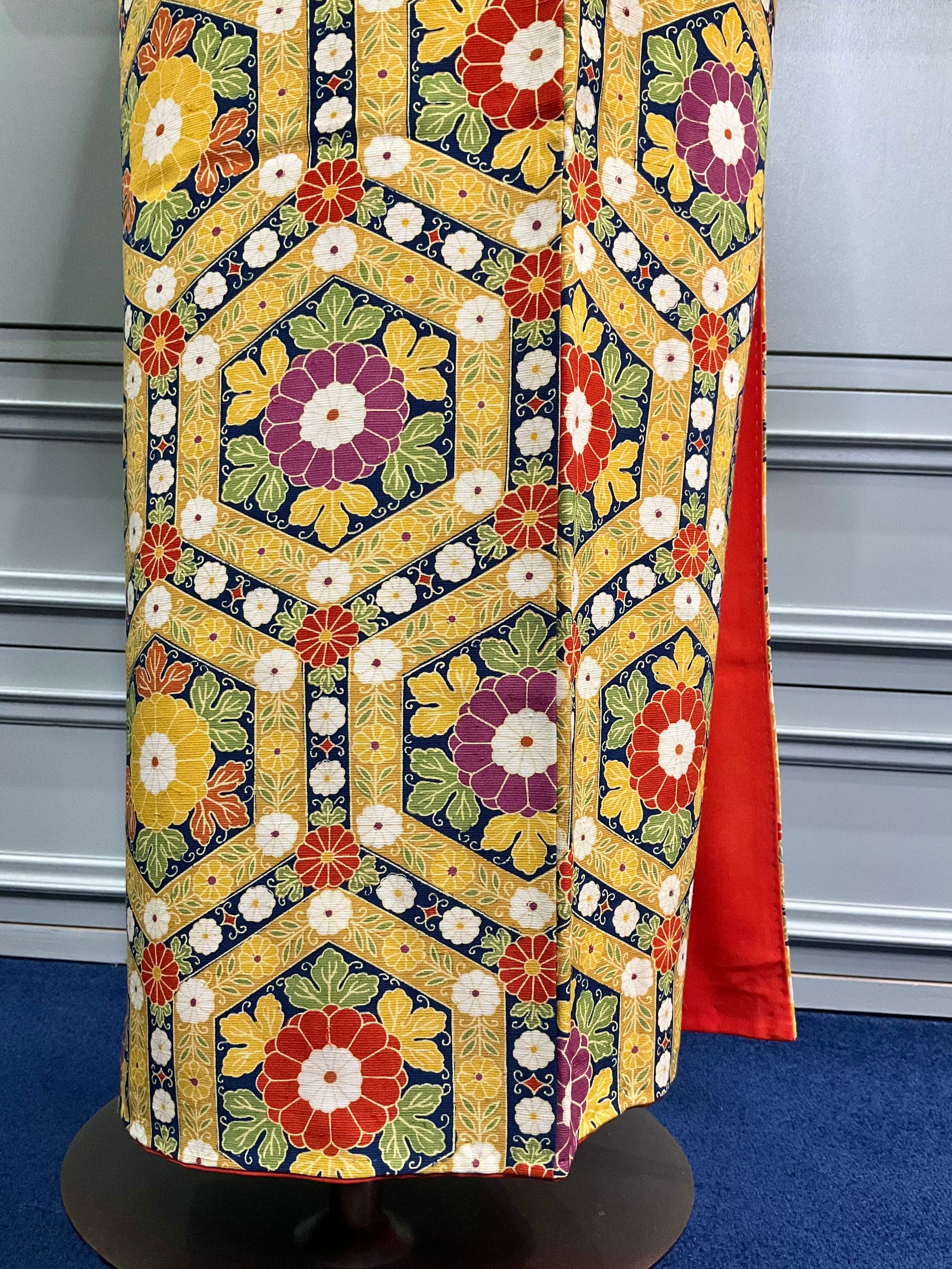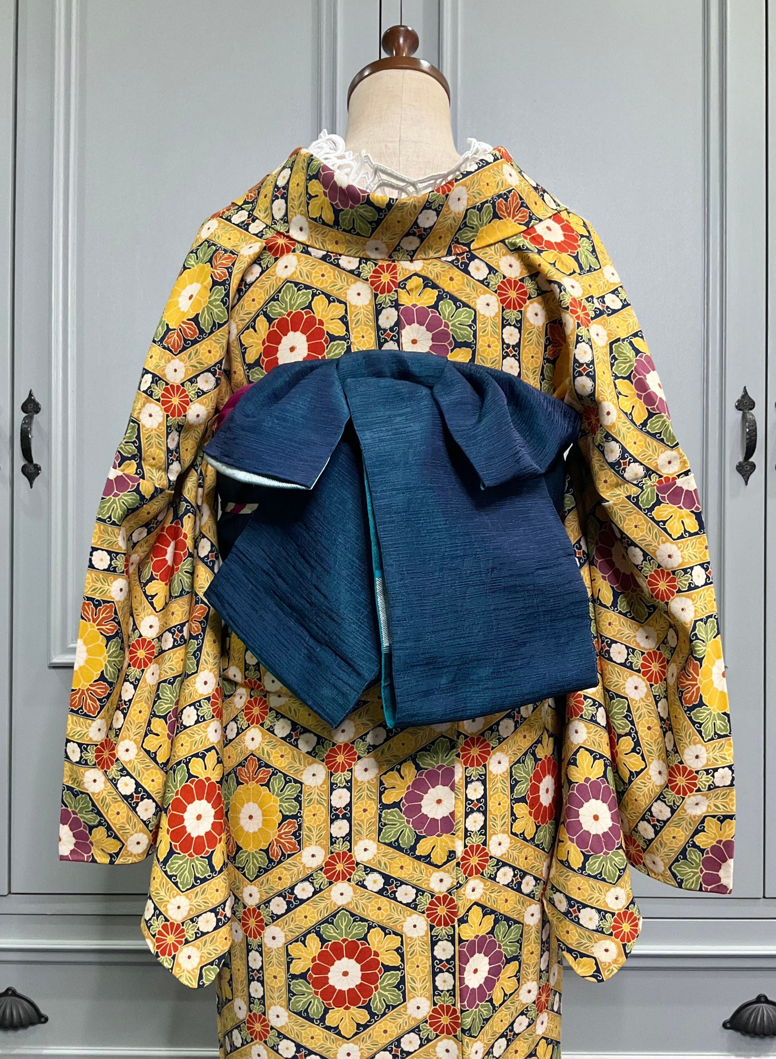 イエローとブルーの組み合わせで作られた亀甲模様に、抽象的な菊の花がデザインされていることで、どこかモダンな印象も感じられるこちらの1着。
