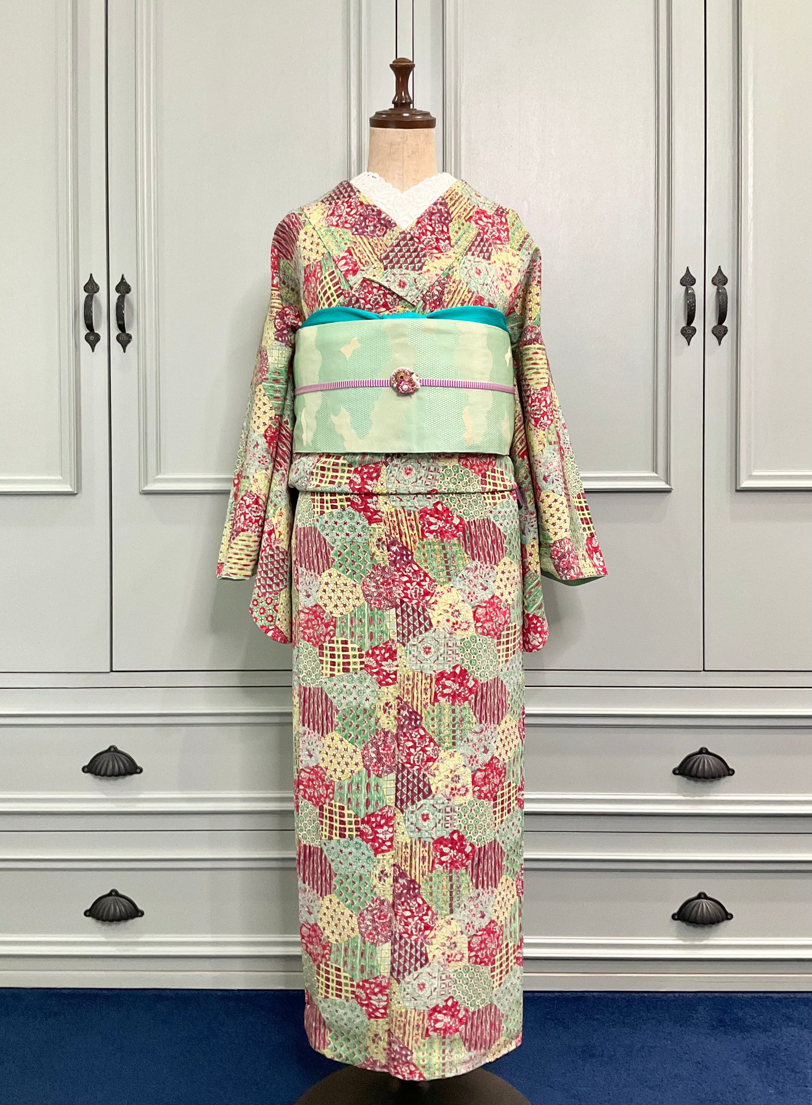 色とりどり、そして花模様や幾何学模様など、さまざまなデザインがオシャレなこちらのお着物。