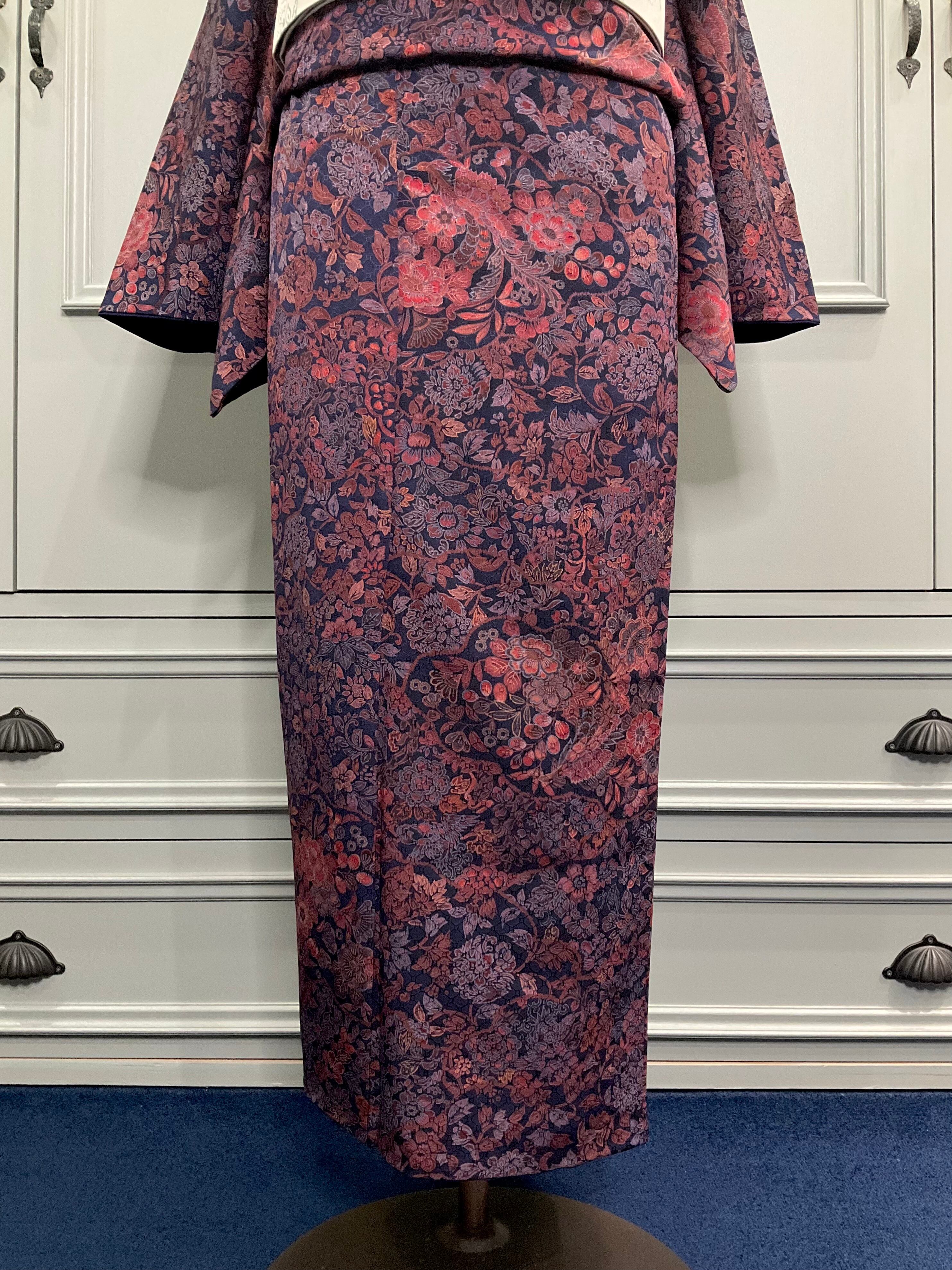 深いネイビーの地色に、花模様や鳥がデザインされた小紋着物です♪