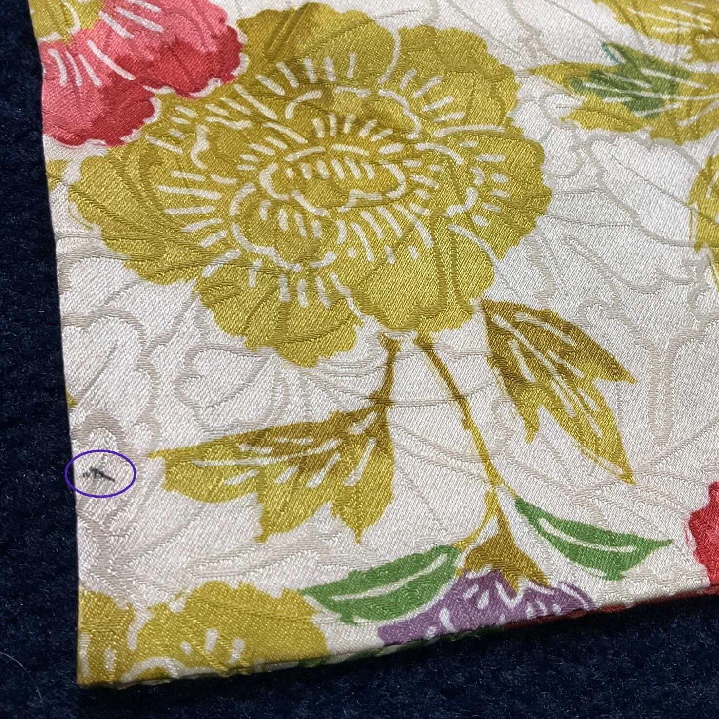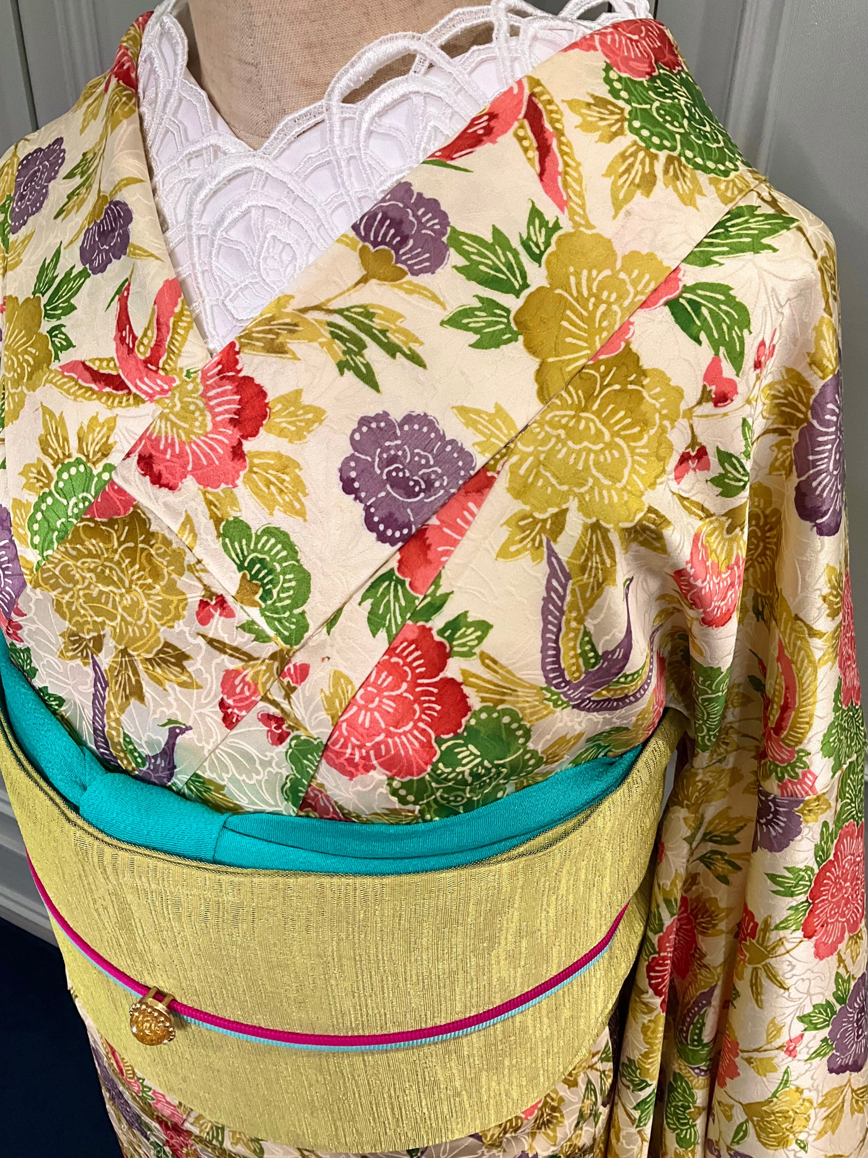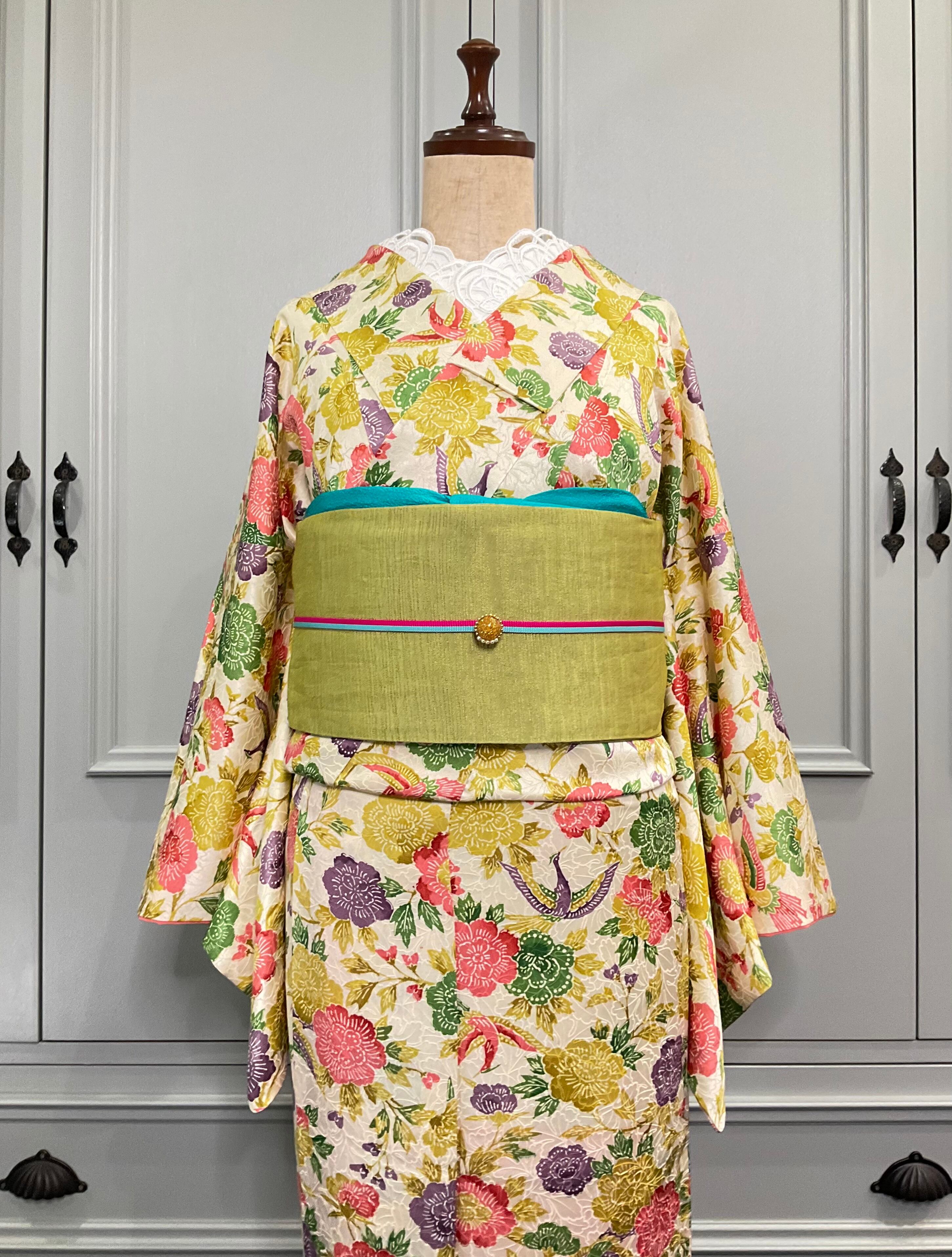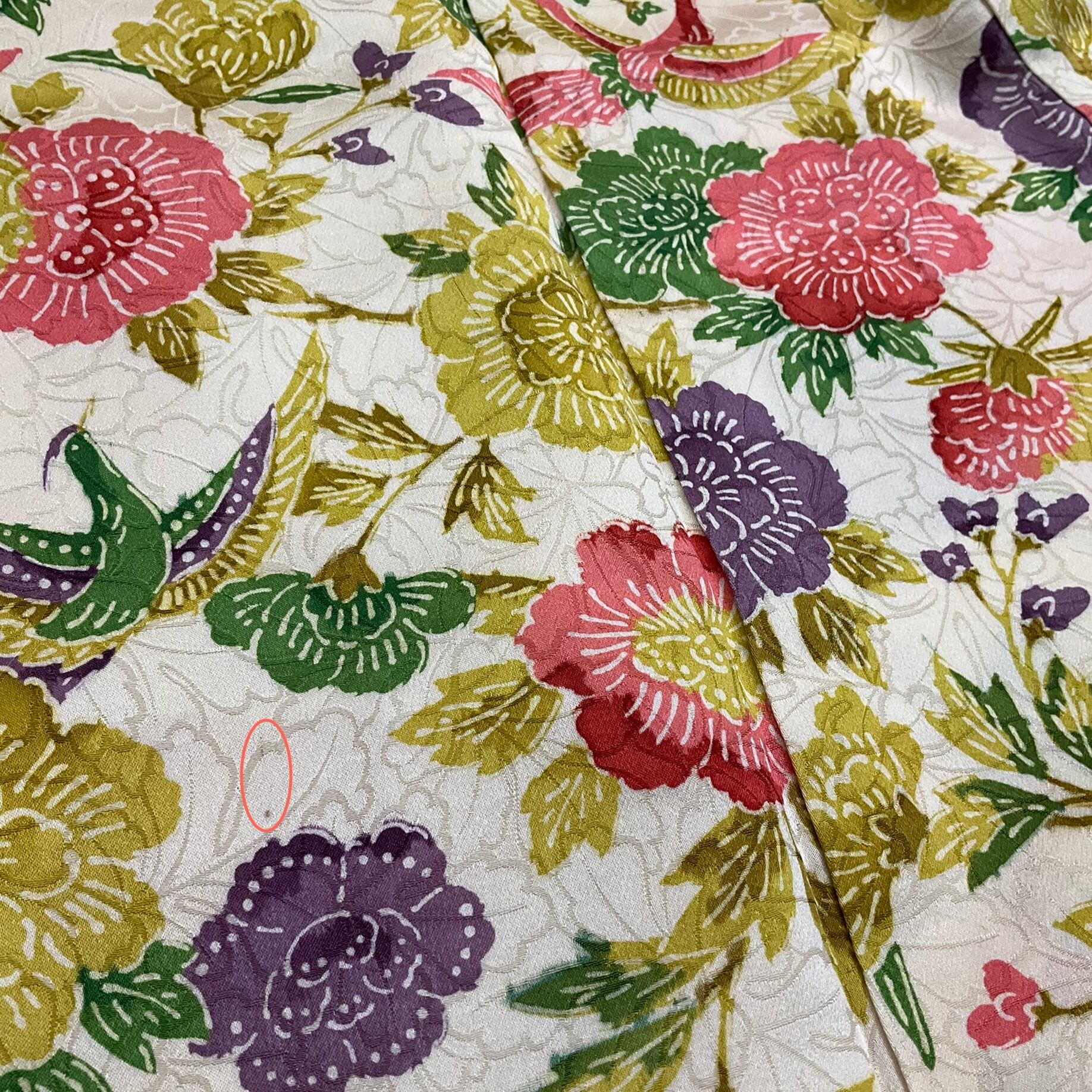 オフホワイト系の地色に、花模様と鳥がデザインされた小紋着物です♪