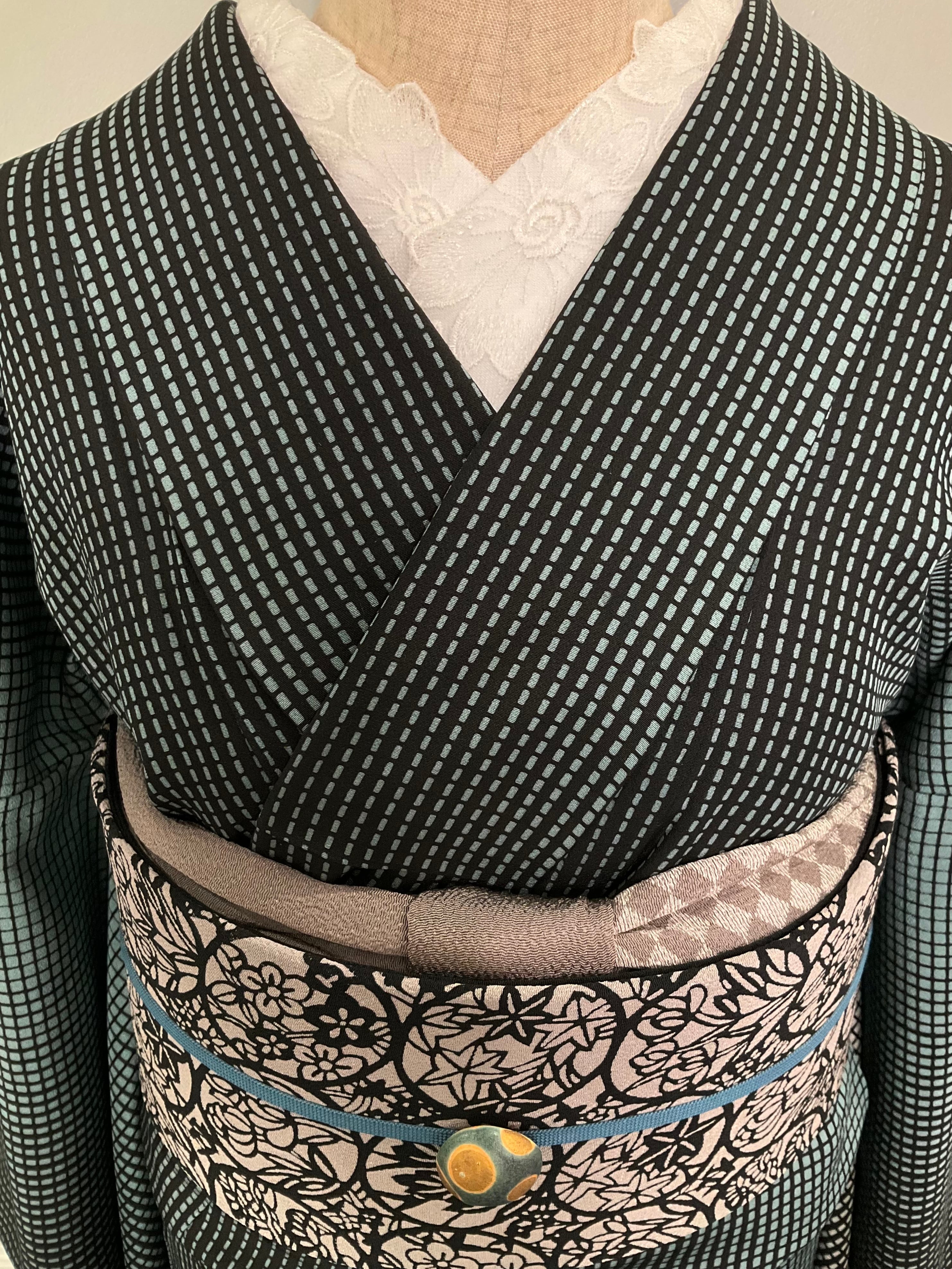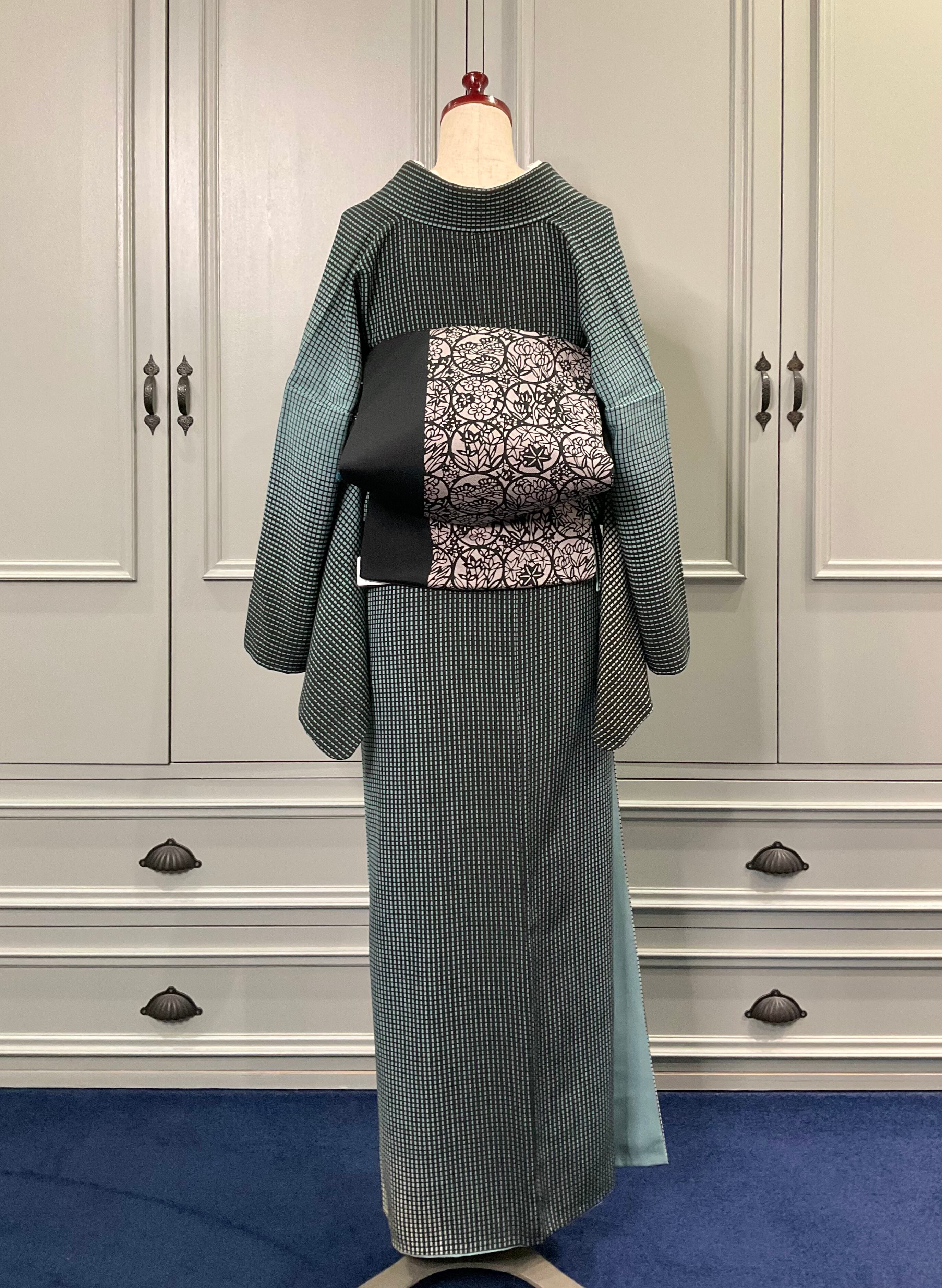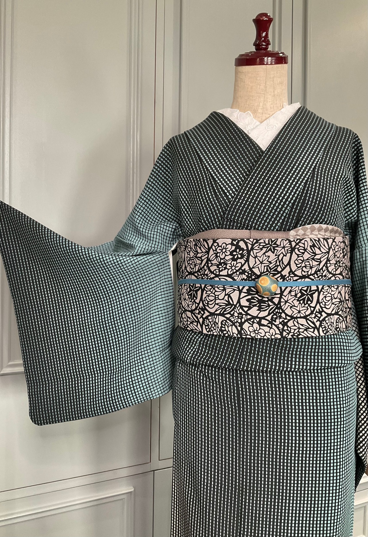 ブラック×ブルーグレー系のグラデーション×チェック柄の付け下げ着物です♪