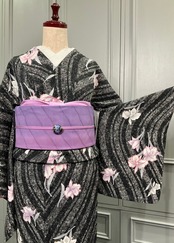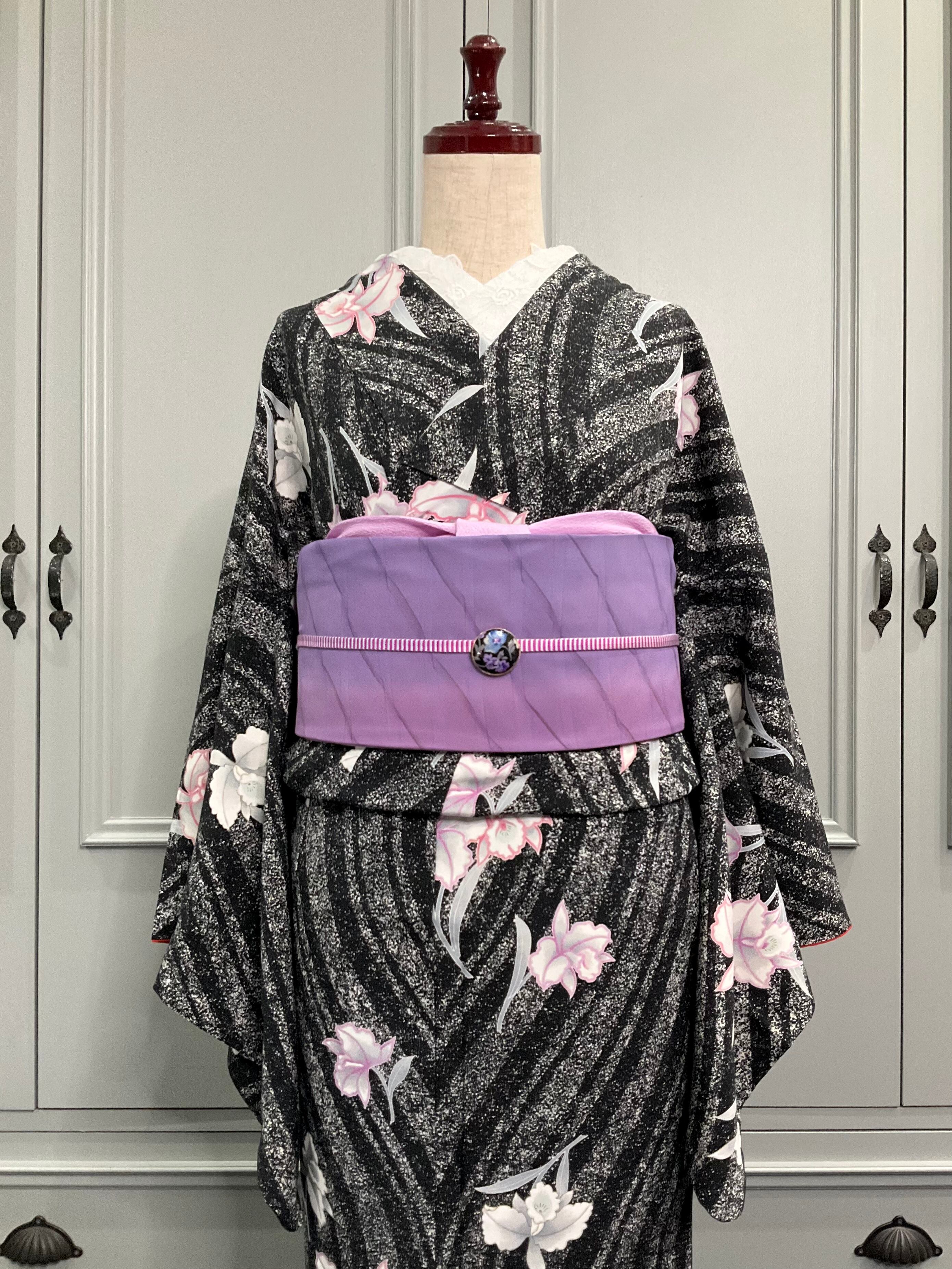 ブラック系の地色に、カトレアがデザインされた小紋着物です♪