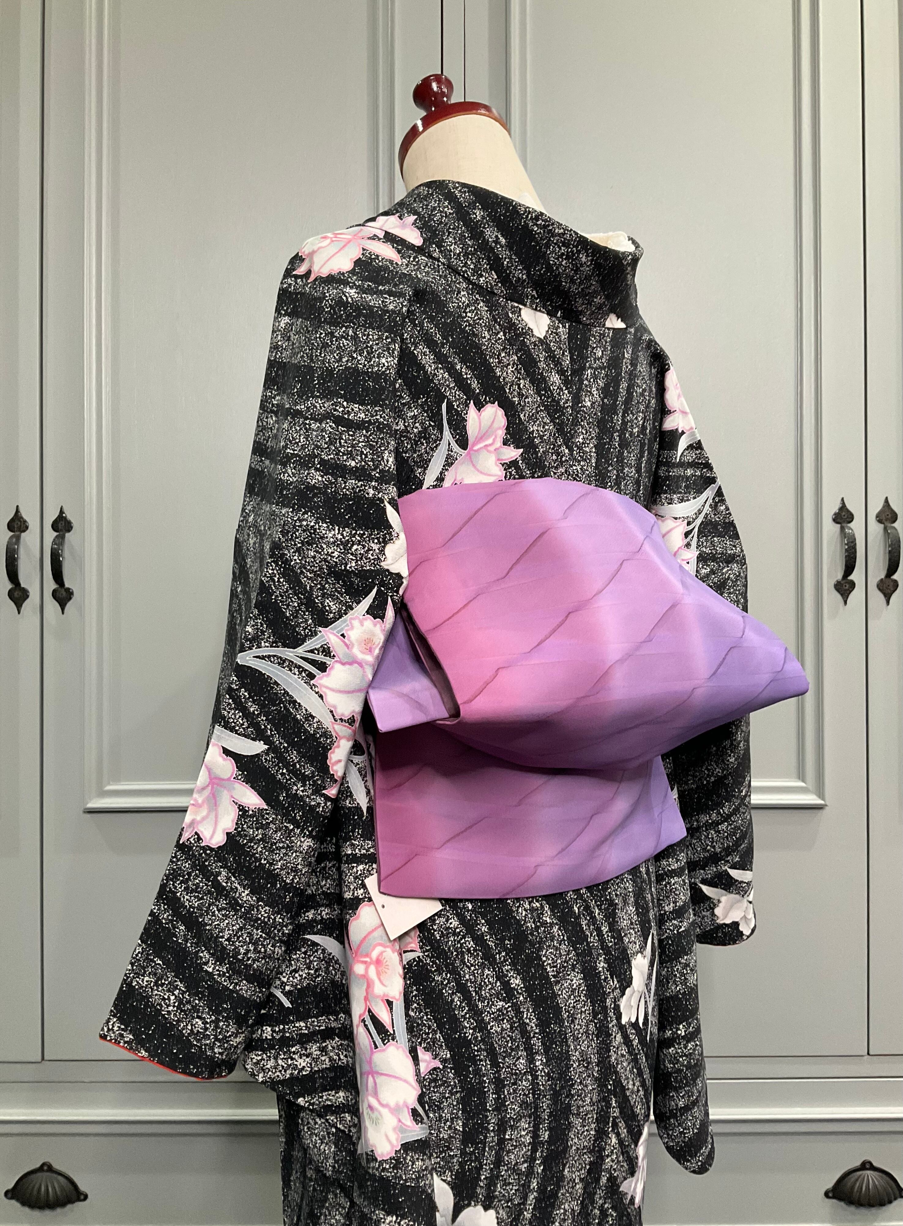こちらのデザインは、お太鼓部分を見ていただくとわかりやすいのですが、左側は赤みのあるパープル。