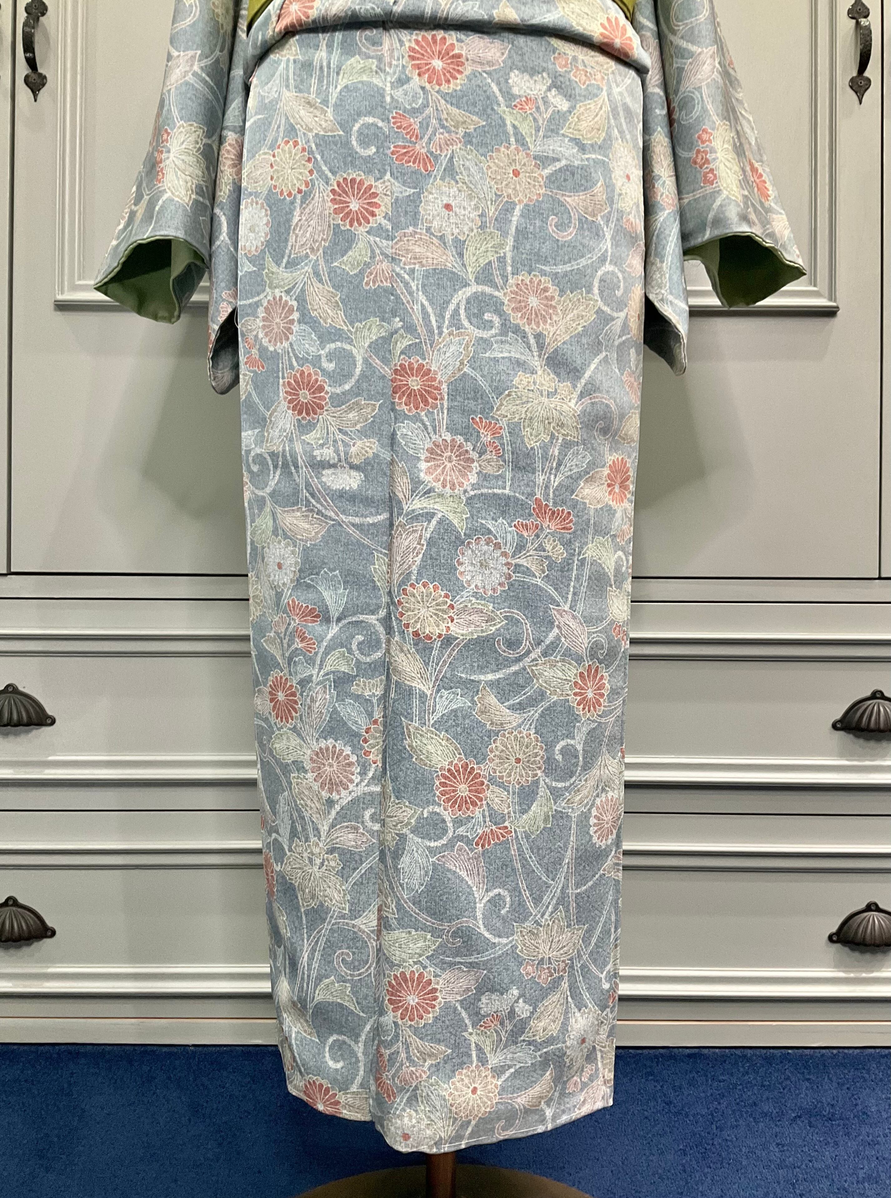 淡いブルーグレー系の地色に、花模様がデザインされた小紋着物です♪