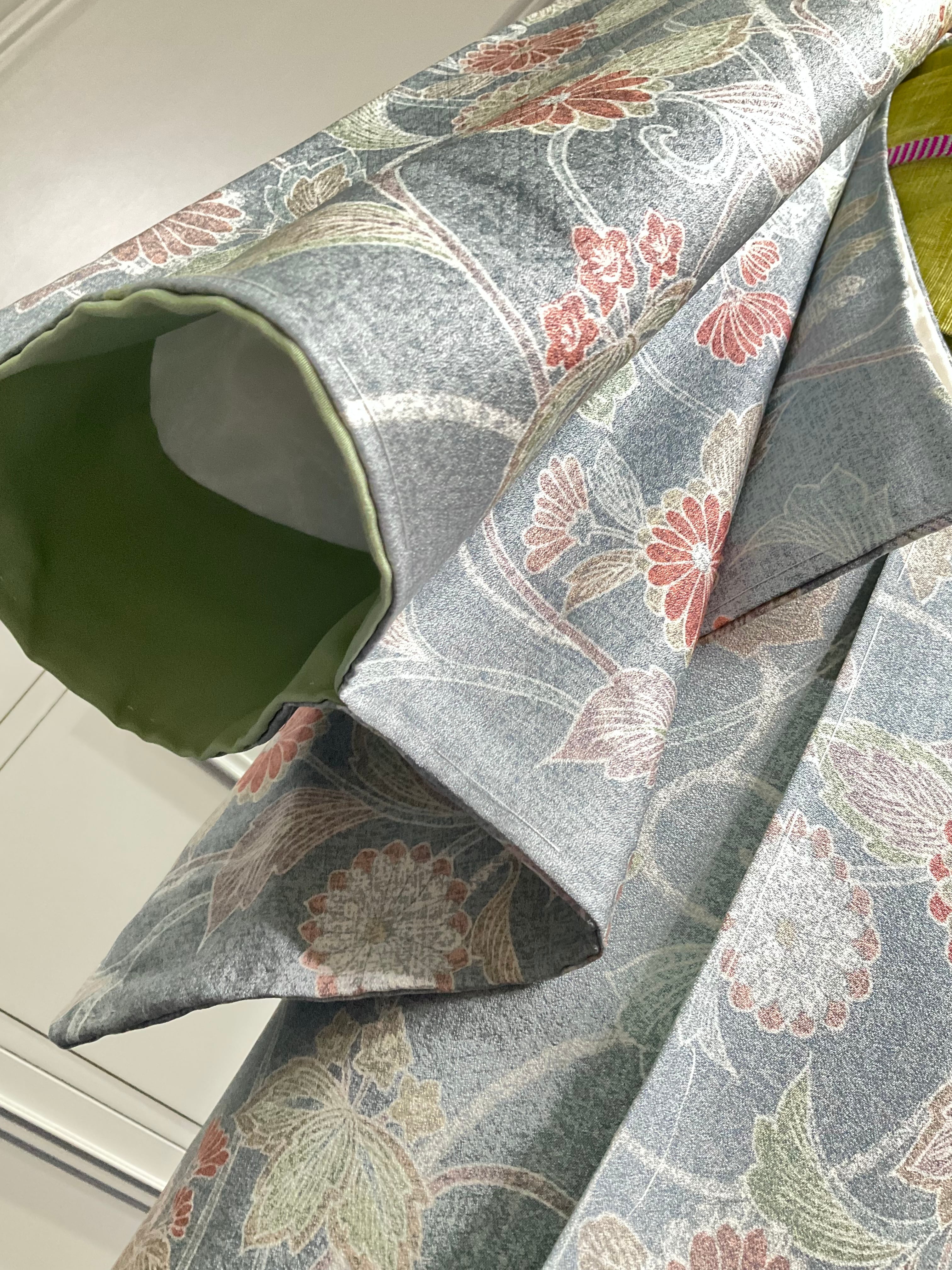 地色のブルーグレー系のお色味は、光の当たり具合によっては、グレーっぽくも見えますが、薄いデニムのブルーのような色合いに近いかと思います。