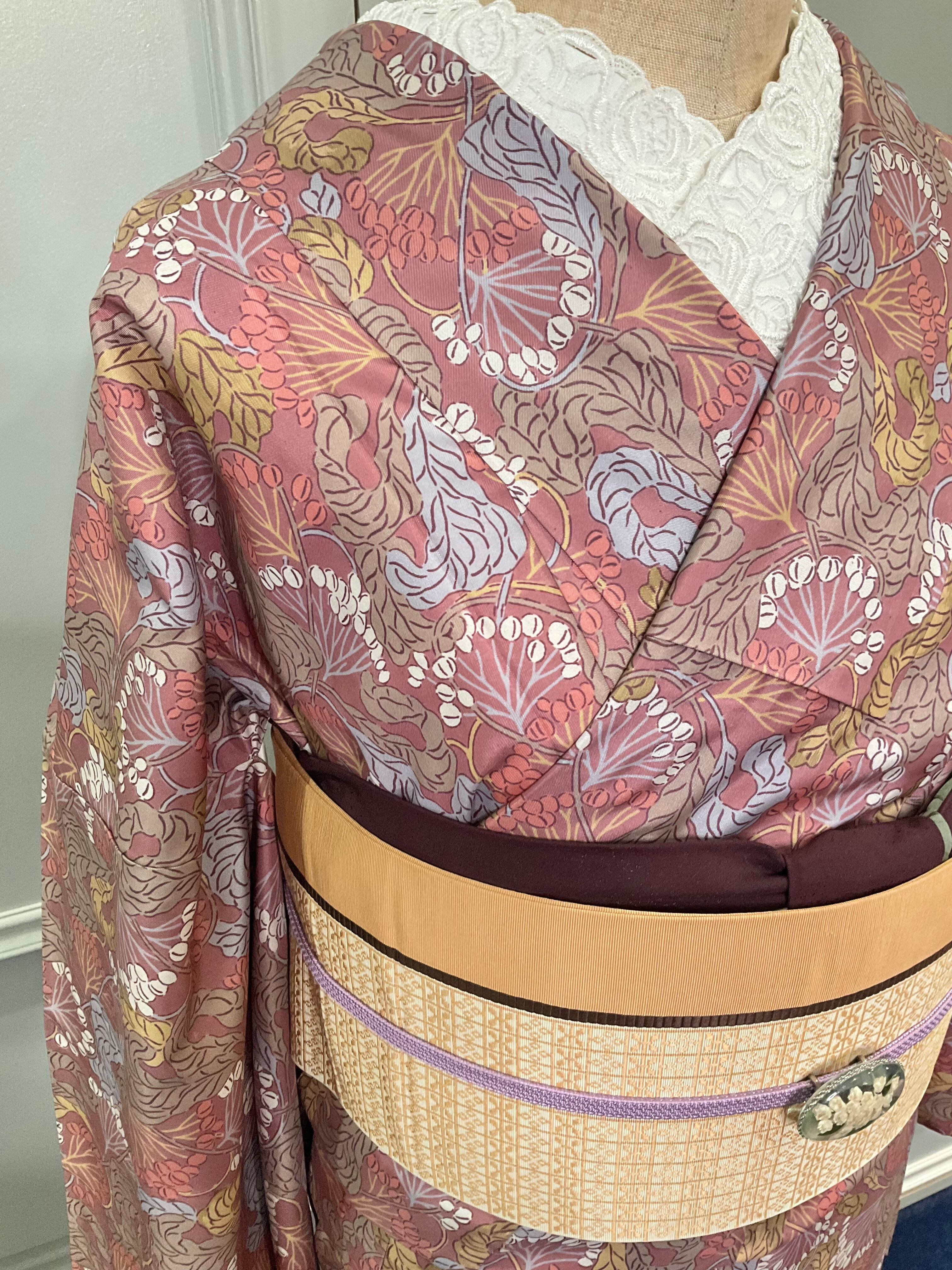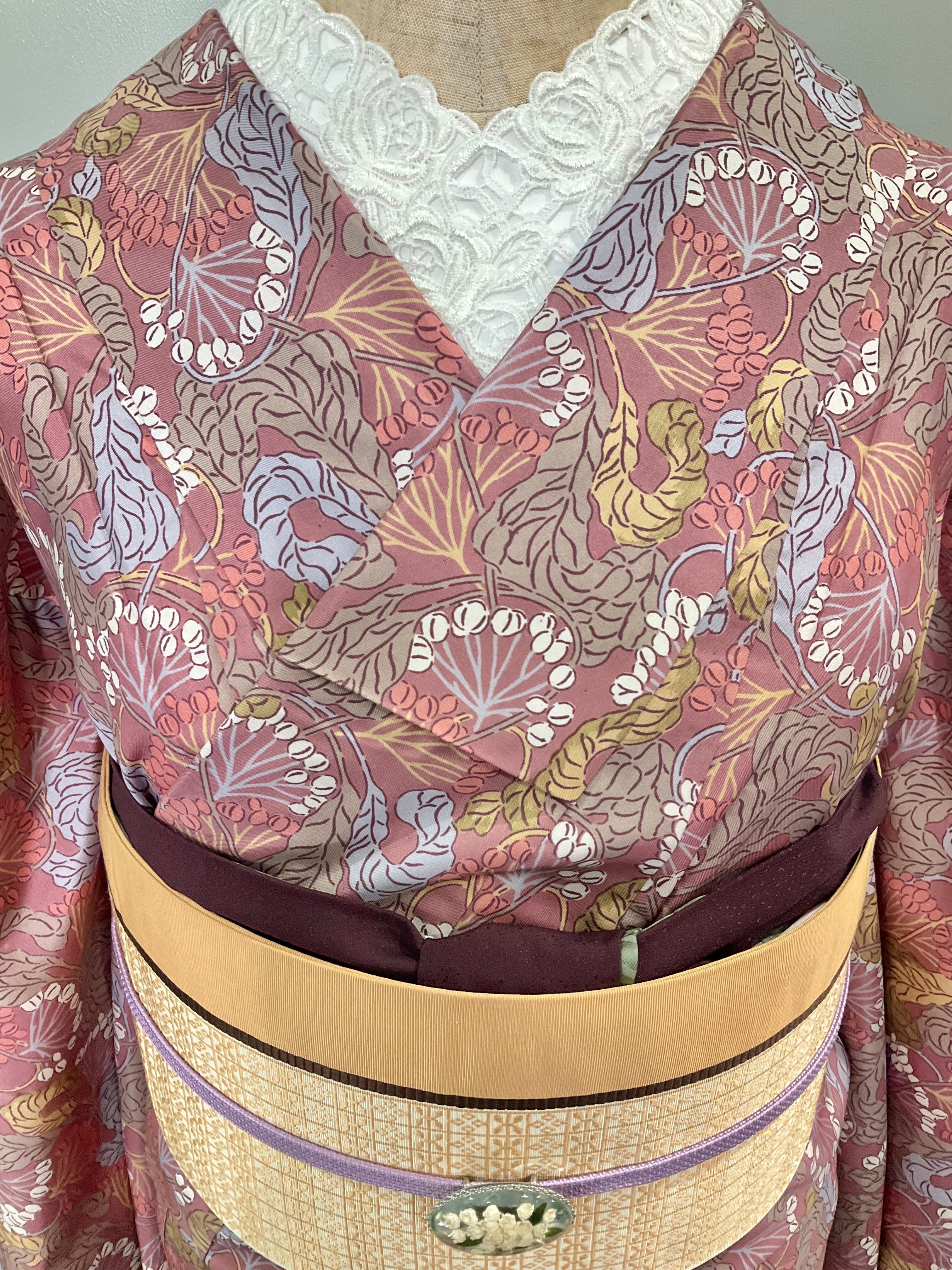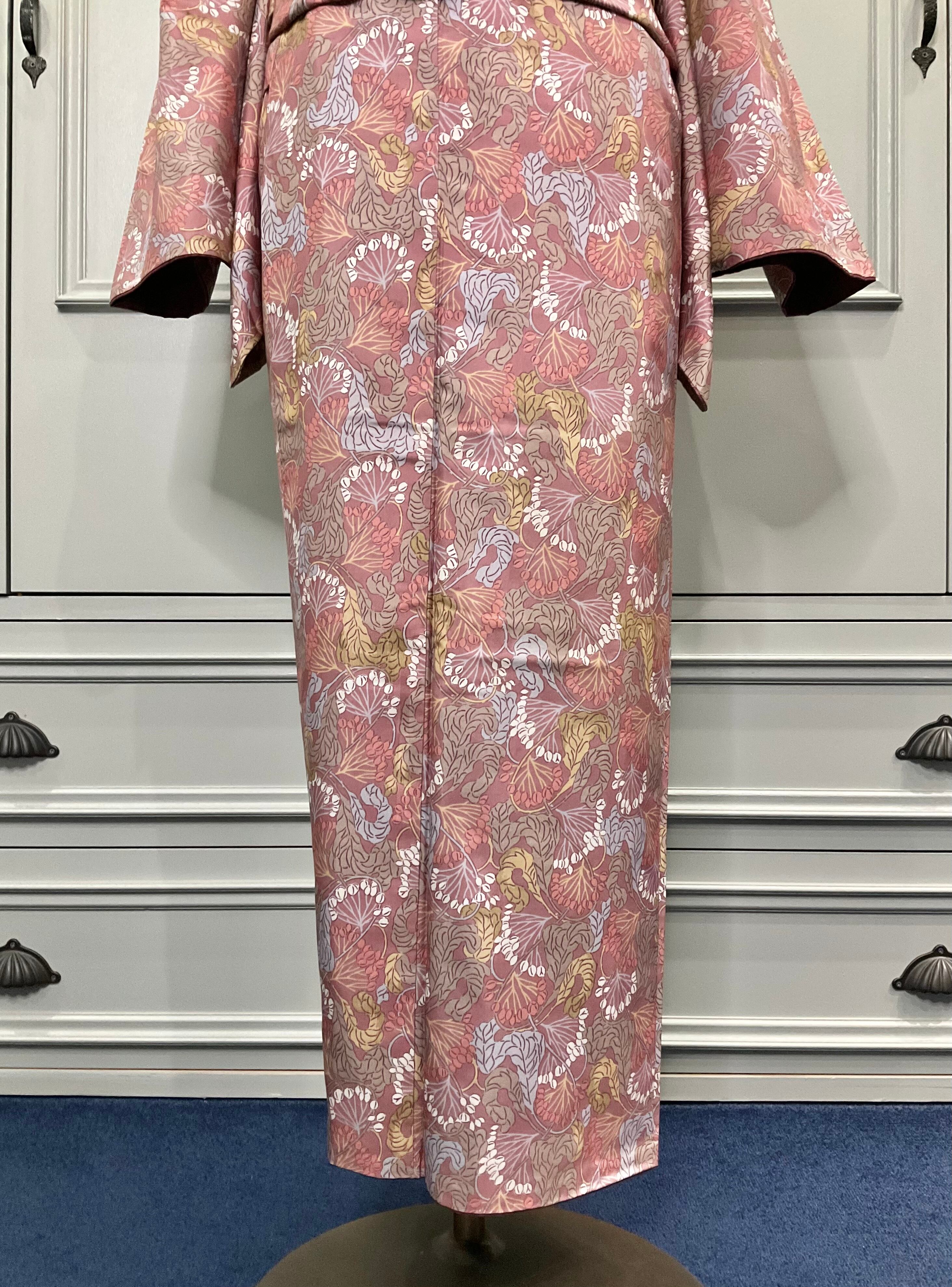 ロング・こっくりグレイッシュ・ピンク ボタニカル・テイスト*リサイクル小紋キモノ 0573