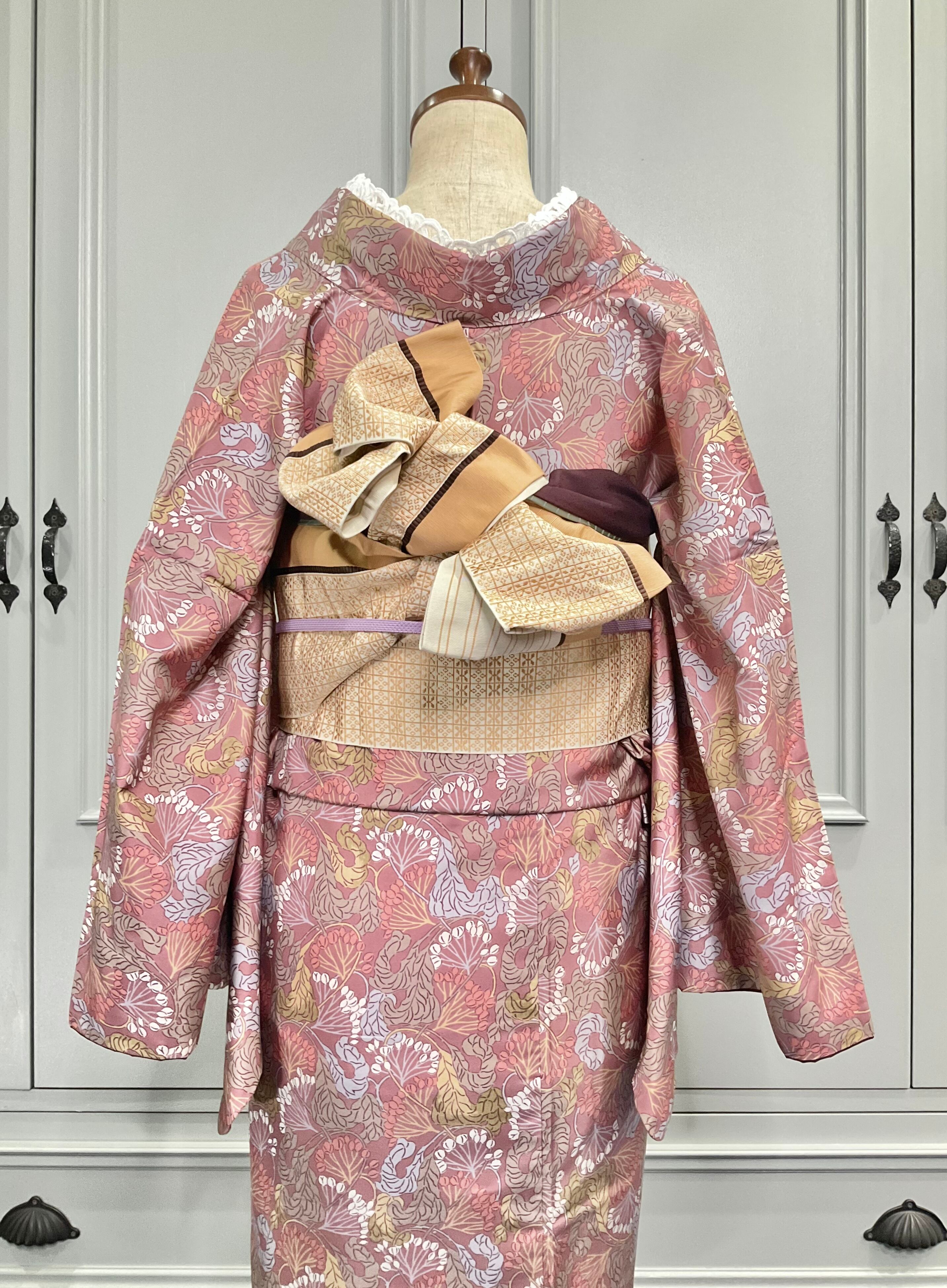 グレイッシュピンク系の地色に、花模様がデザインされた、小紋着物です♪