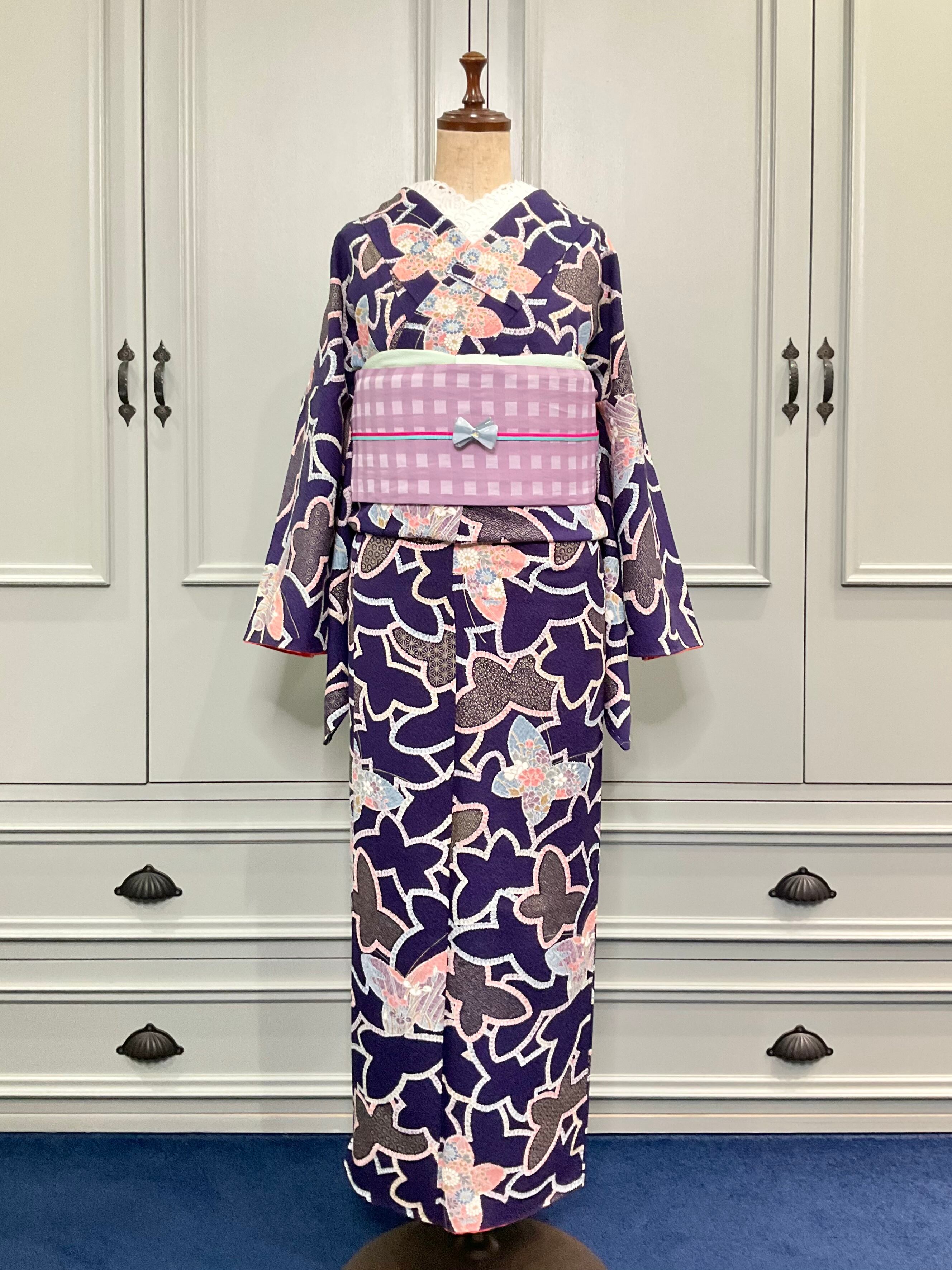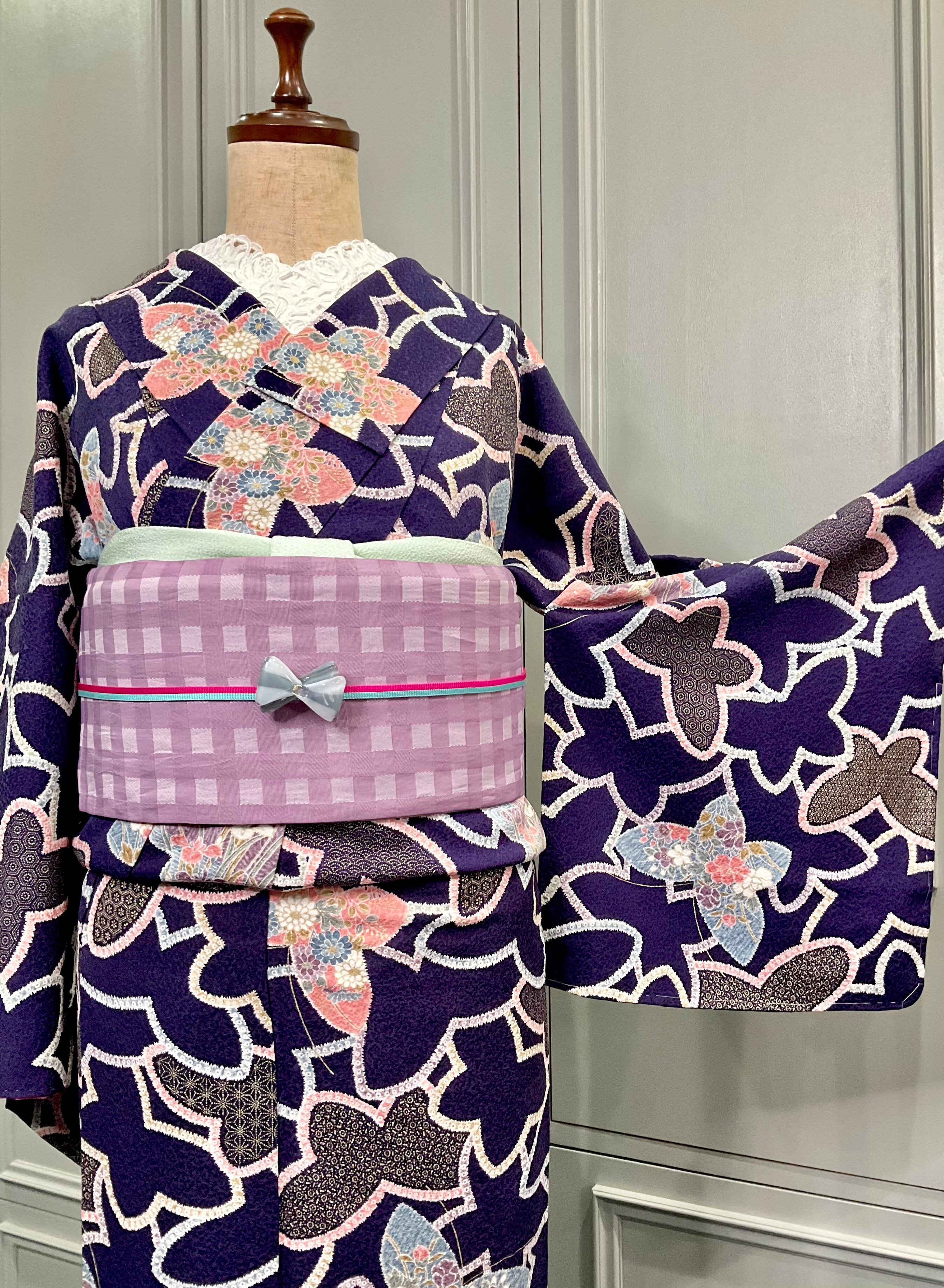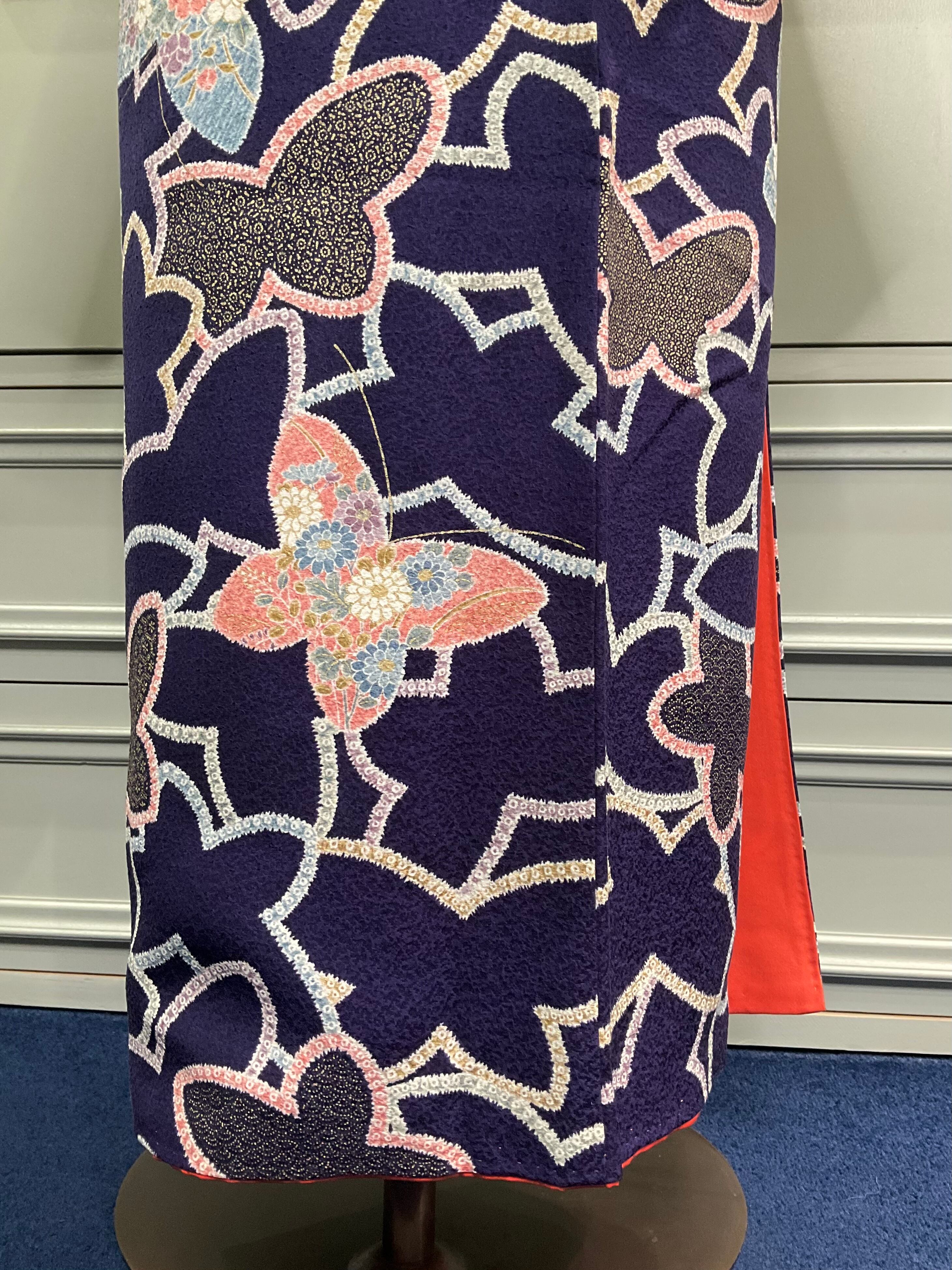 ロング*パープル・ネイビー 花蝶の舞*リサイクル小紋キモノ 0574