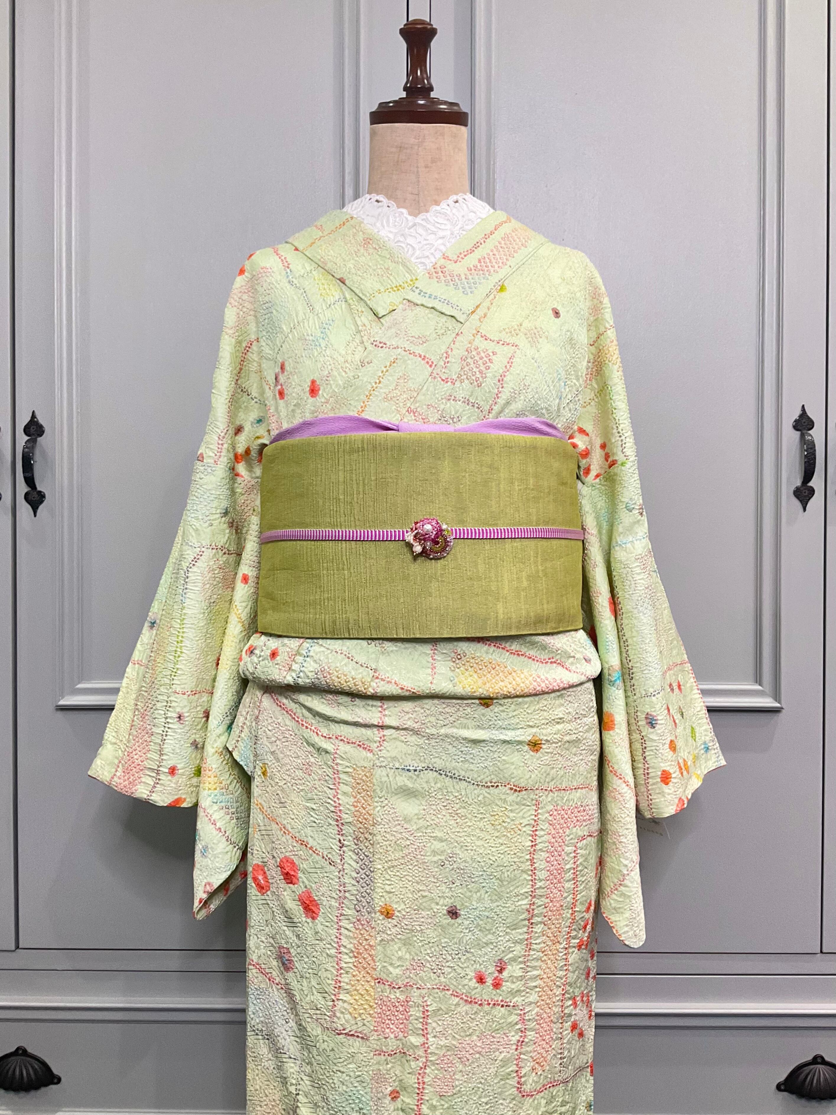 ペール・ピスタチオ・グリーン にじいろクレヨン*リサイクル小紋キモノ 0575