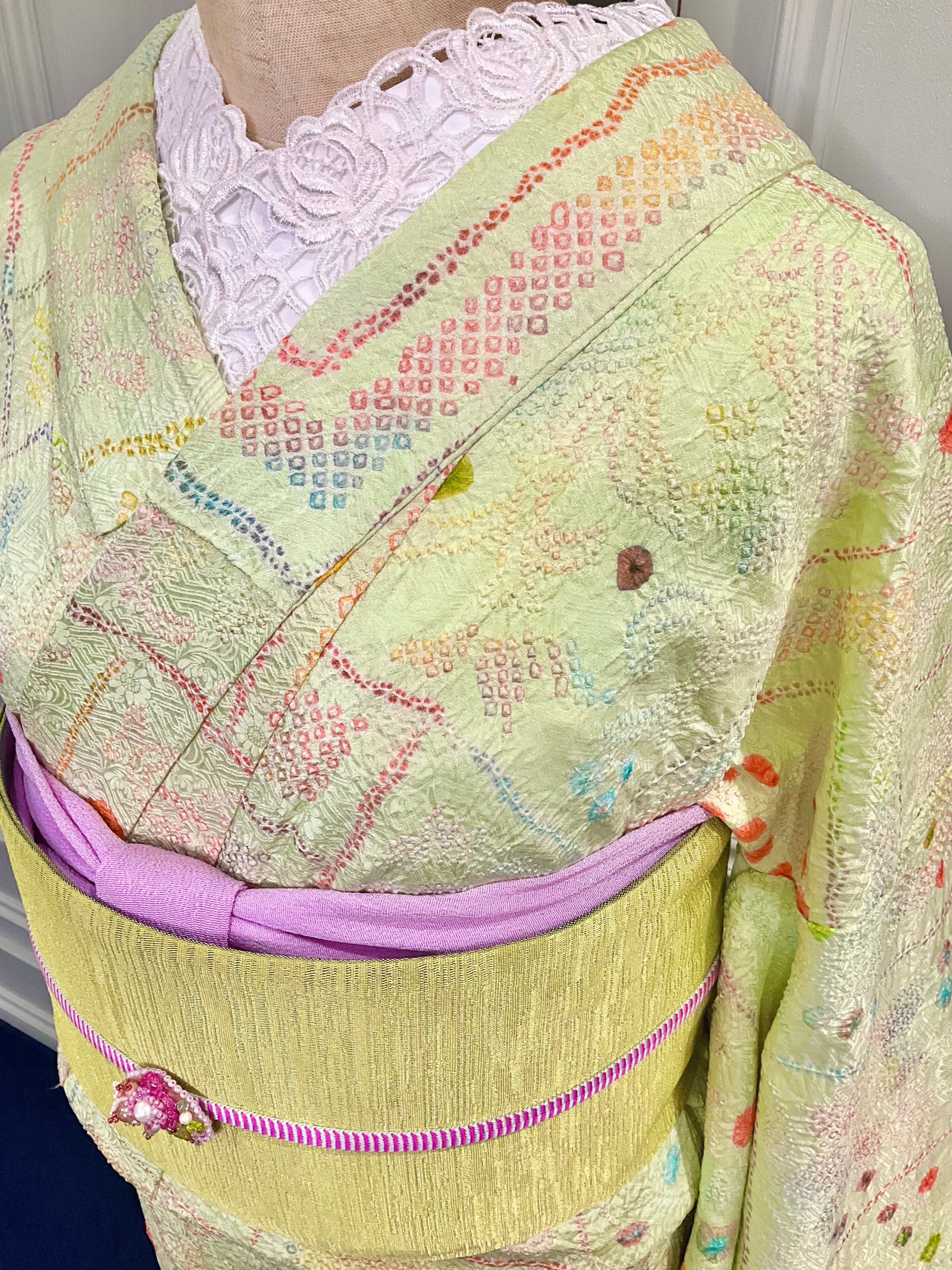 淡いグリーン系の地色に、カラフルな色合いの絞り模様がデザインされた小紋着物です♪