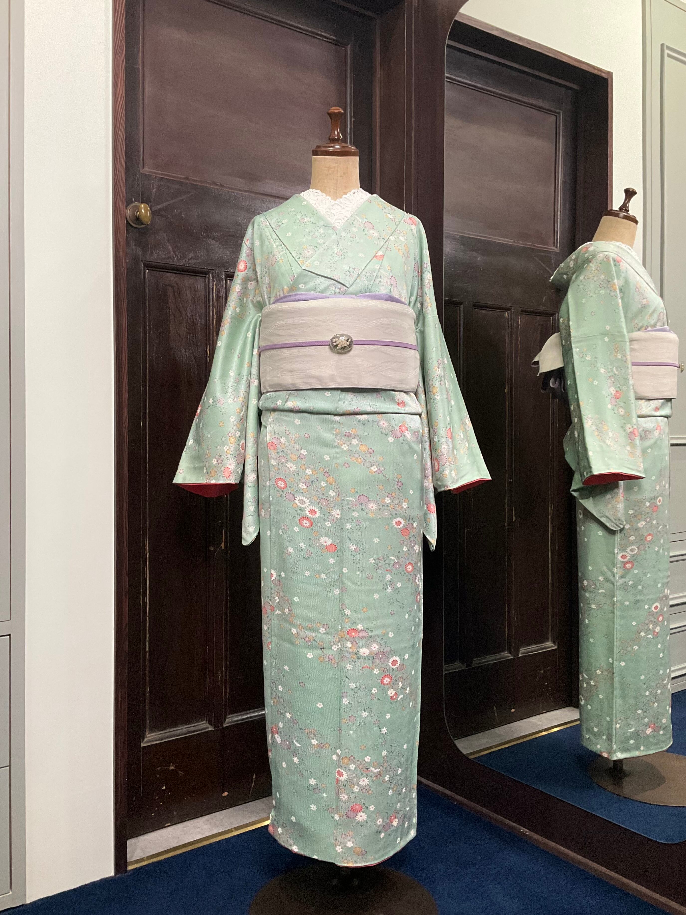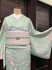 淡いグリーン系の地色に、花模様がデザインされた小紋着物です♪