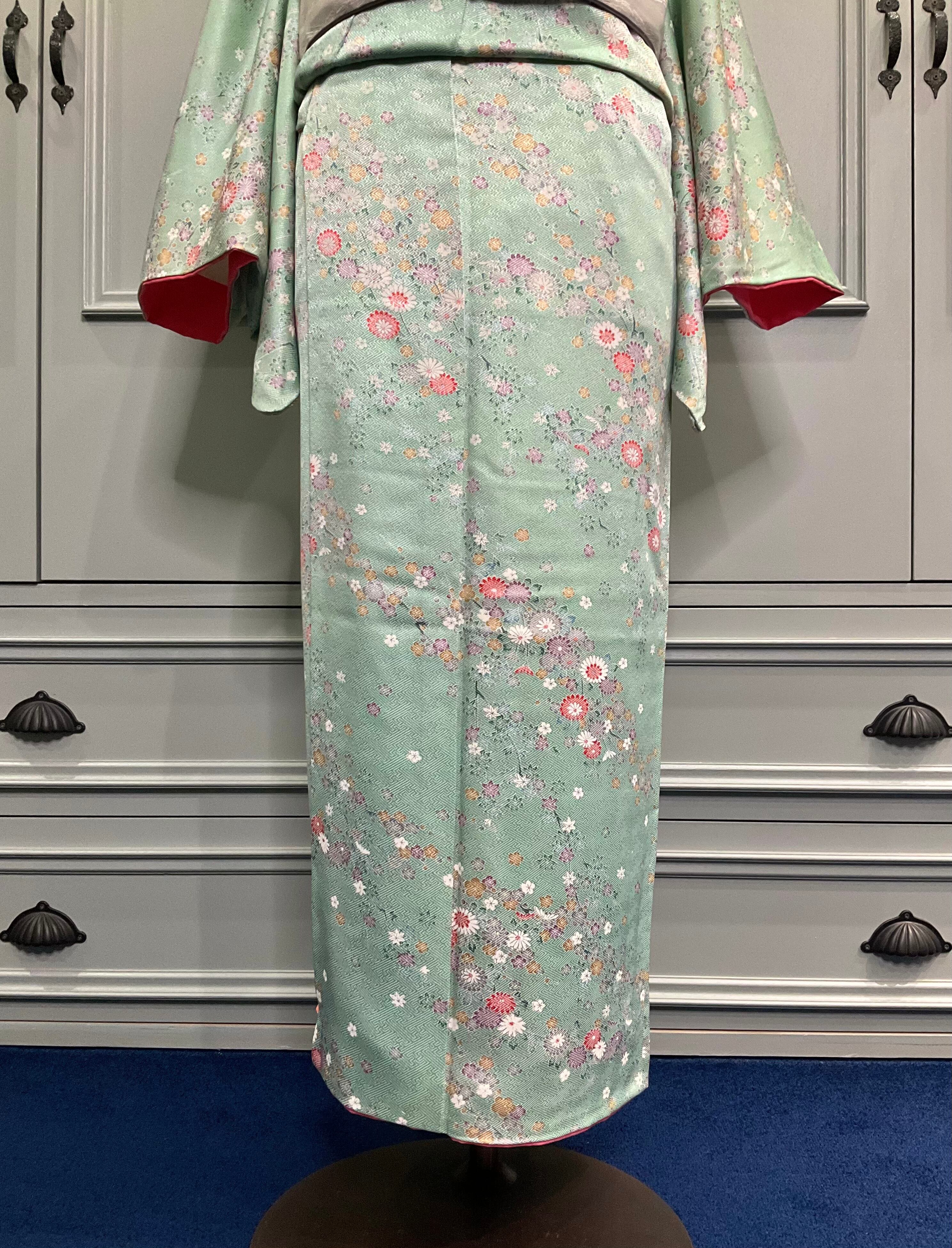 ロング*オパール・グリーン 花々に集う*リサイクル小紋キモノ 0576