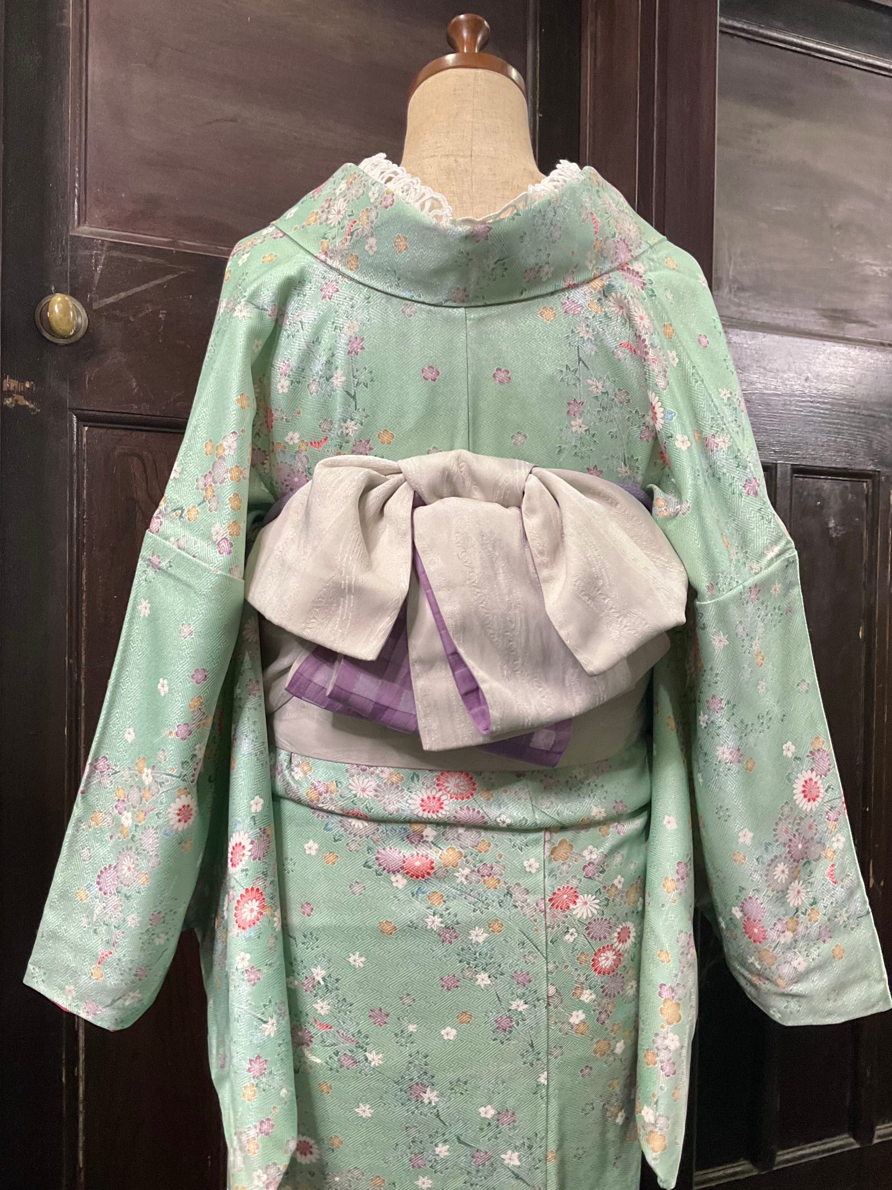 こちらのお着物、地色のグリーン系がとても綺麗ですよね^^