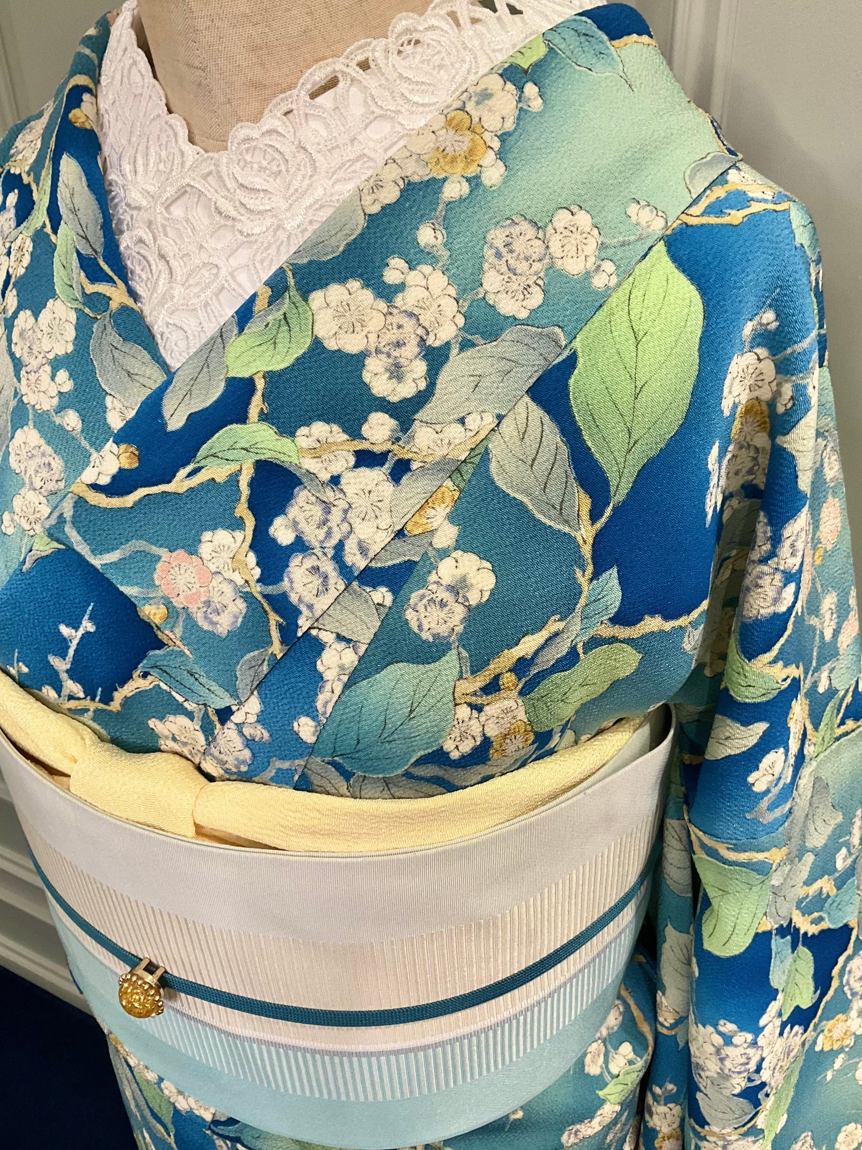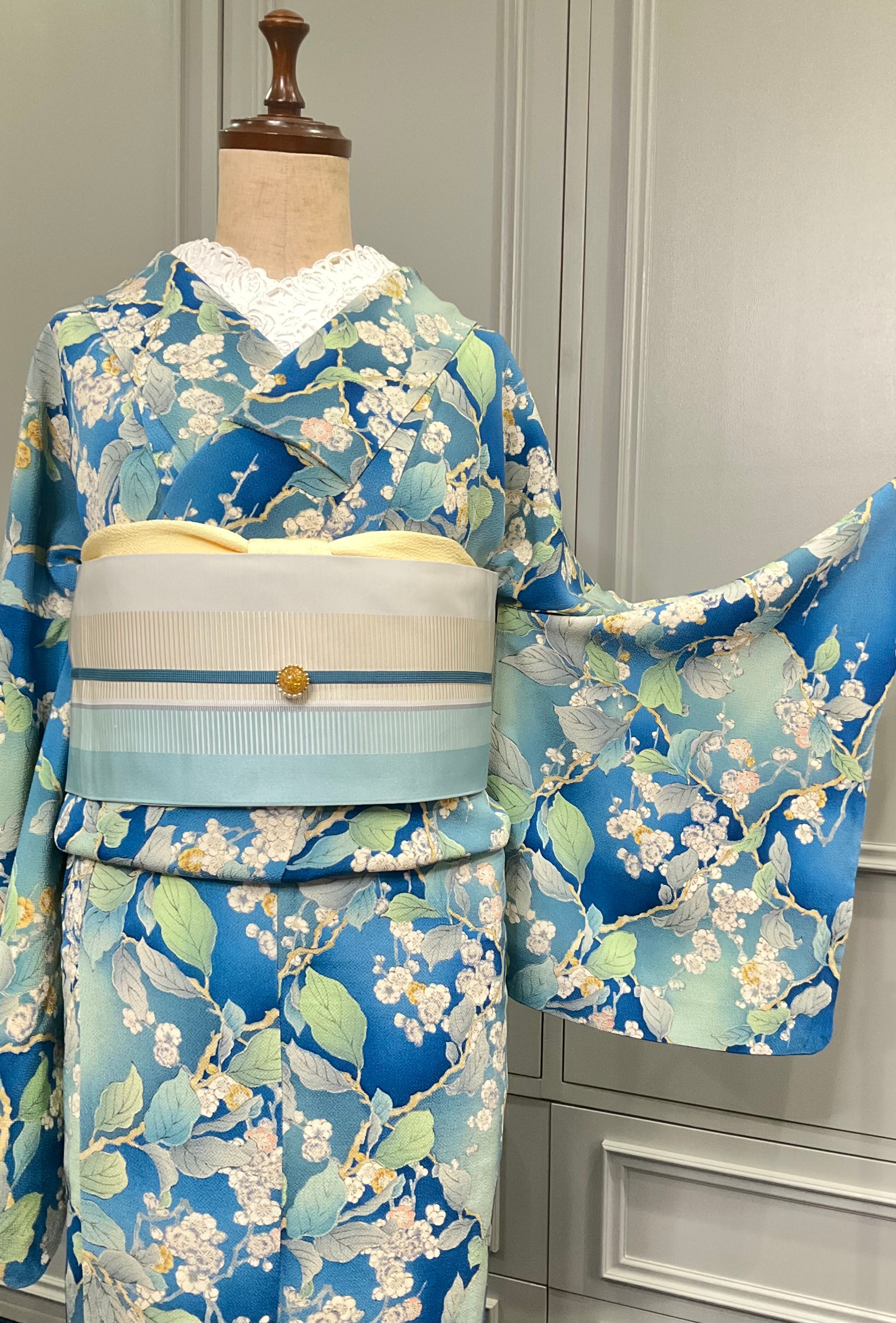 明るいブルーのグラデーションに、花模様がデザインされた小紋着物です♪