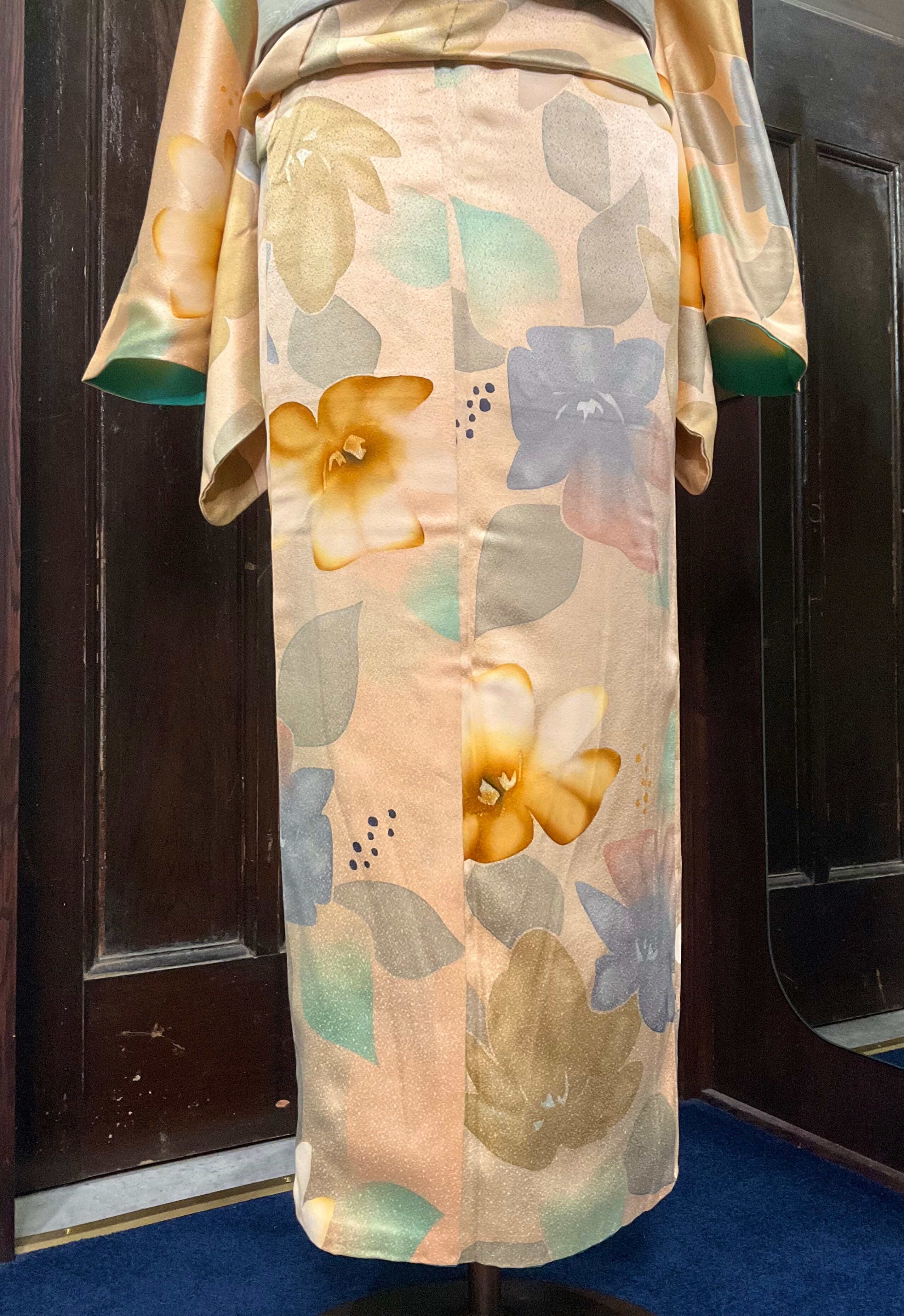 淡いオレンジ系の地色に、大きな花模様がデザインされた小紋着物です♪