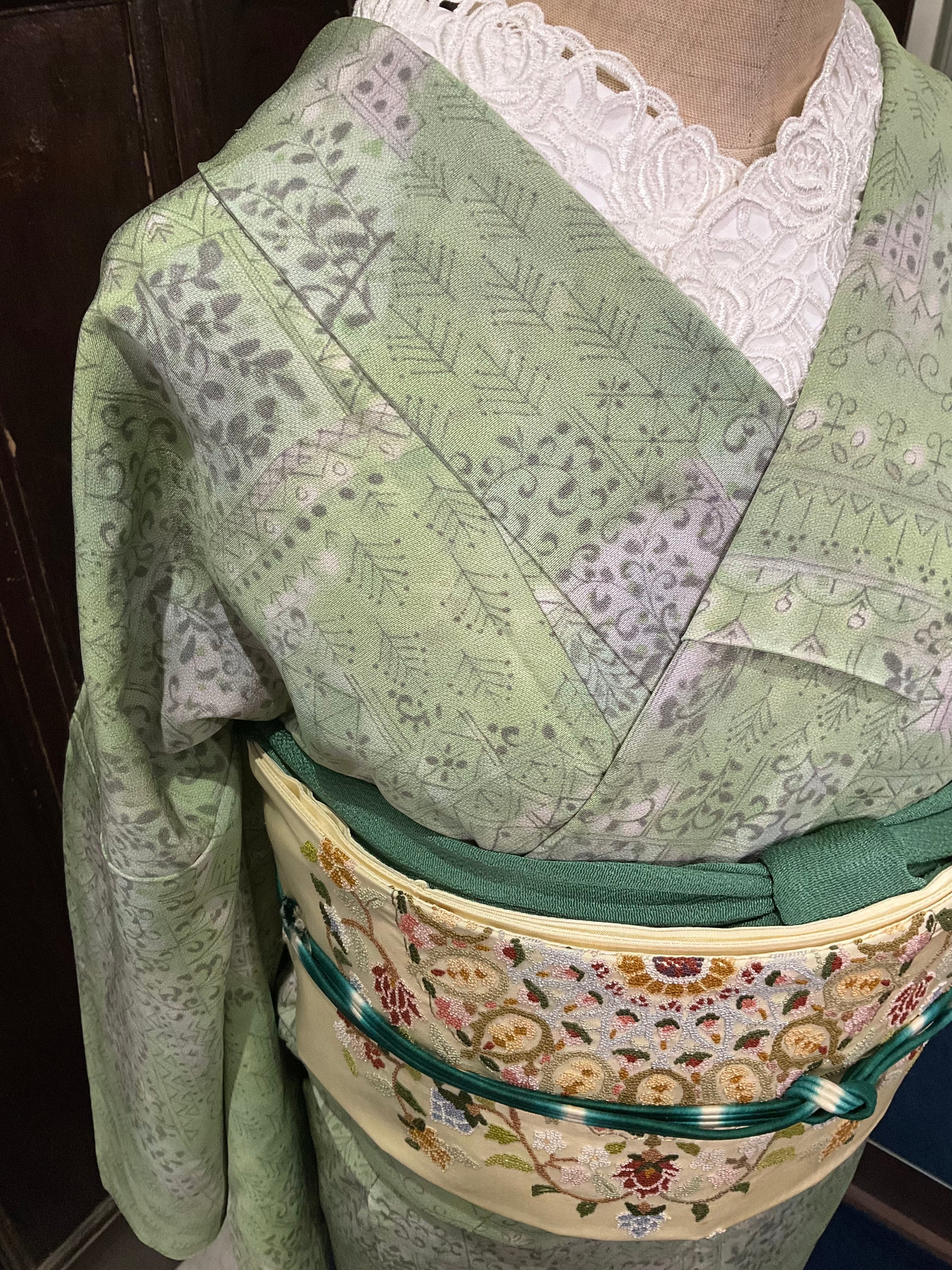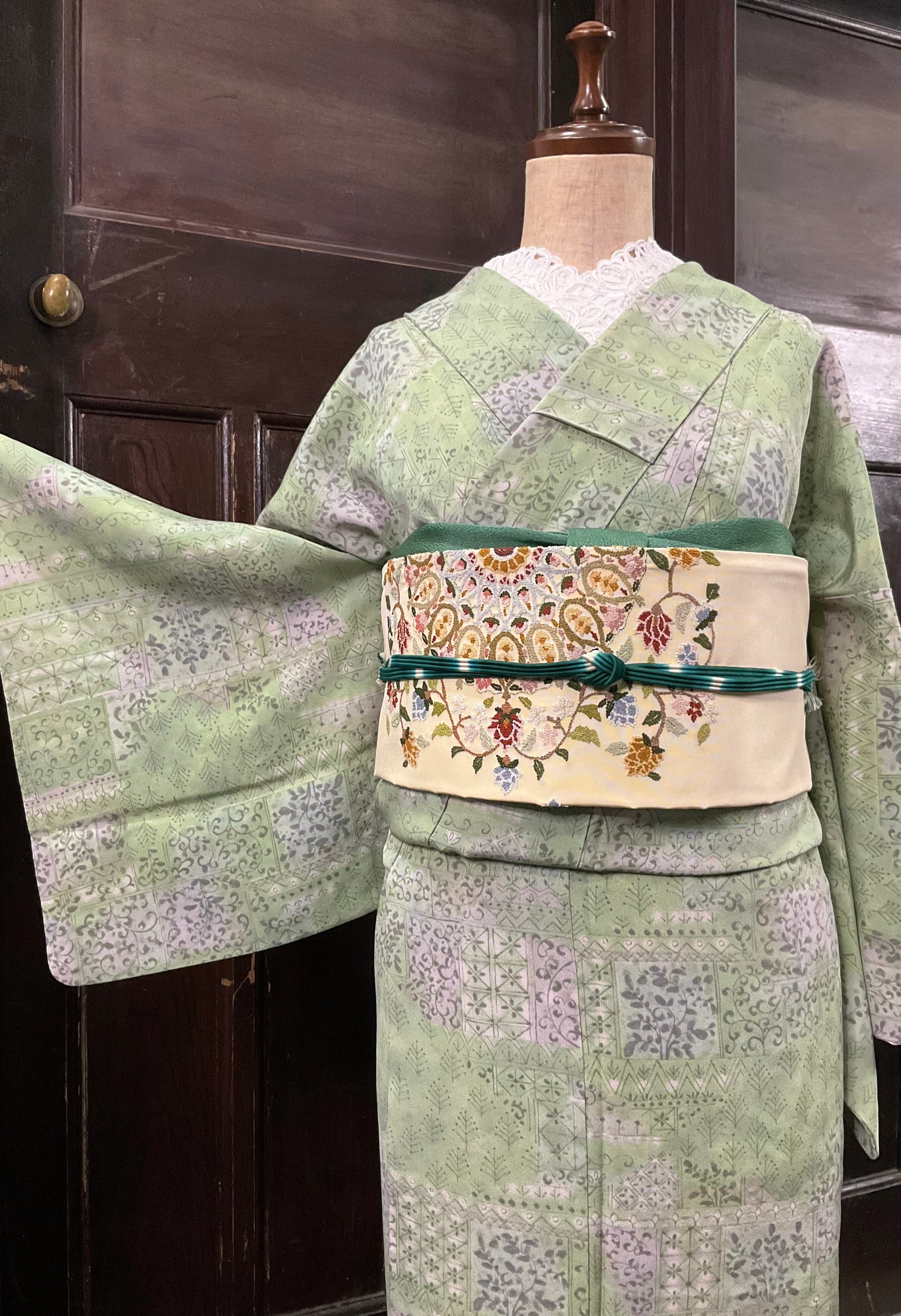 淡いグリーンの地色に、モダンなデザインが素敵な小紋着物です♪