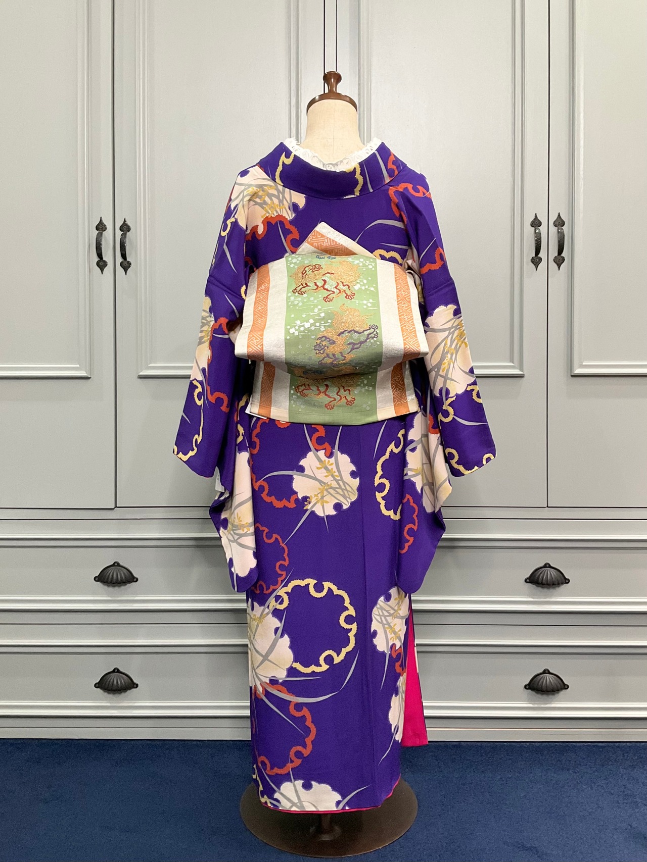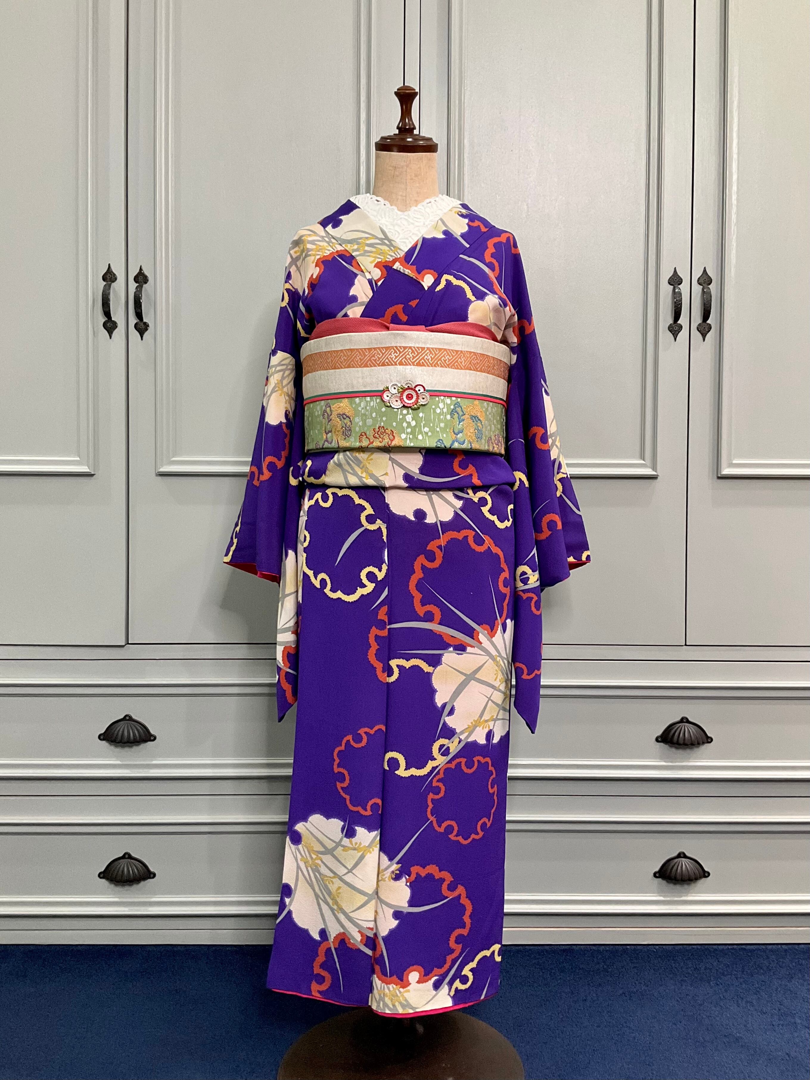 身丈長め*今紫色 雪輪文様×春蘭*アンティークキモノ 0585