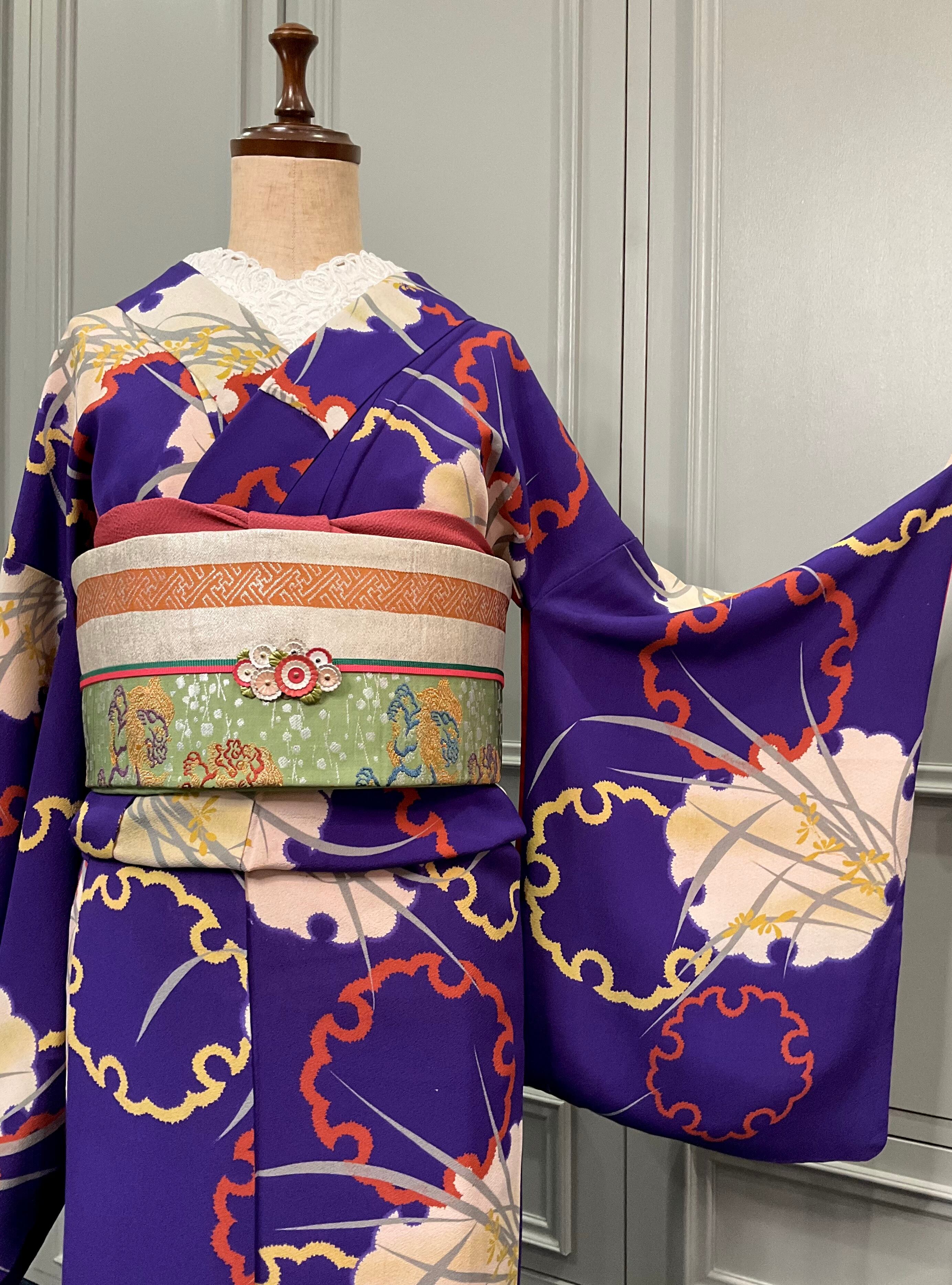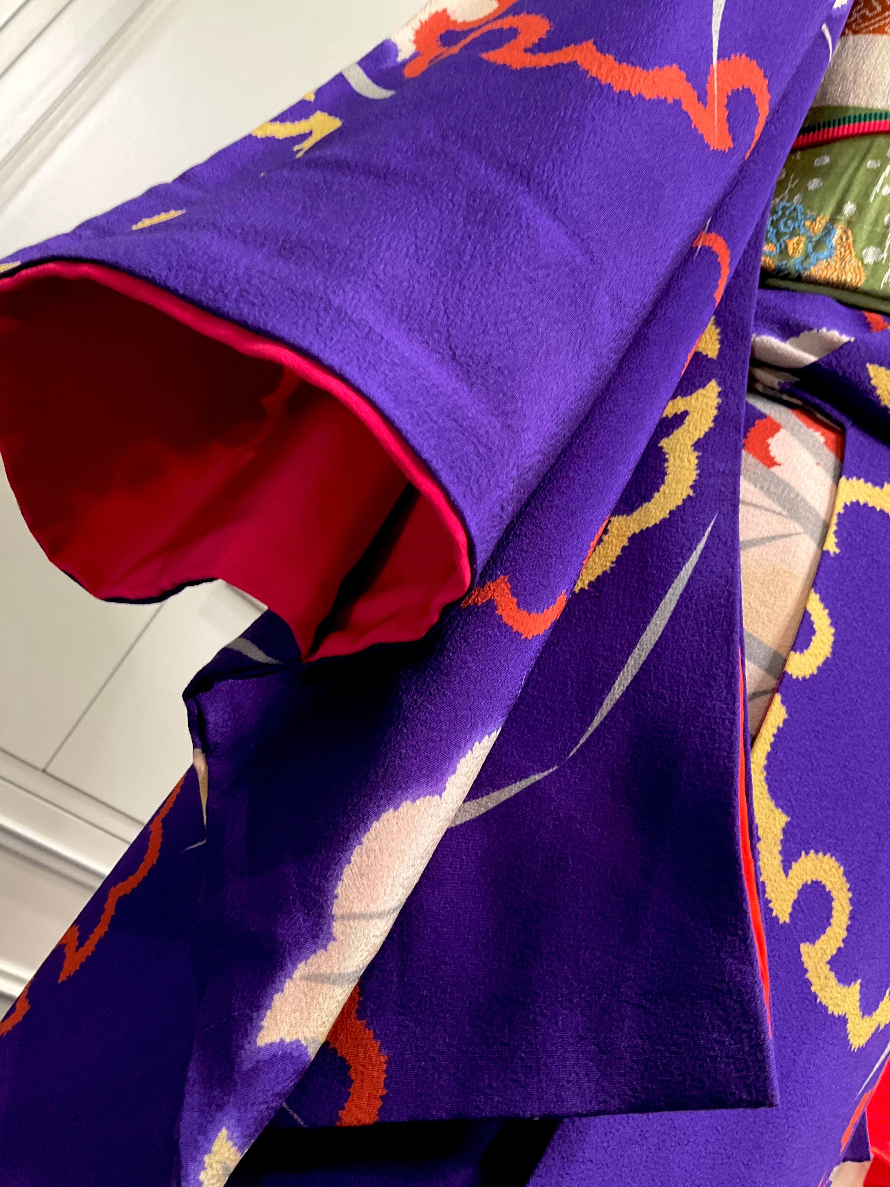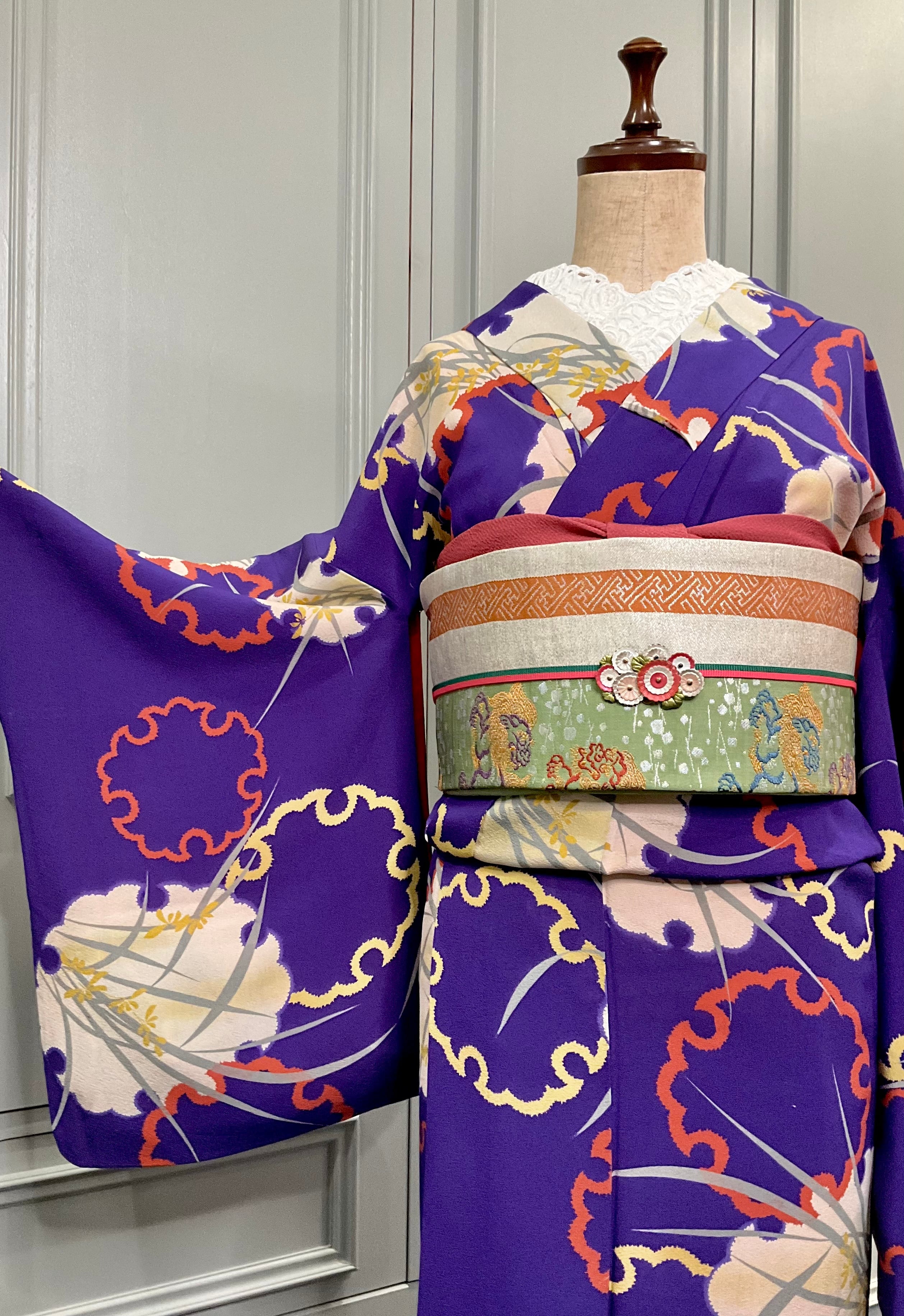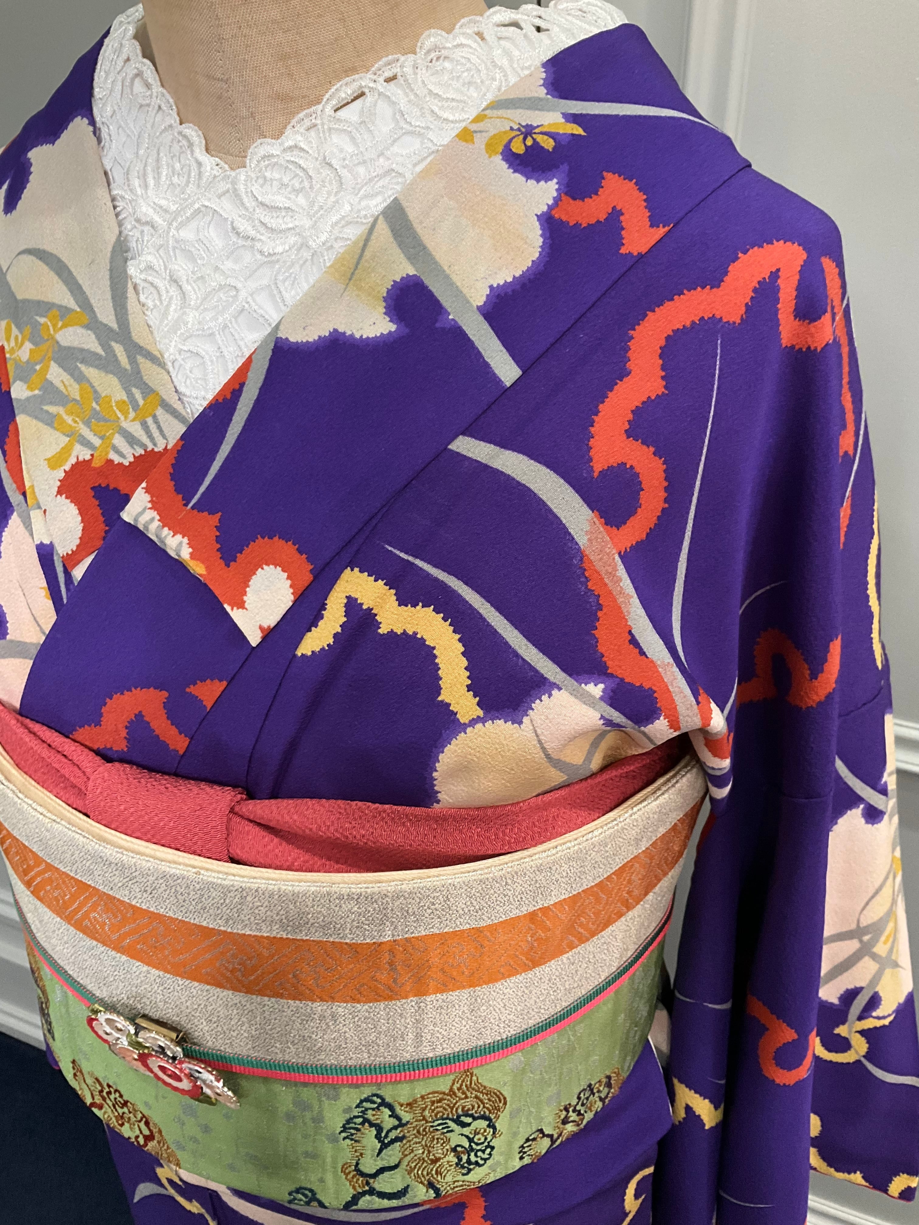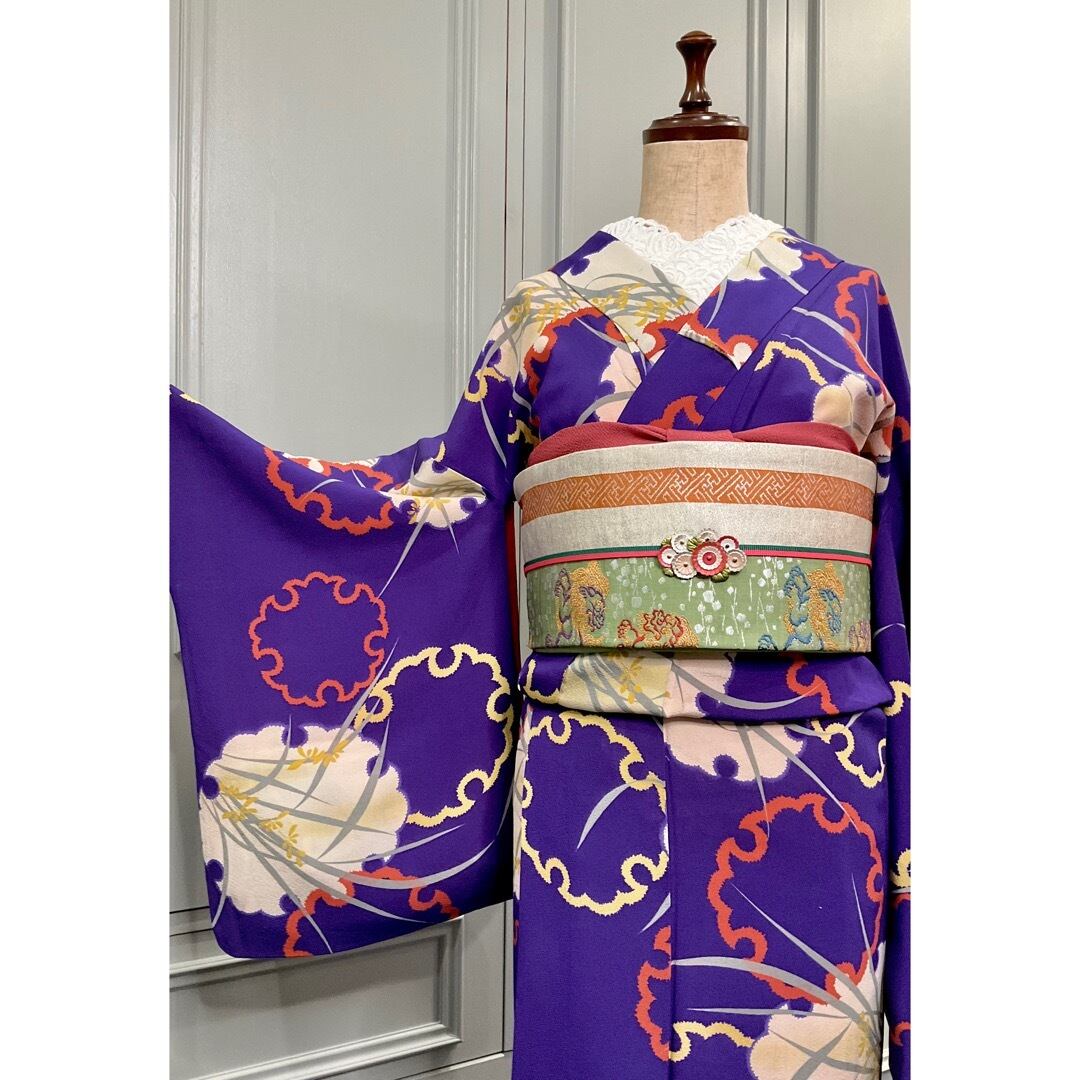 また、紫色の地色に朱色系と黄色の雪輪文様がアンティークらしい組み合わせで良いですね✨