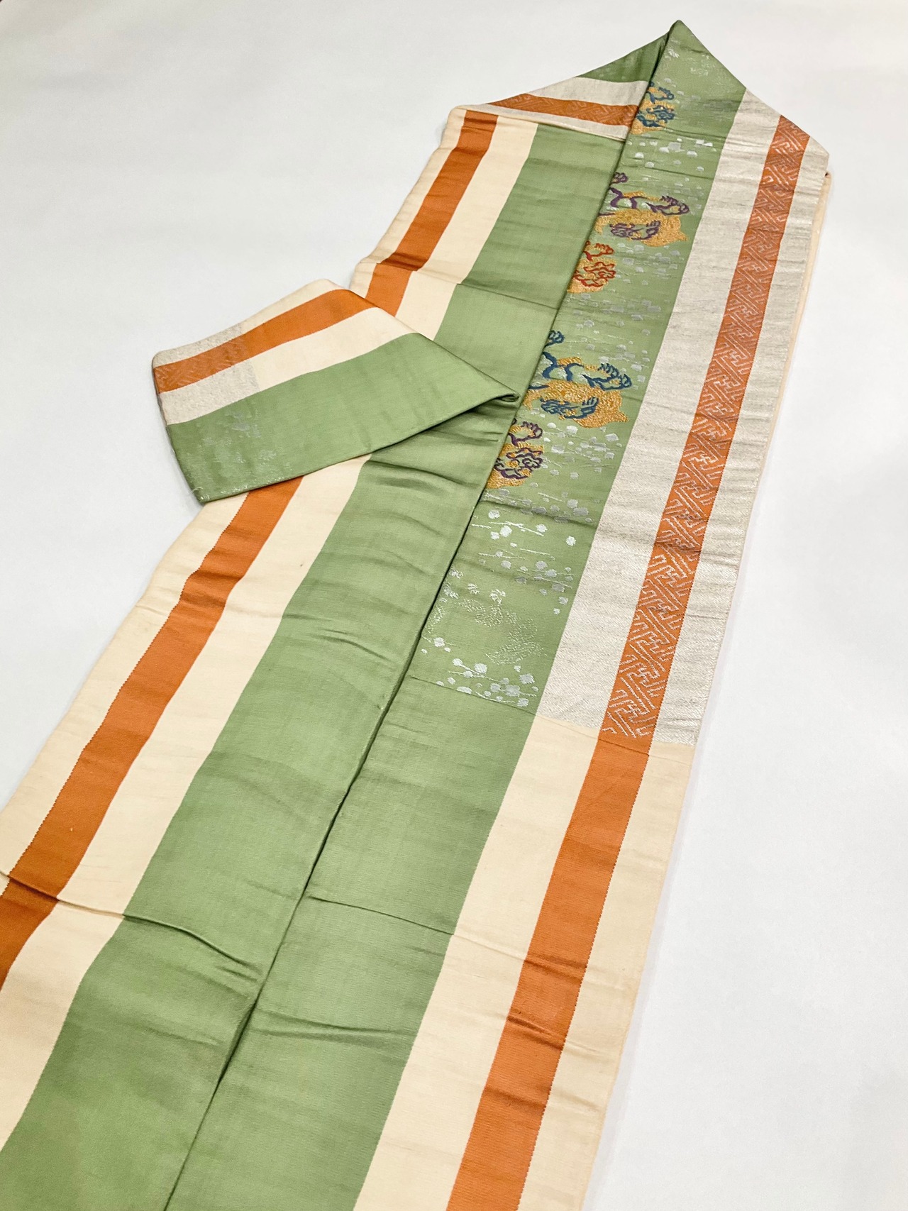 銀糸が織り込まれた生成系×オレンジ×グリーンの縦ラインに、唐獅子がデザインされた、アンティーク名古屋帯です♪