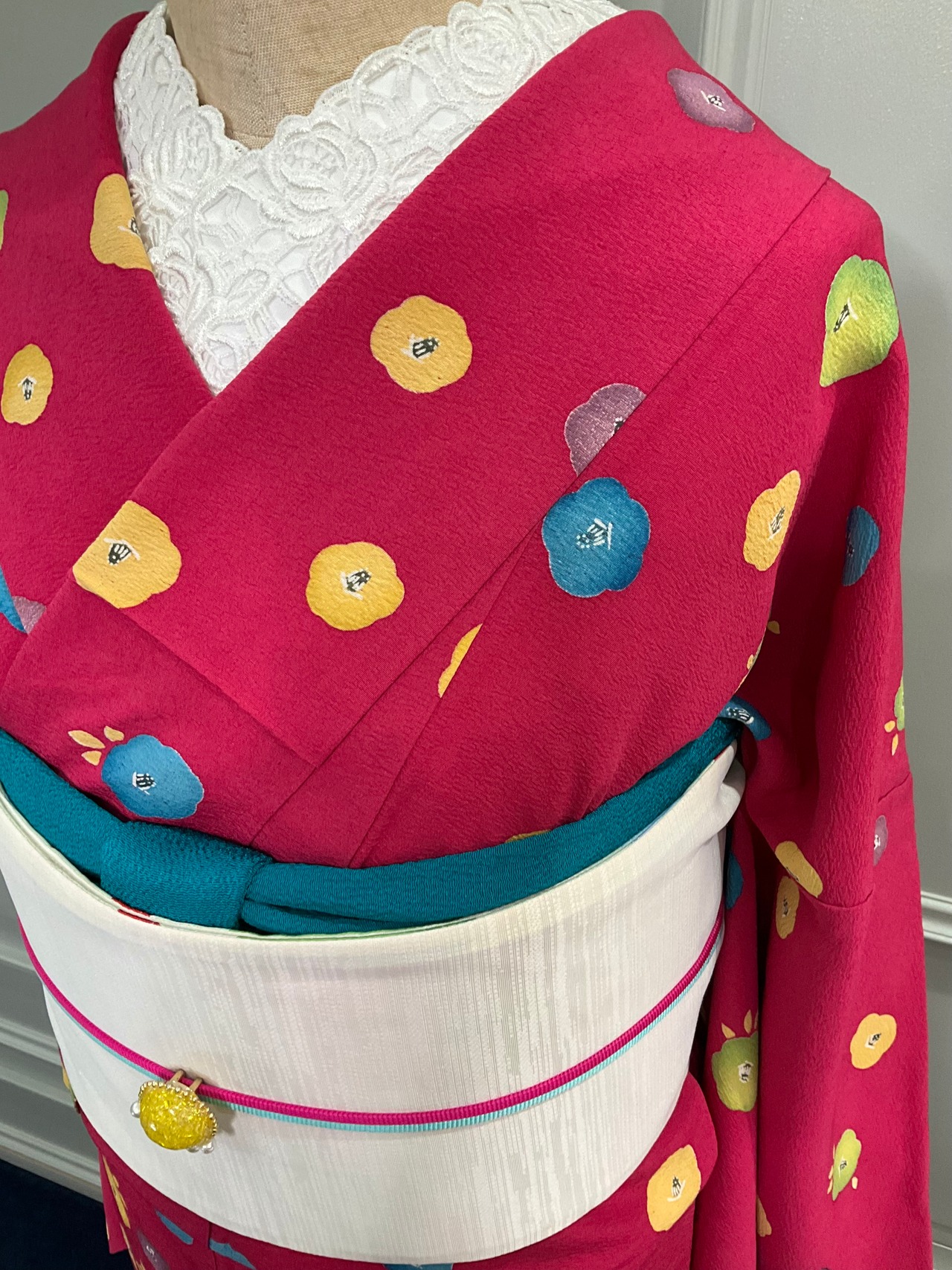 ビビットなピンクがパッと目を引く、こちらのお着物。