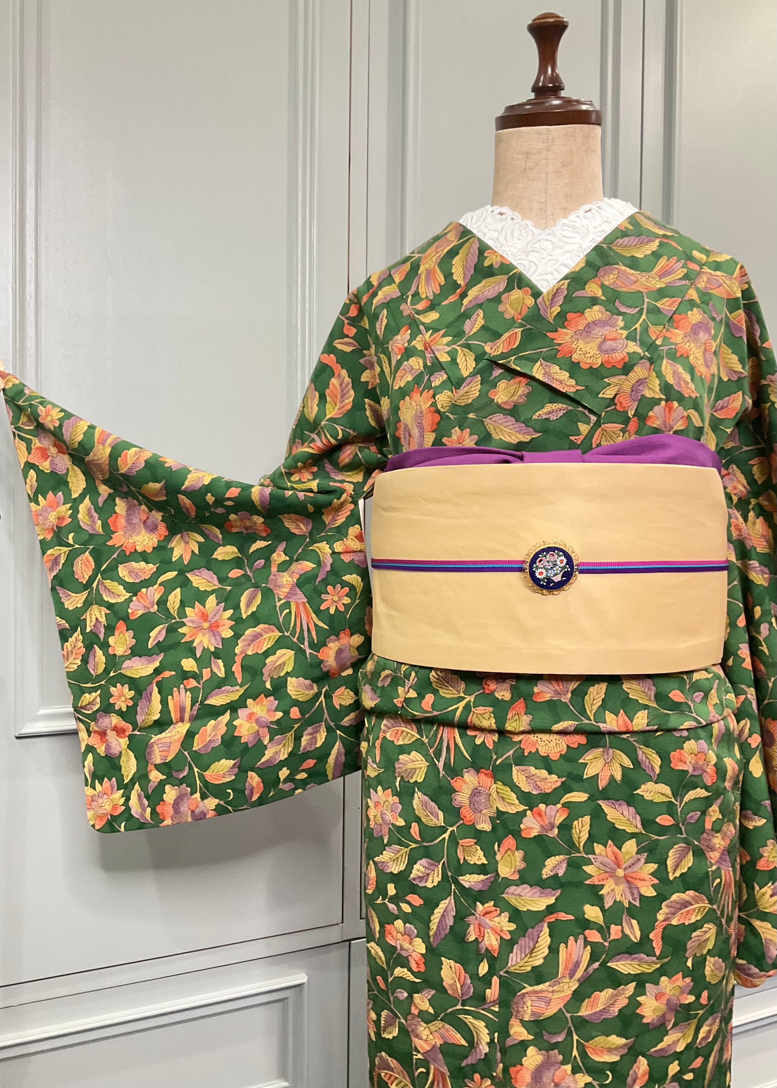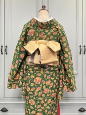 グリーンの地色に、花模様と鳥がデザインされた、リサイクル小紋着物です♪
