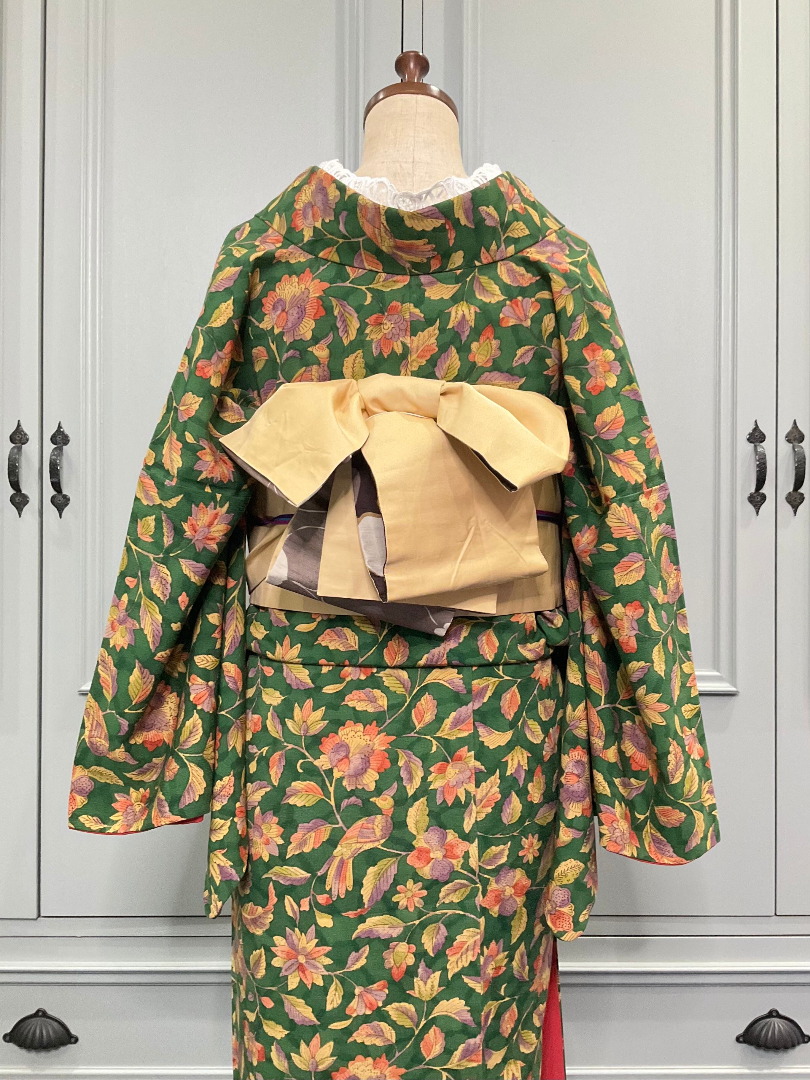 ロング*エバーグリーン レトロ・ワンピーステイスト フラワー×バード*リサイクル小紋キモノ 0593