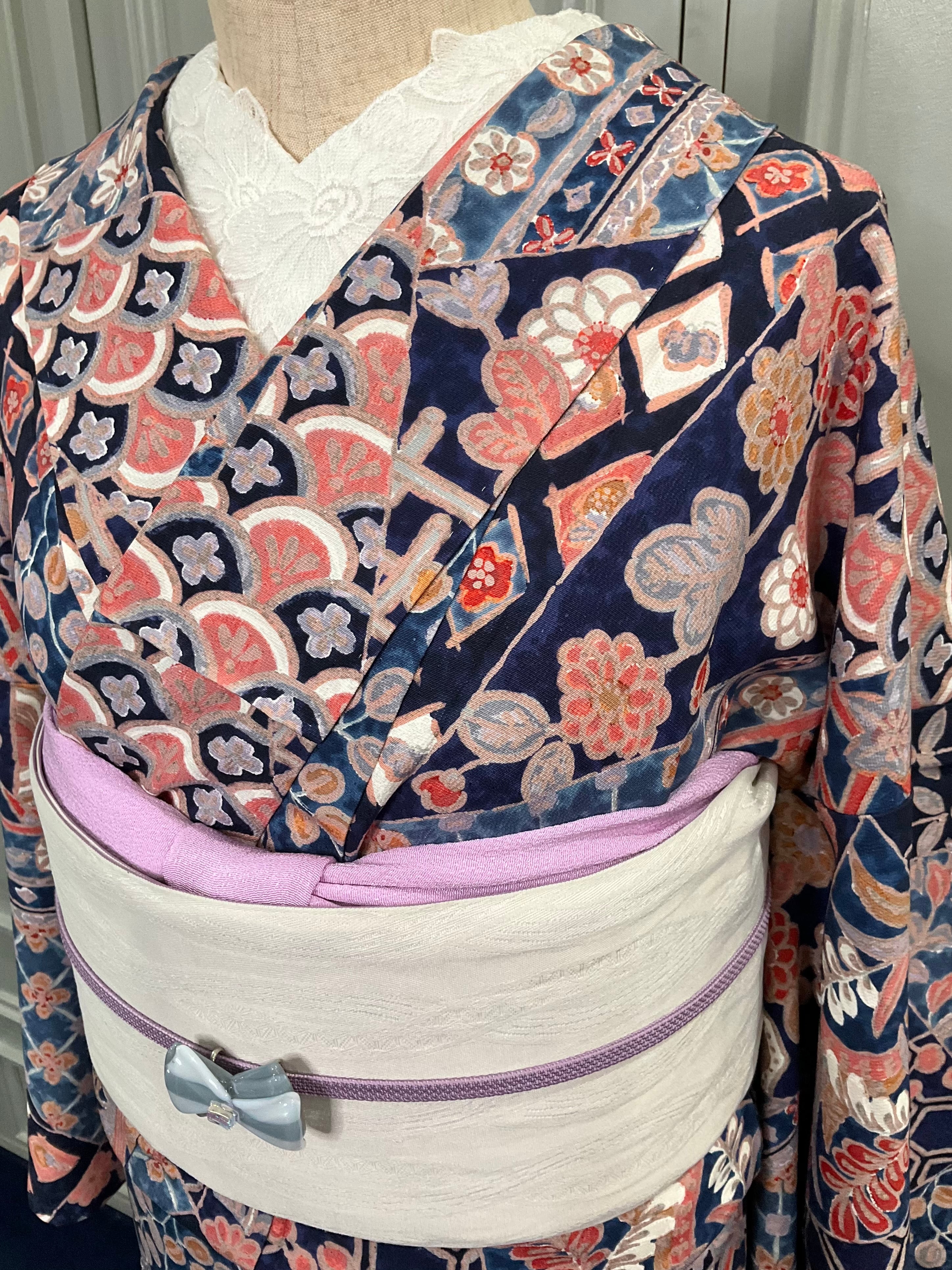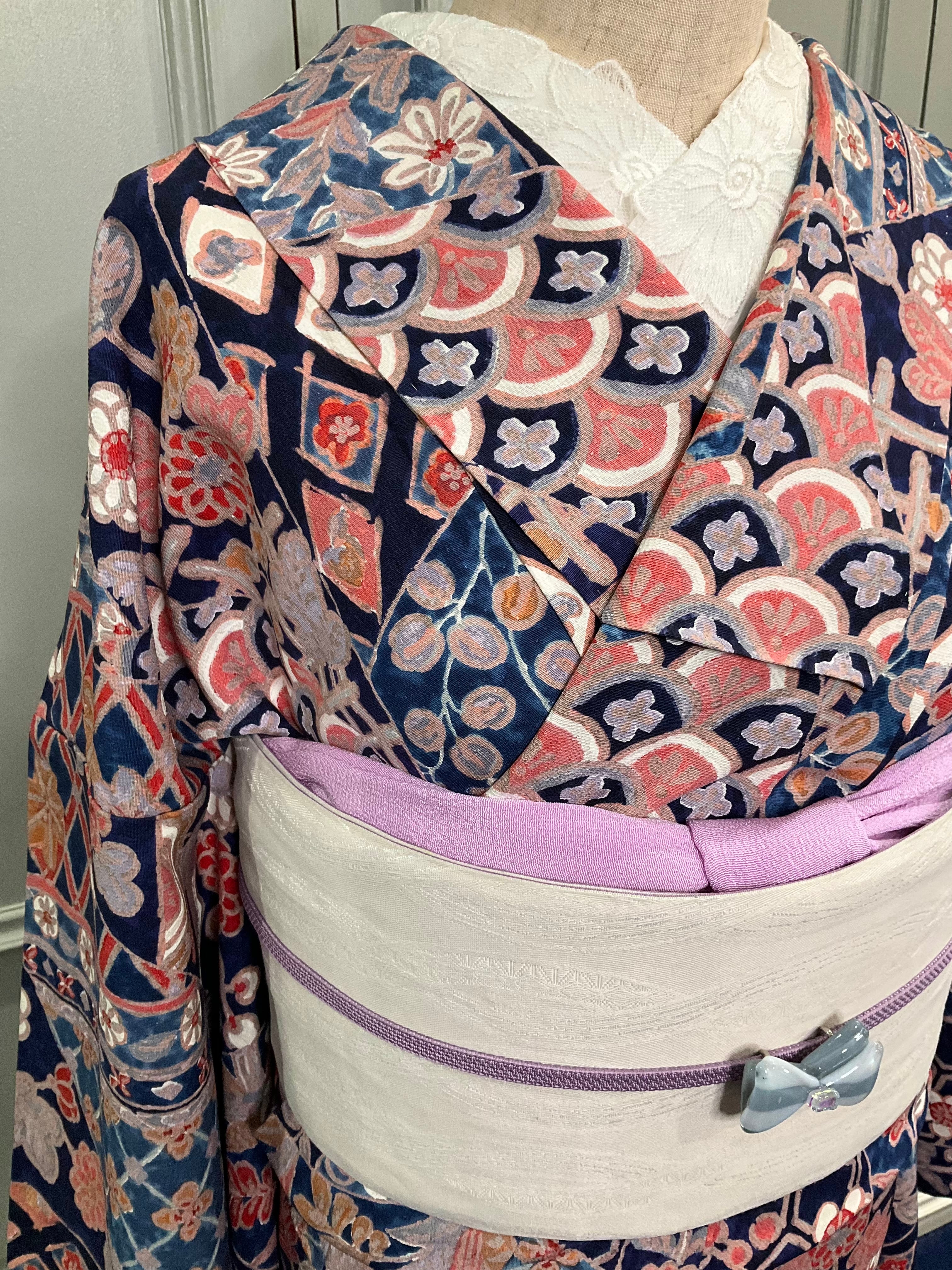 深いネイビーや、少しくすみの入ったブルーなど、落ち着いたお色味の地色に、暖色系の花模様がとても映えるこちらのお着物✨