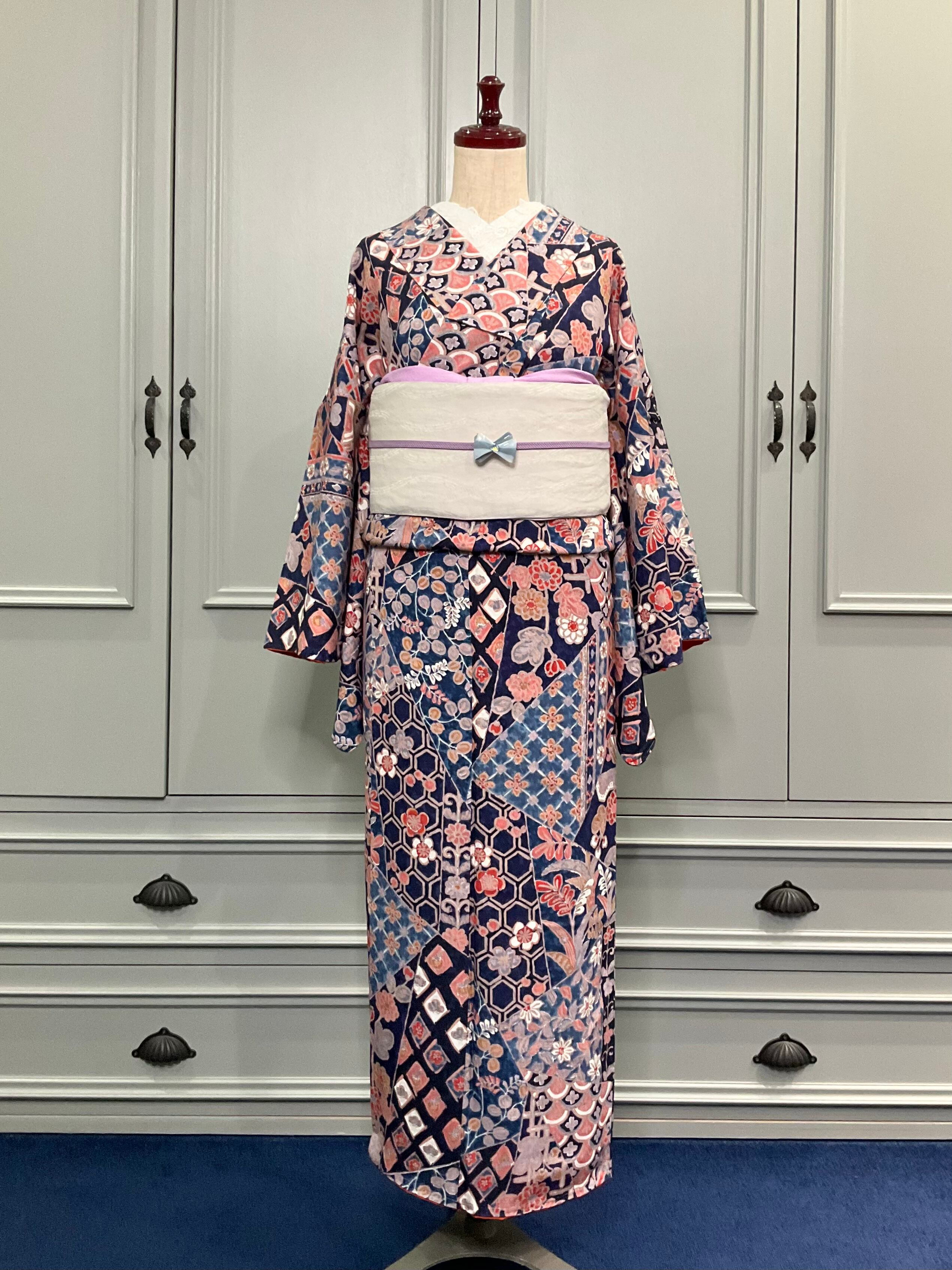 ロング*ネイビー×ブルー ヨーロピアン・タイルテイスト*リサイクル小紋キモノ 0604