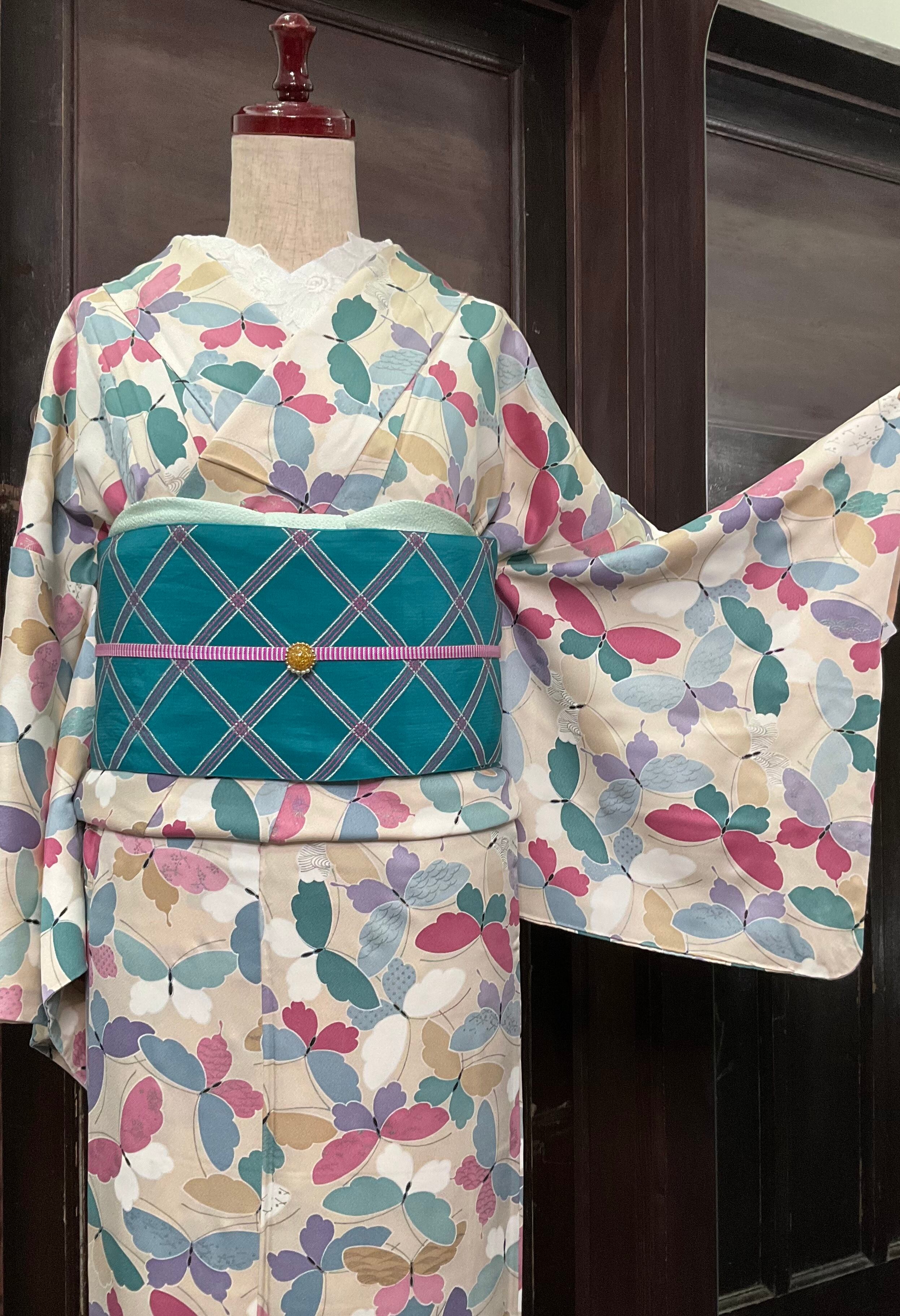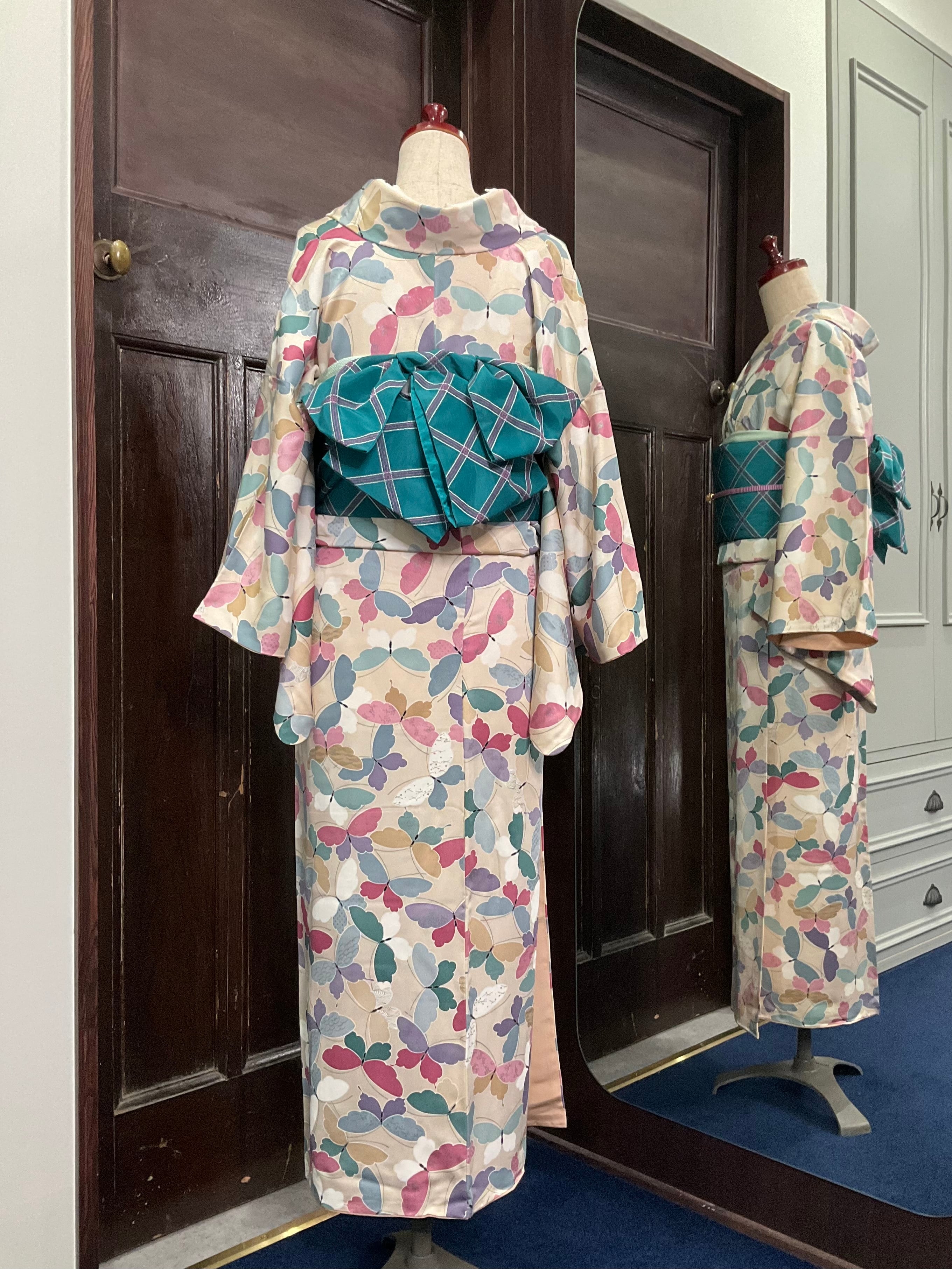 クリーム・ミルクティー カラフル・バタフライ*リサイクル小紋キモノ 0623