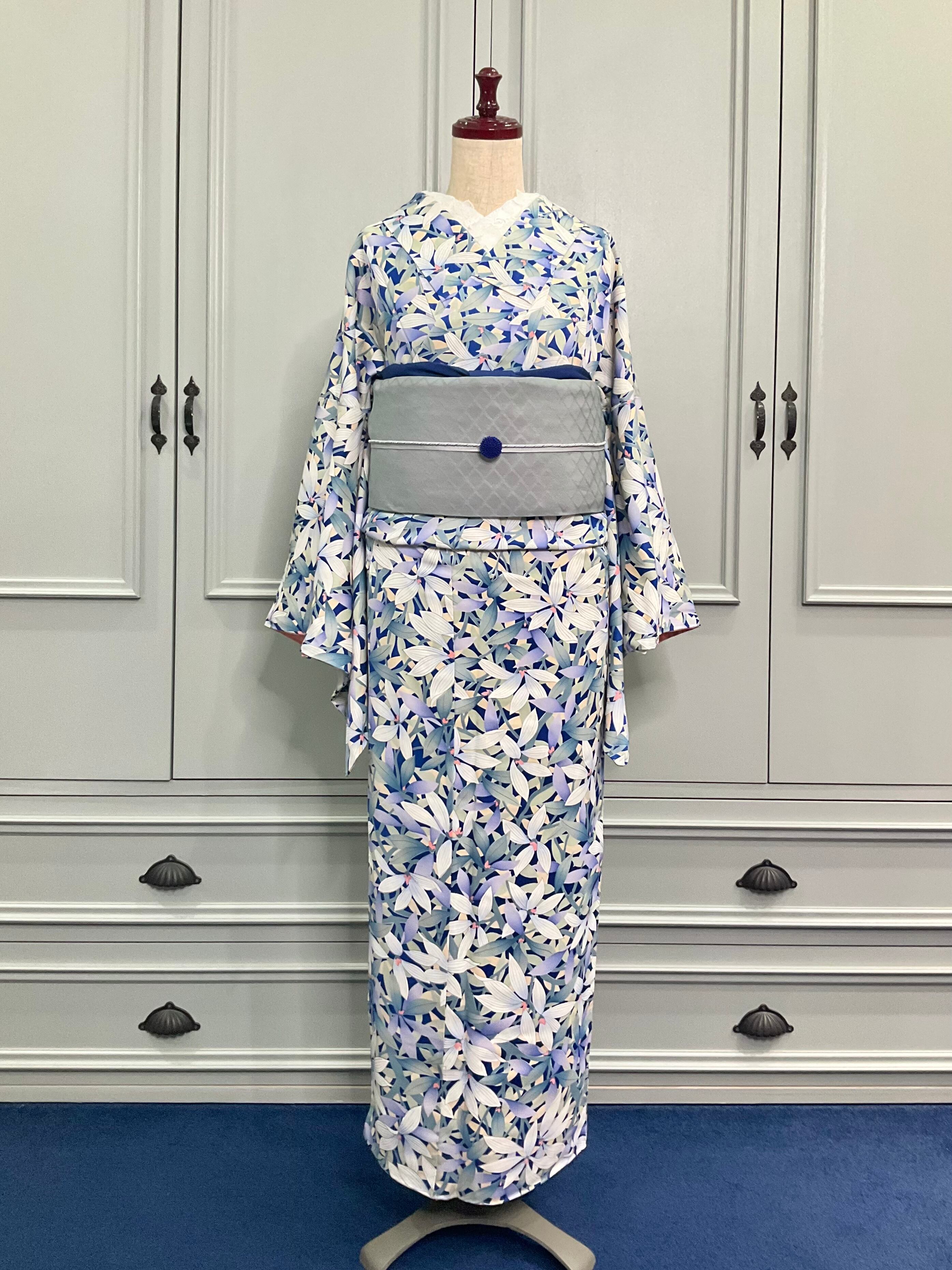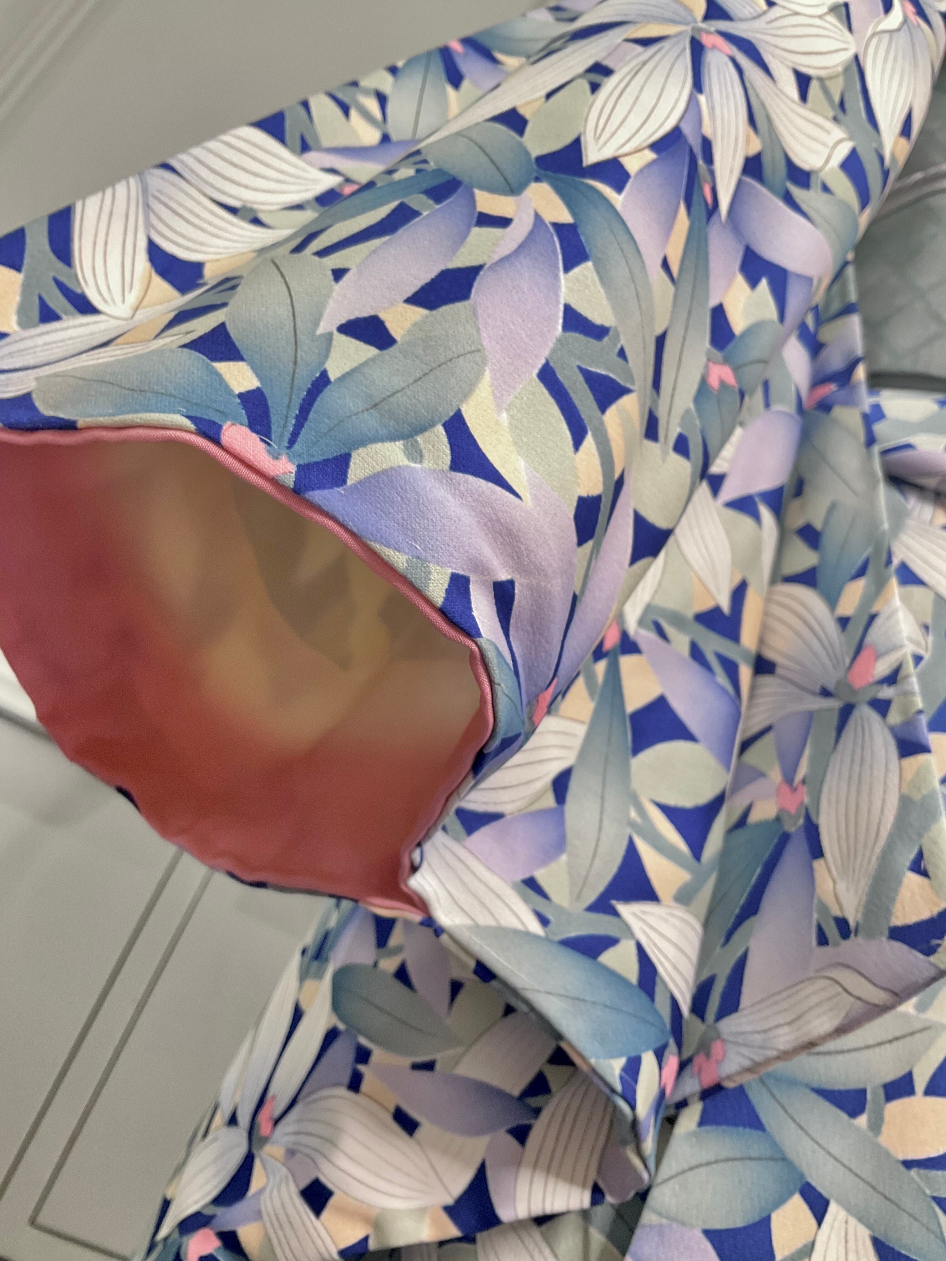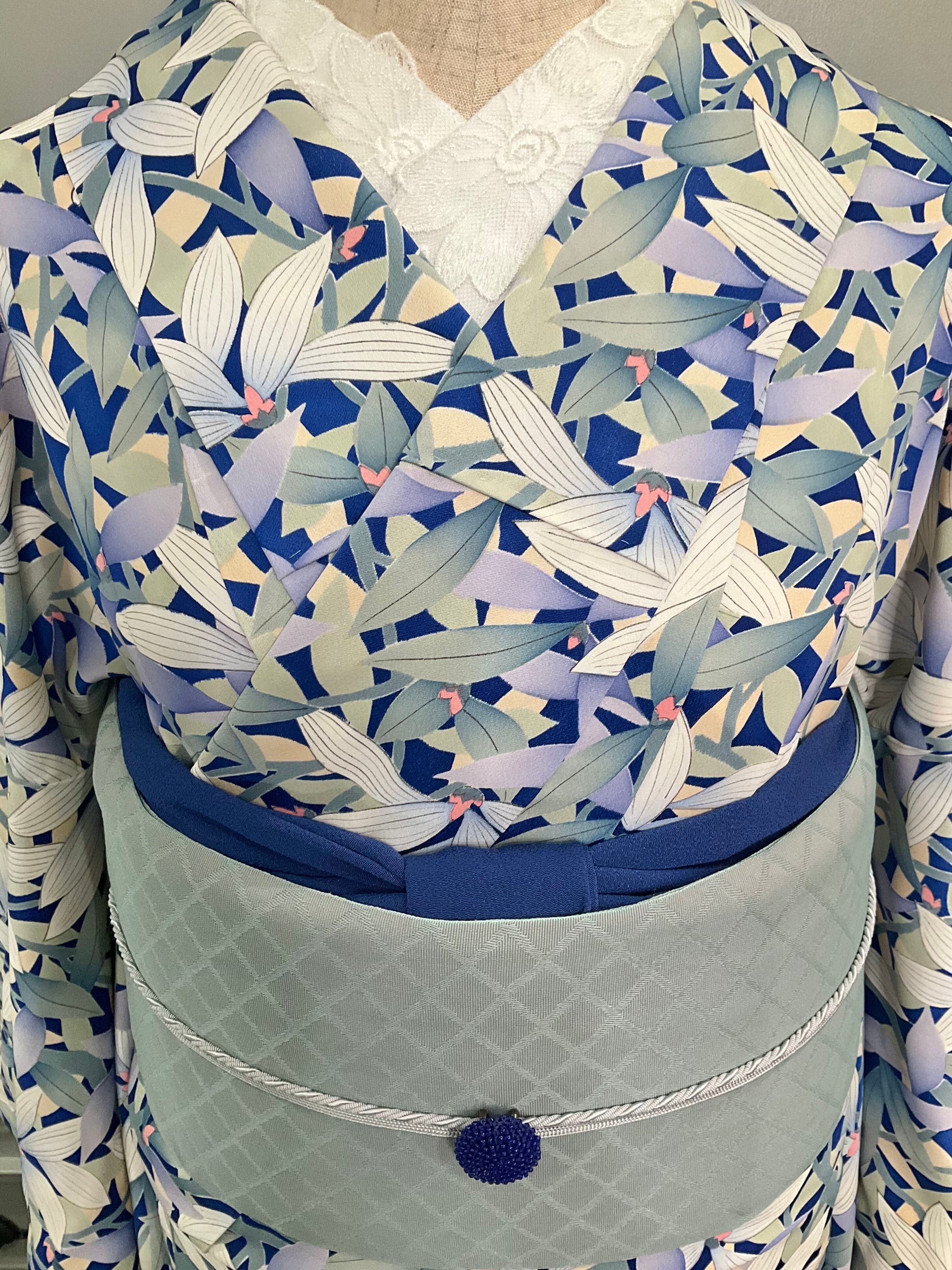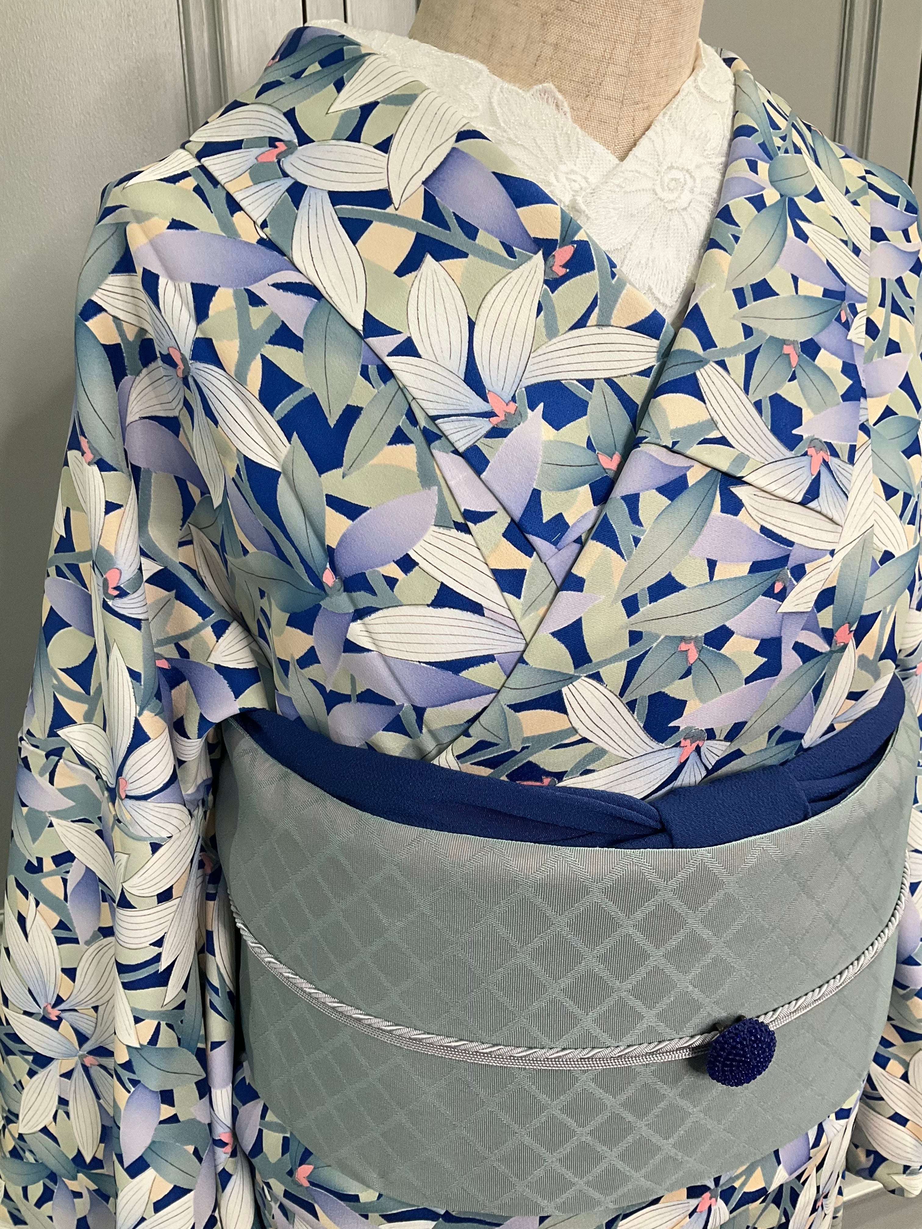 やわらかく、とろみのある生地感に、ブルー系で統一された花模様のデザインが綺麗なこちらのお着物。