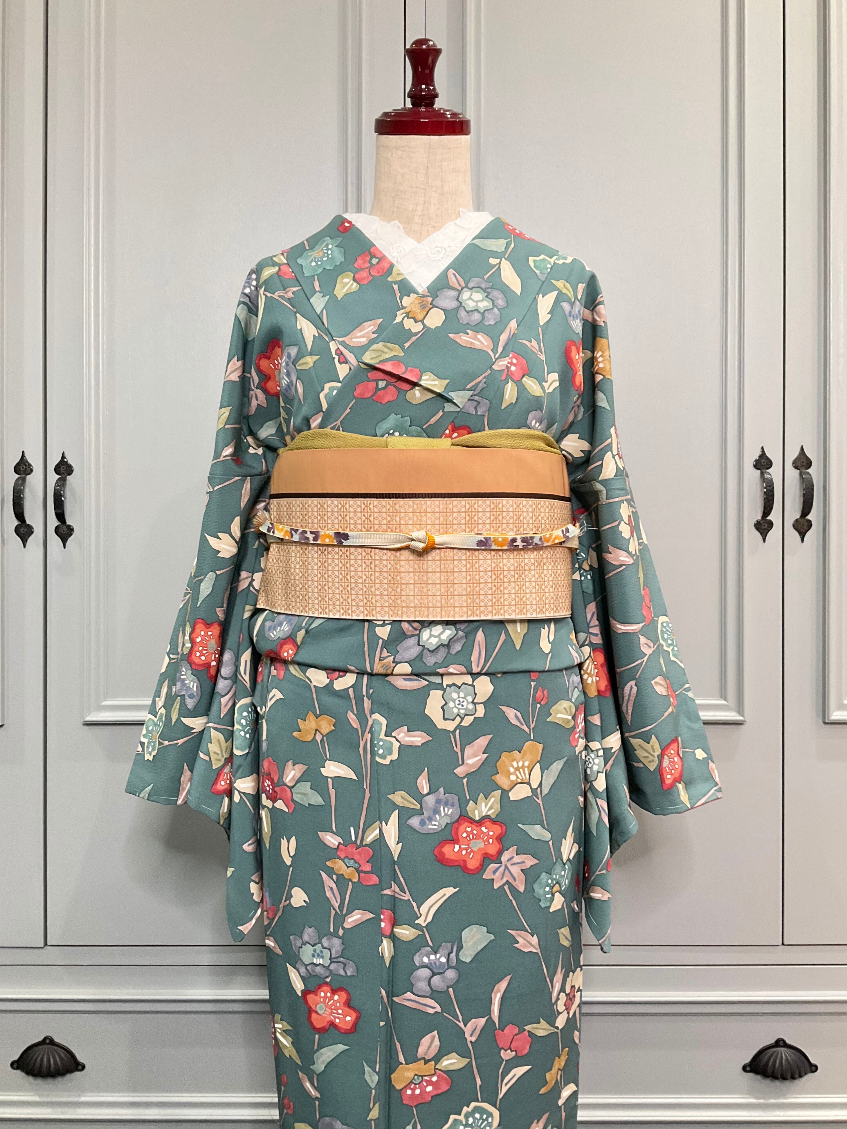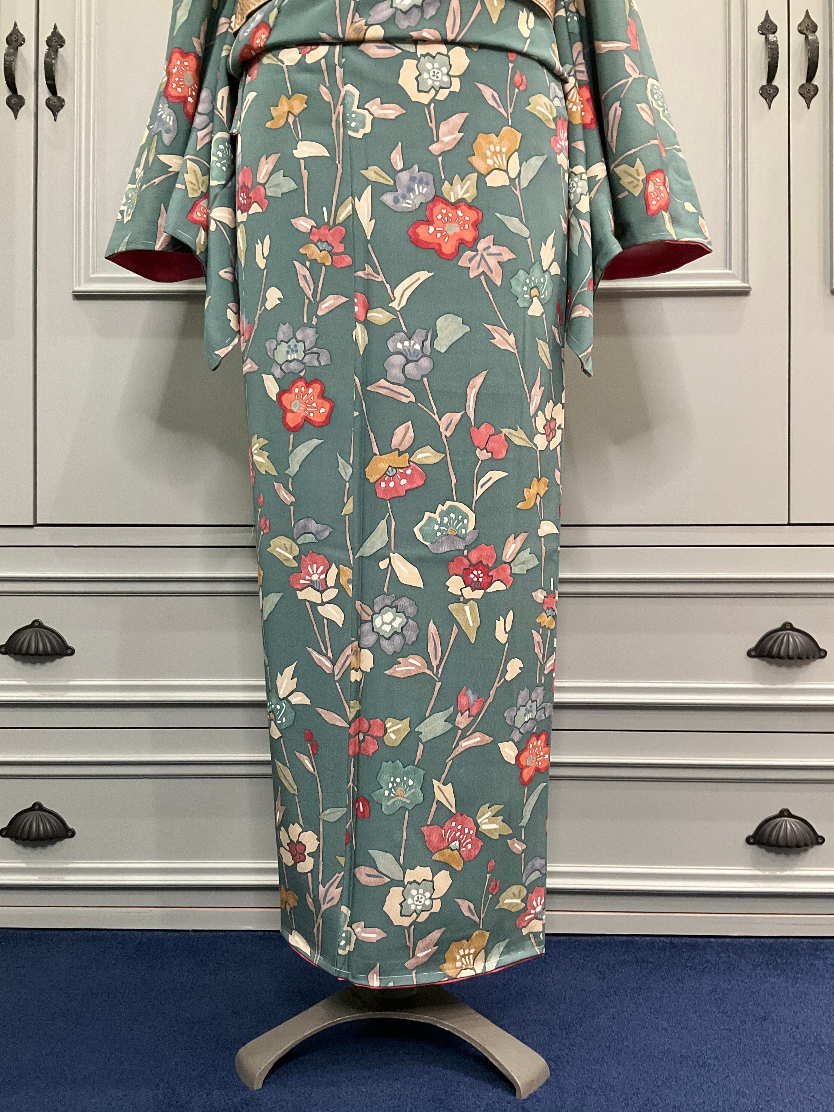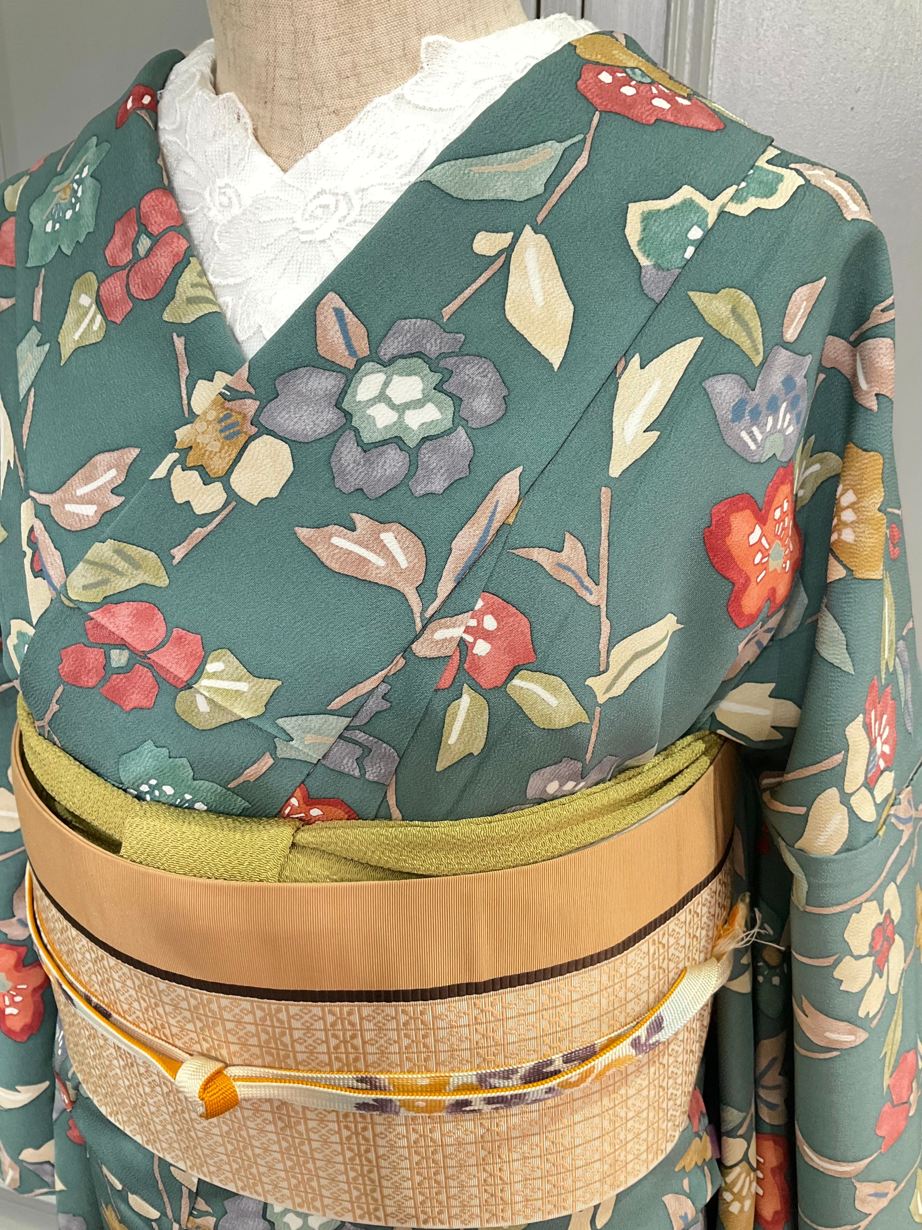 少しざらっとした手触りに、少しくすみの入ったグリーンと、モダンなデザインの花模様がオシャレなこちらのお着物。