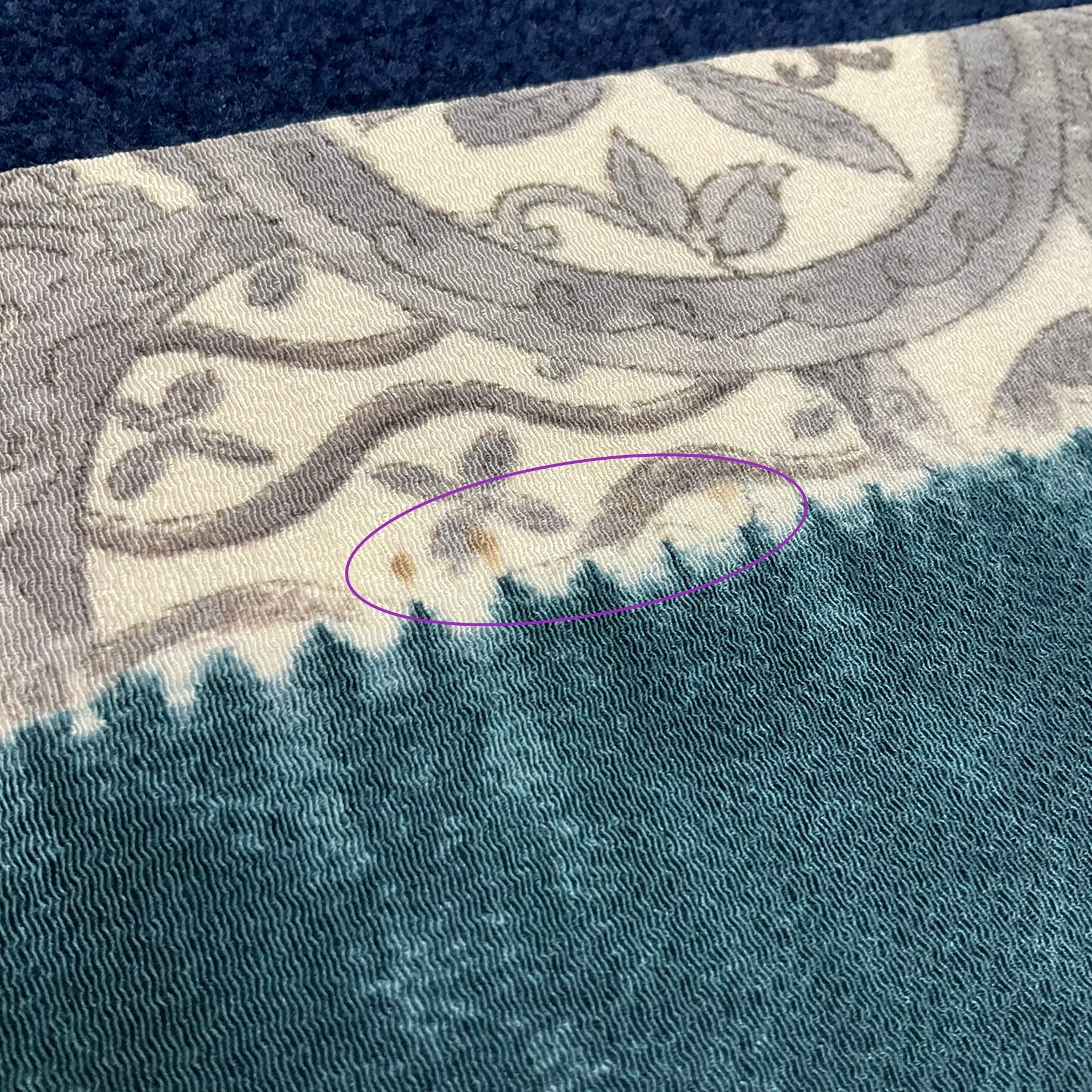 目立ちにくいですが、お太鼓部分(表・裏)、胴回り部分に、何ヶ所か染色時の絞りアク有り。