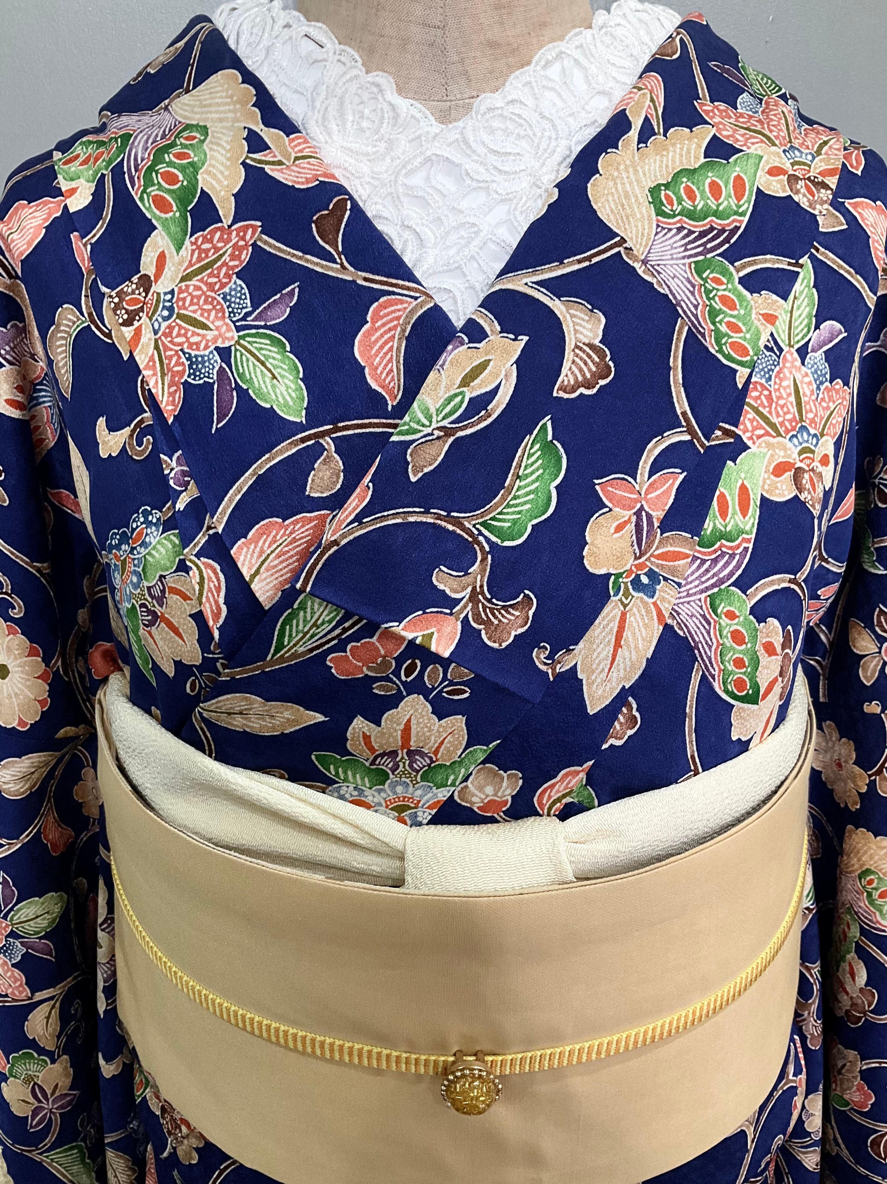 ほんのり光沢が有る、やわらかな生地感に、ネイビー系の地色と、全体的に描かれた華やかなデザインが素敵なこちらのお着物。