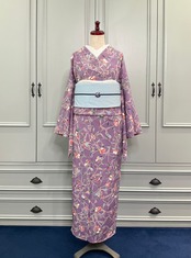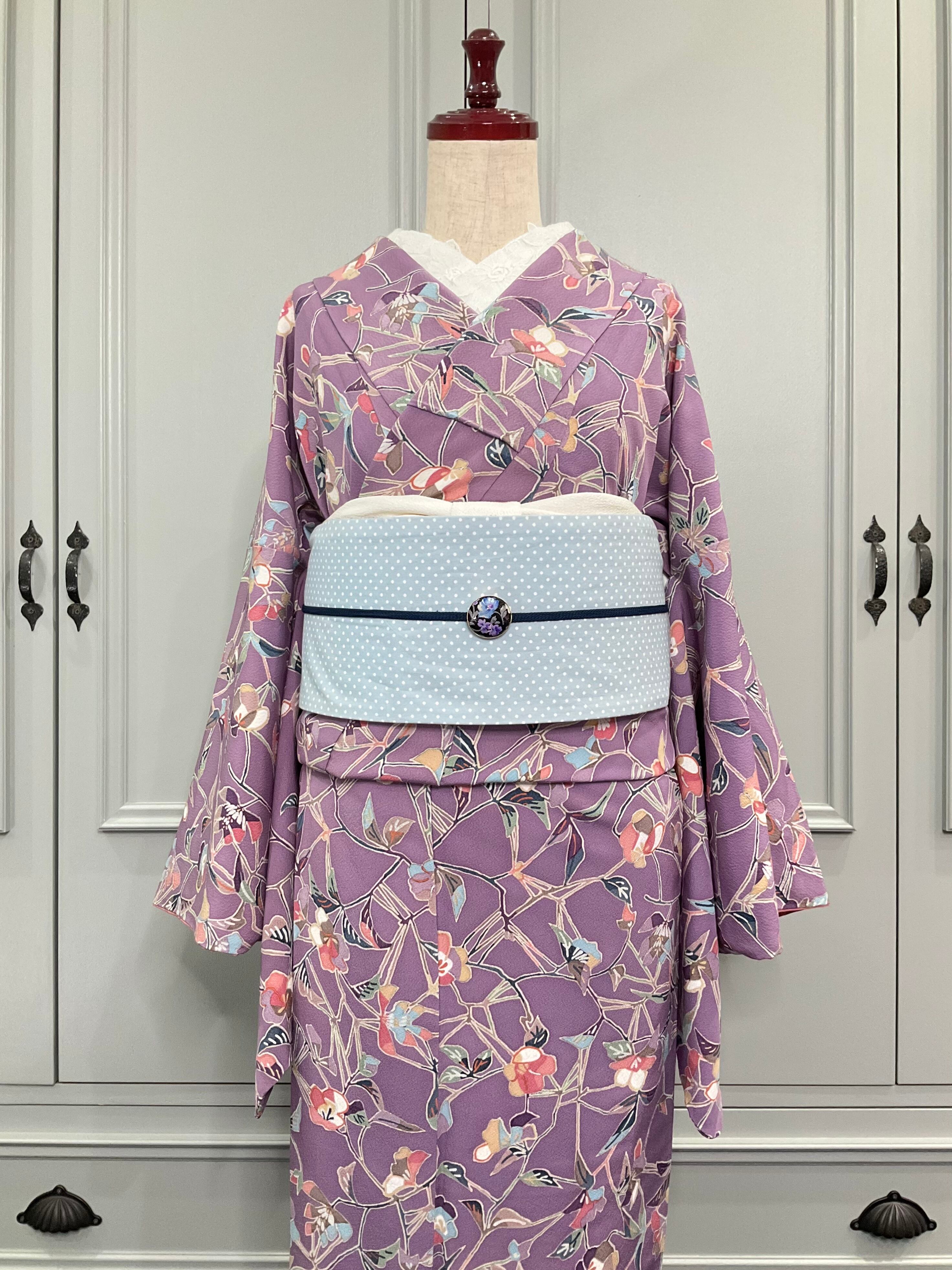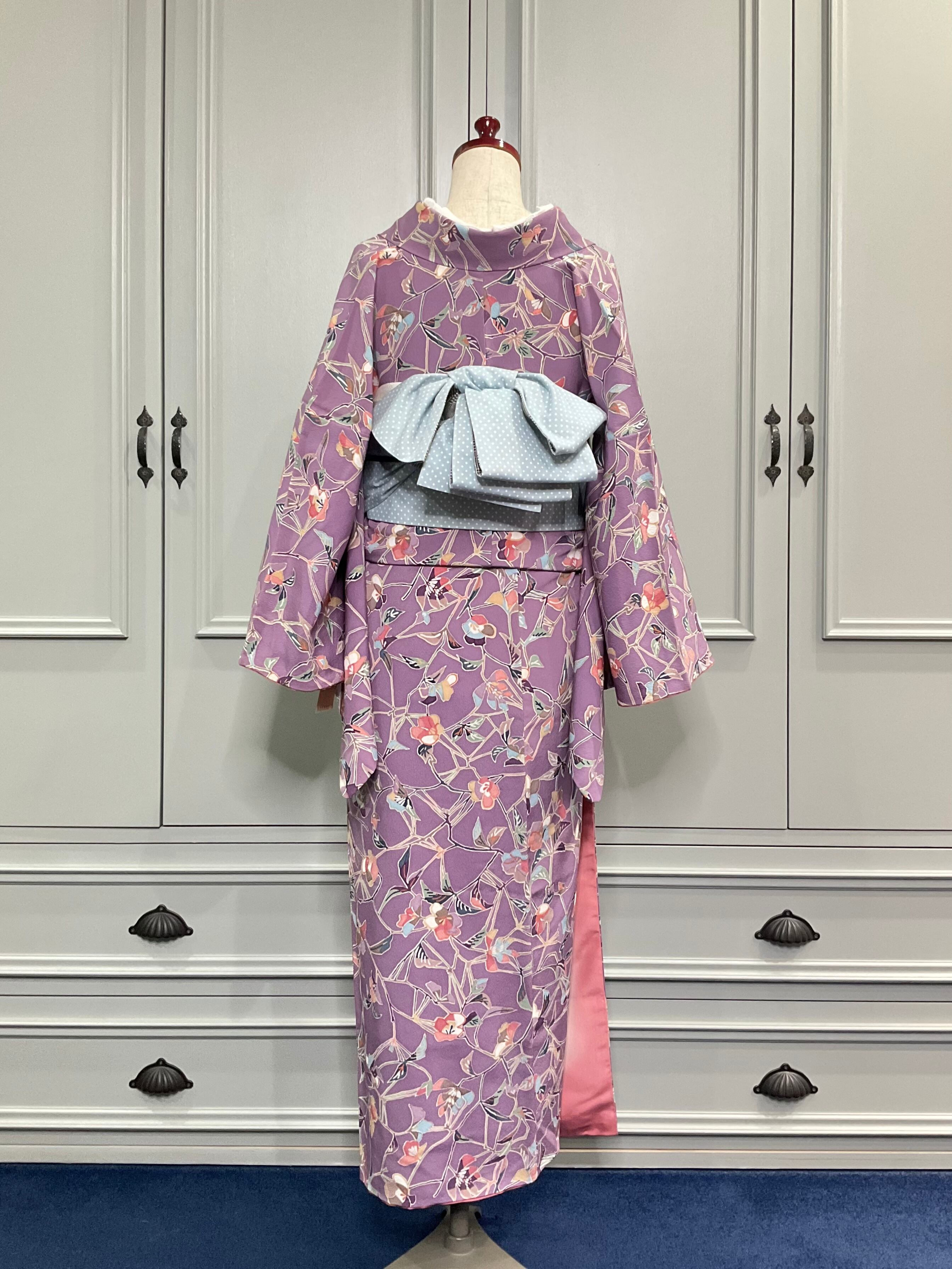 以前のお着物は、淡いブルー系でしたが、今回は、ほんのりくすみカラーのパープル。