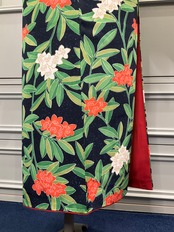 やわらかく、さらっとした手触りの生地感に、深みのあるネイビー系の地色と、朱色のようなレッド系×ホワイトの花模様、そしてグリーンの葉模様が映えるこちらのお着物。