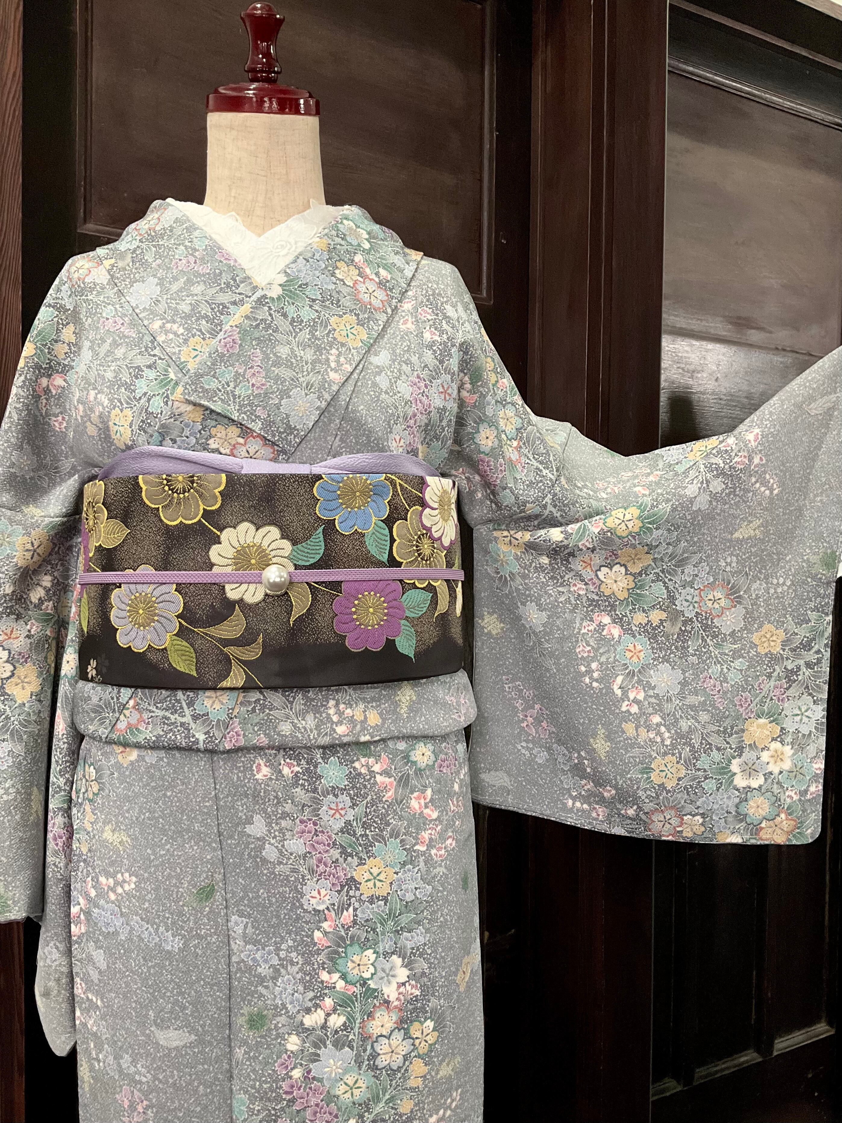 少しふっくらとしていて、ざらっとした手触りの生地感に、淡いグレー地に雪のような撒き糊散らしの地色と、さまざまな花模様が華やかなこちらのお着物。
