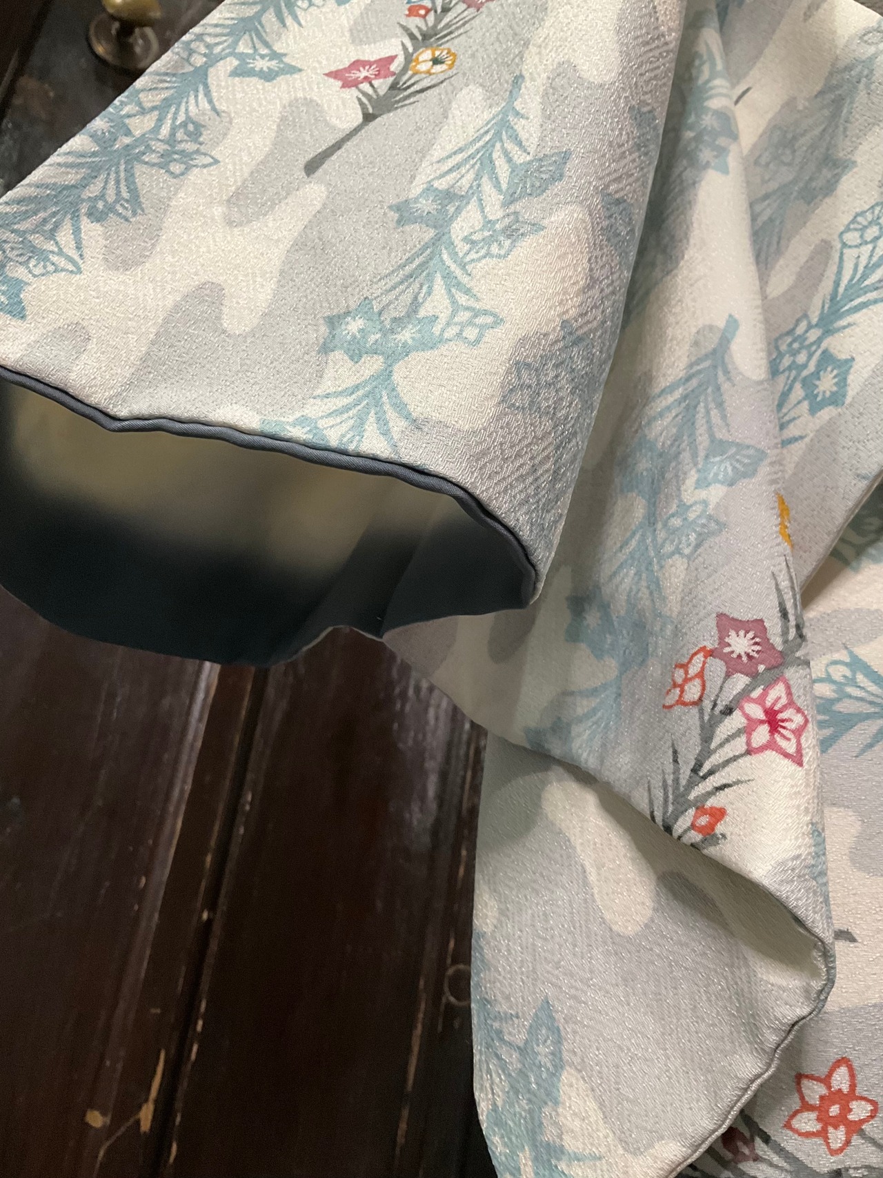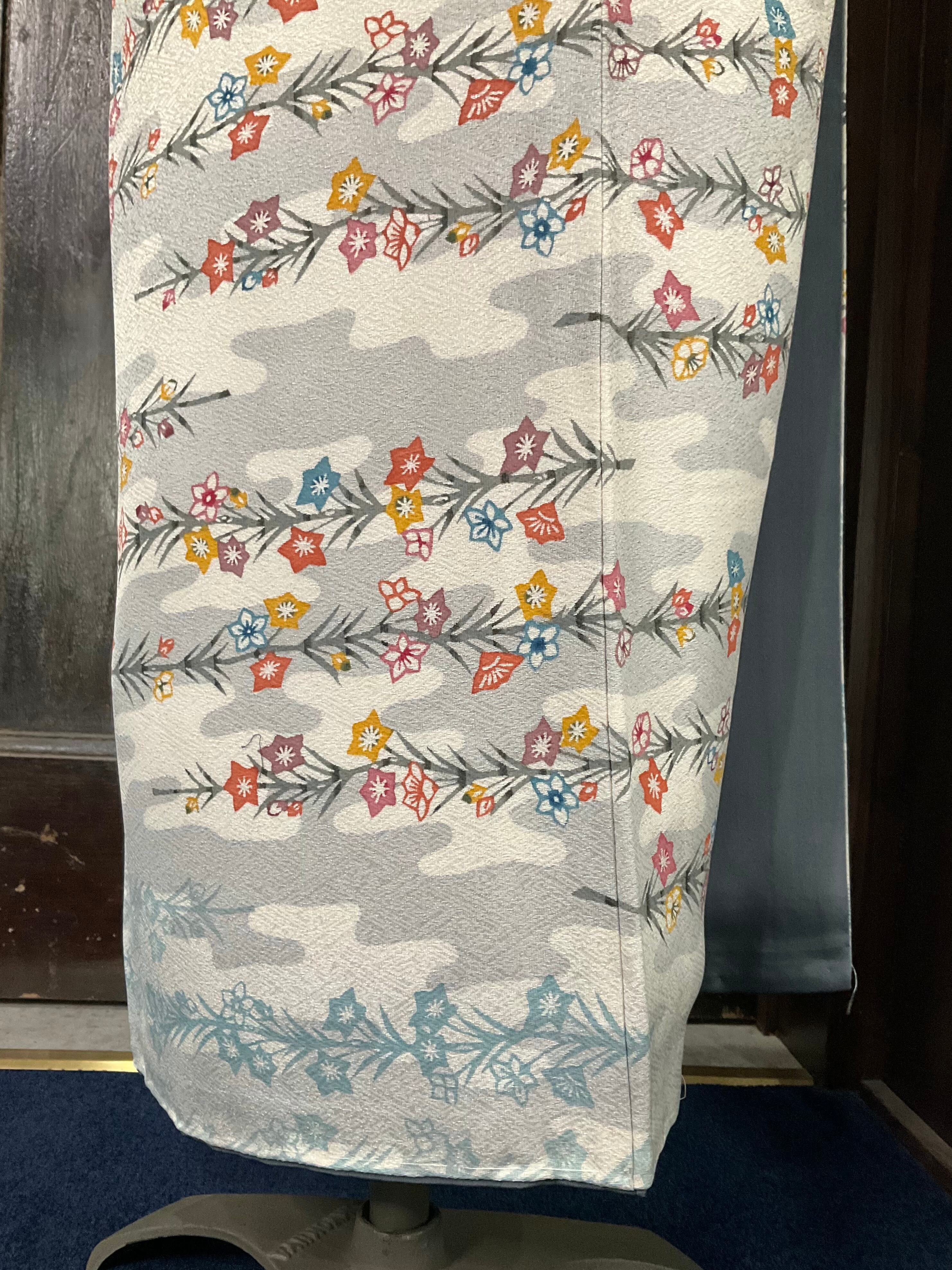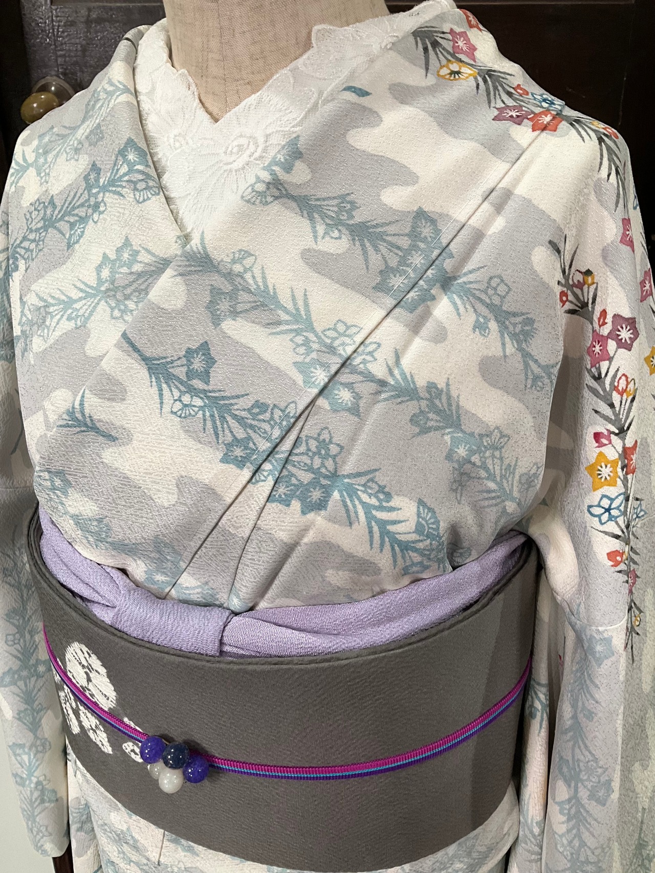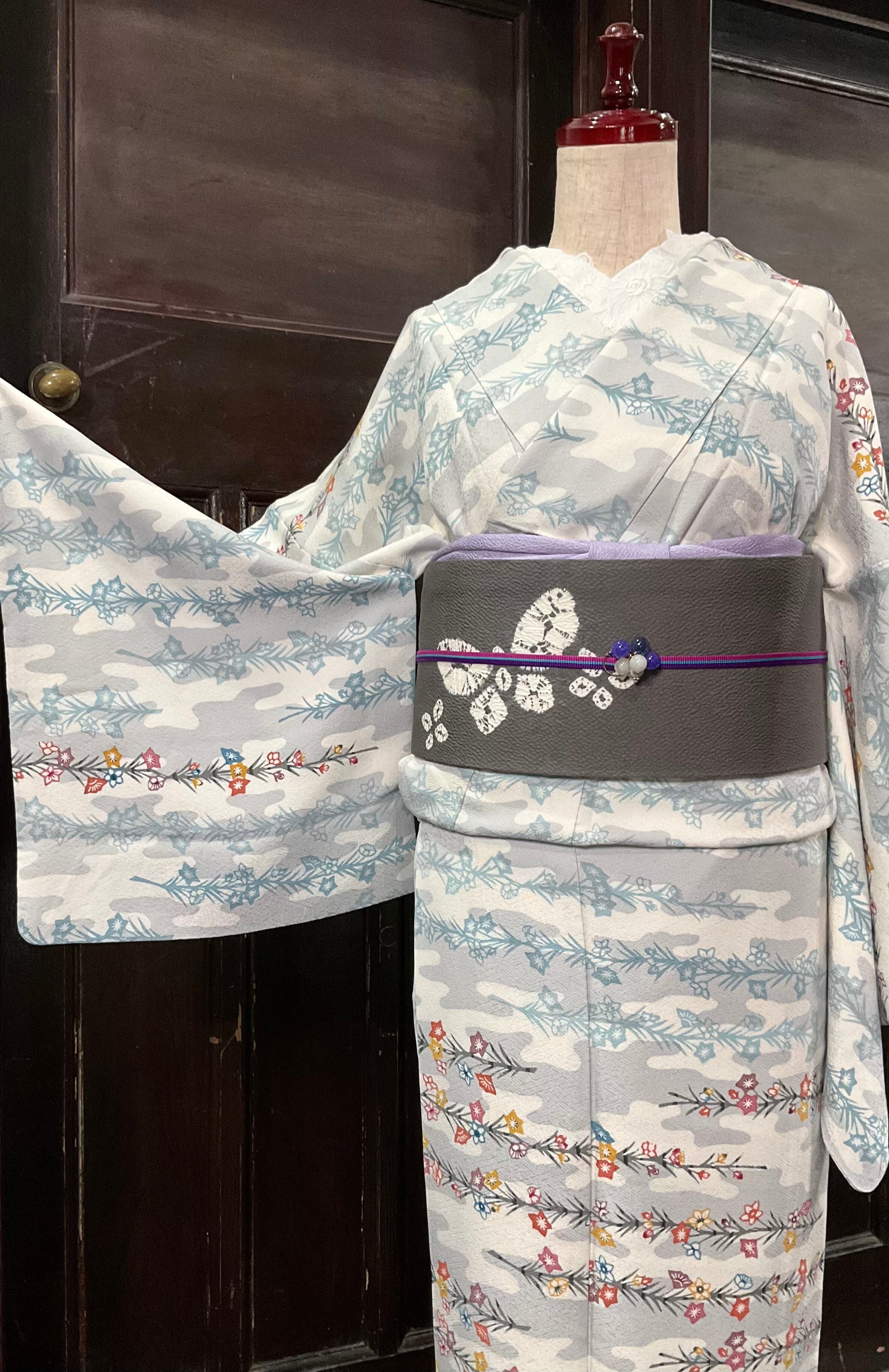 淡いグレー×ホワイトの地色に、花模様がデザインされた、小紋着物です♪