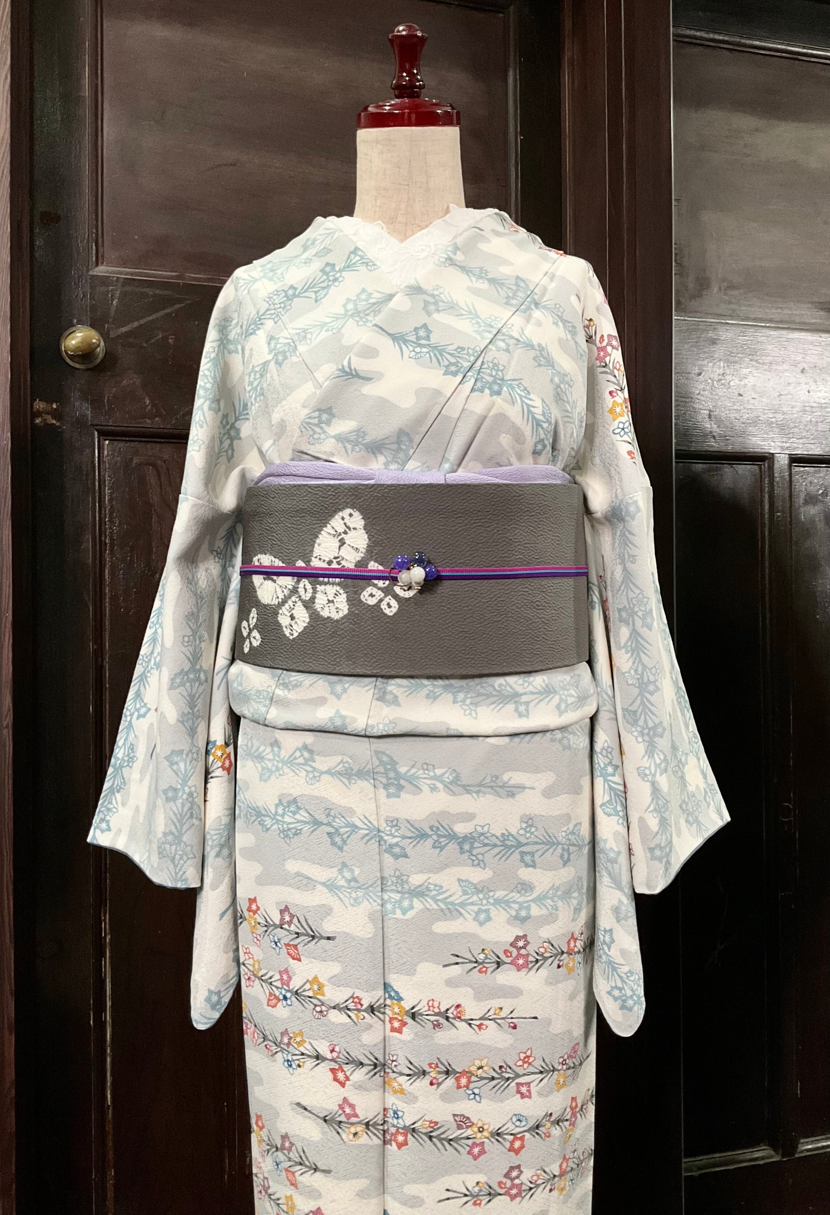 グレー×ホワイトの霞がデザインされた地色と、横ラインの花模様がモダンなこちらのお着物。