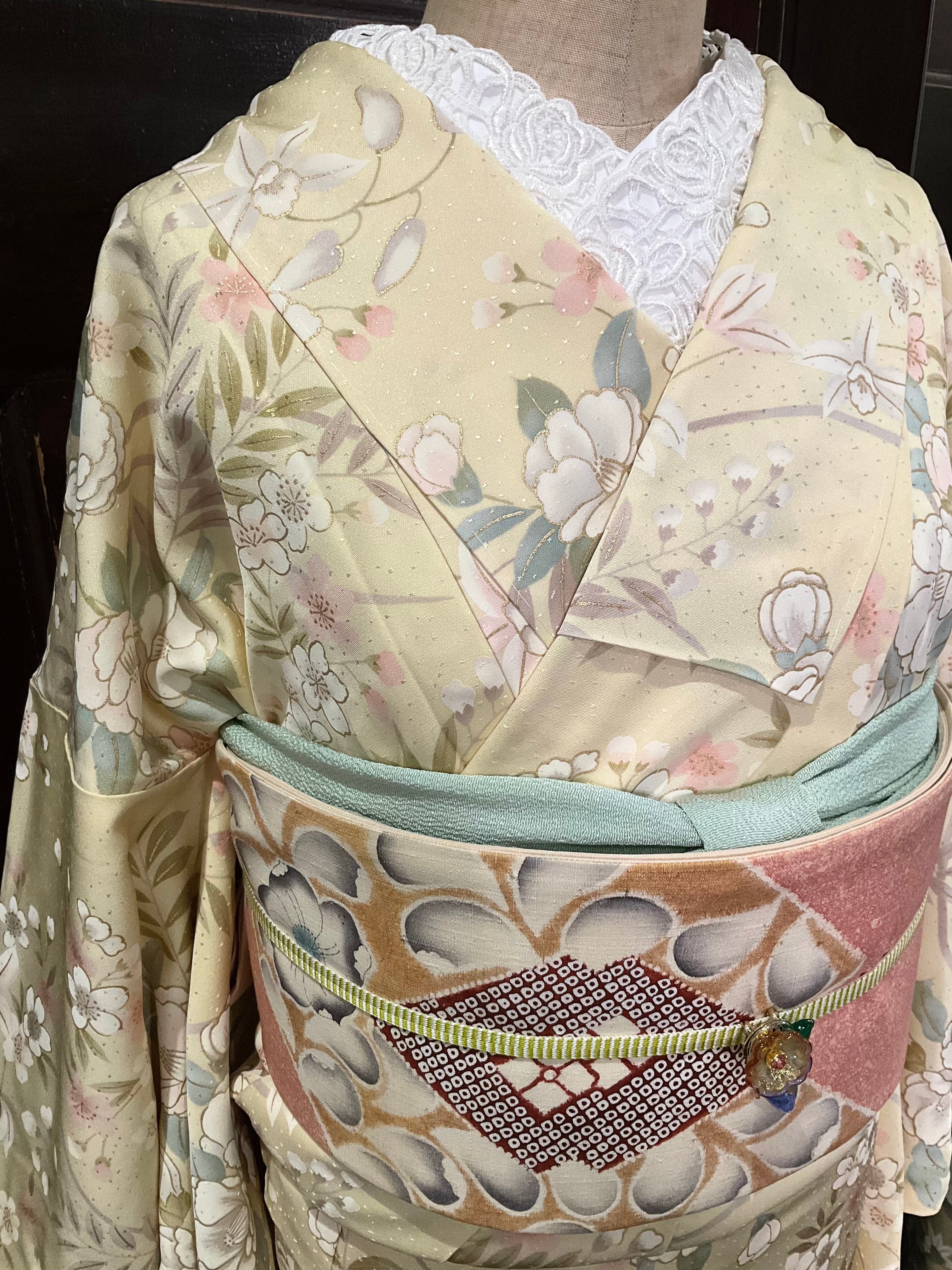 やわらかく、ほんのり光沢感が有る生地感に、淡いイエローと、たくさんの花模様が華やかなこちらのお着物。
