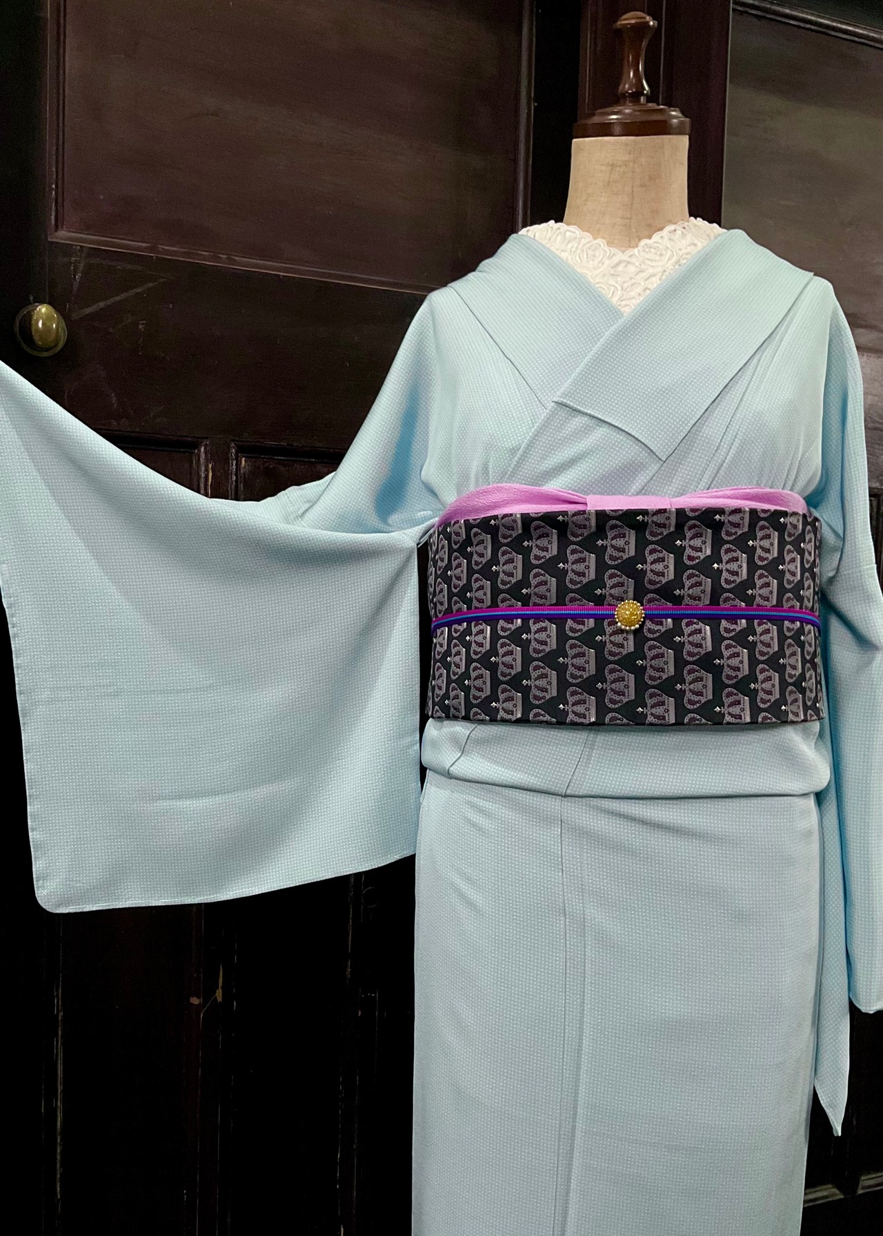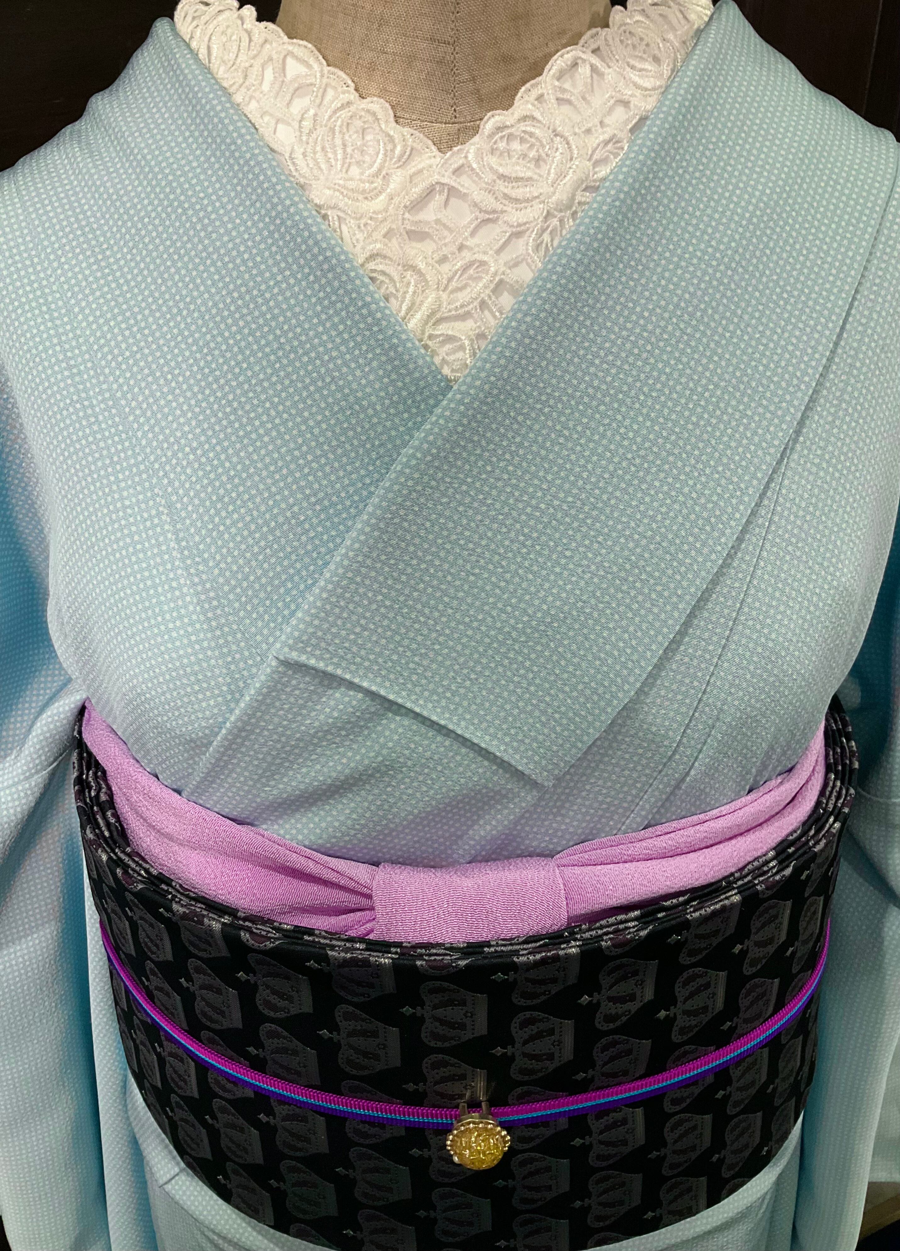 デザインは着物の定番、江戸小紋であるにもかかわらず、淡いブルーと合わさる事で、ポップな雰囲気が生み出された、どこかハイブリッドなお着物ではないでしょうか?^^
