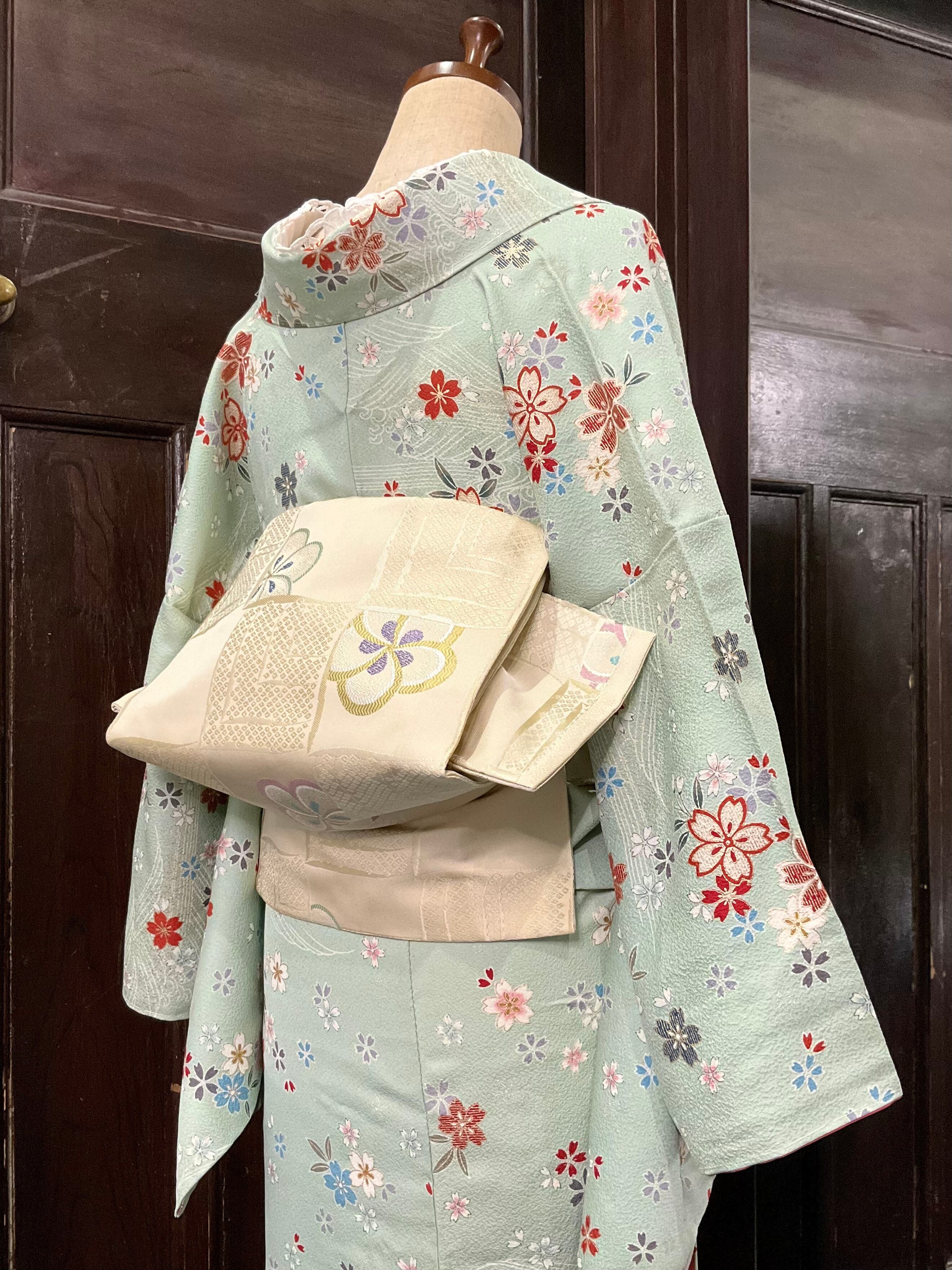 少しなめらかな手触りの生地感に、アイボリー系の、少し黄みがかったホワイト系の地色と、市松×ねじり梅の花模様が素敵なこちらの名古屋帯。