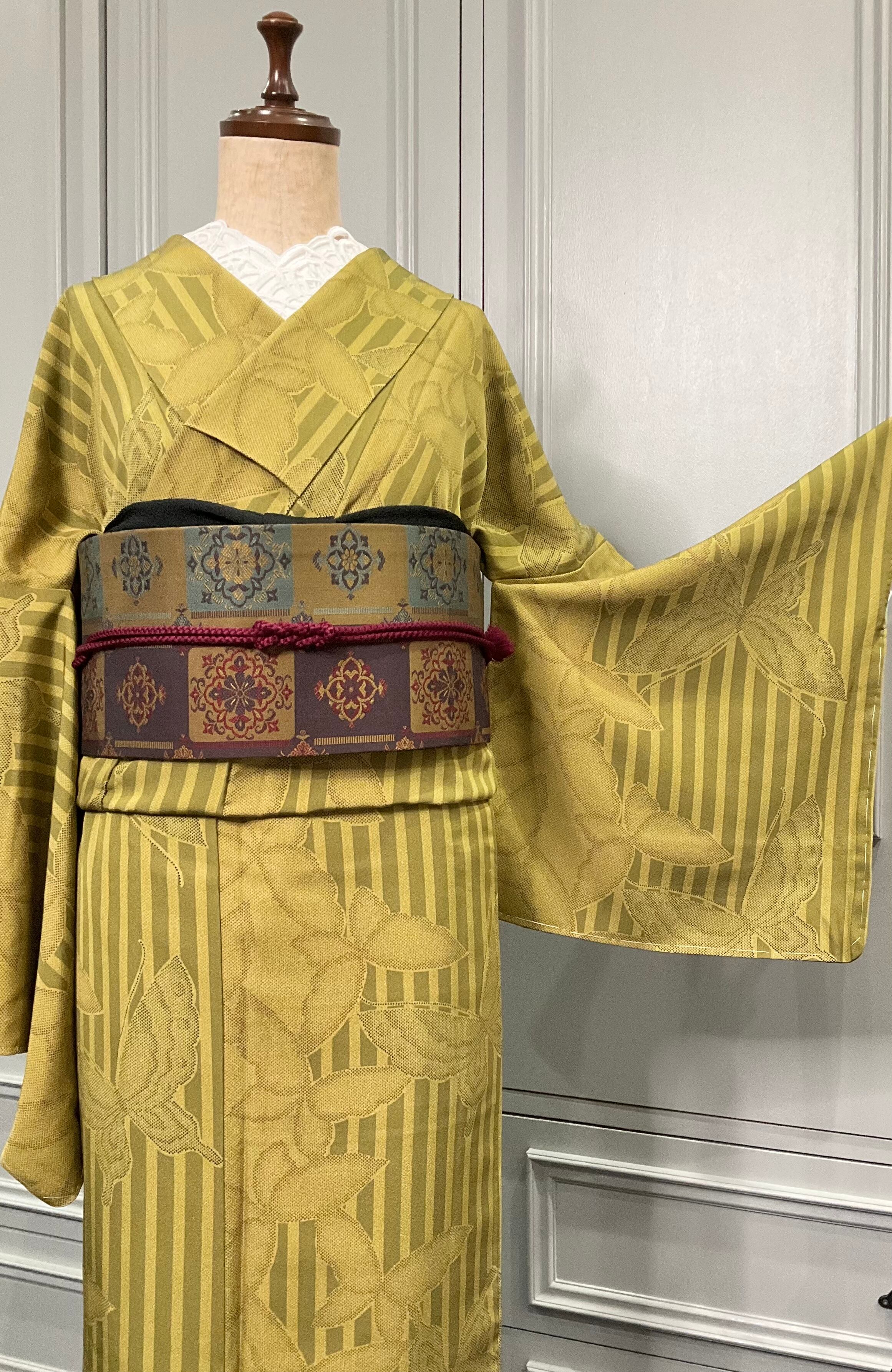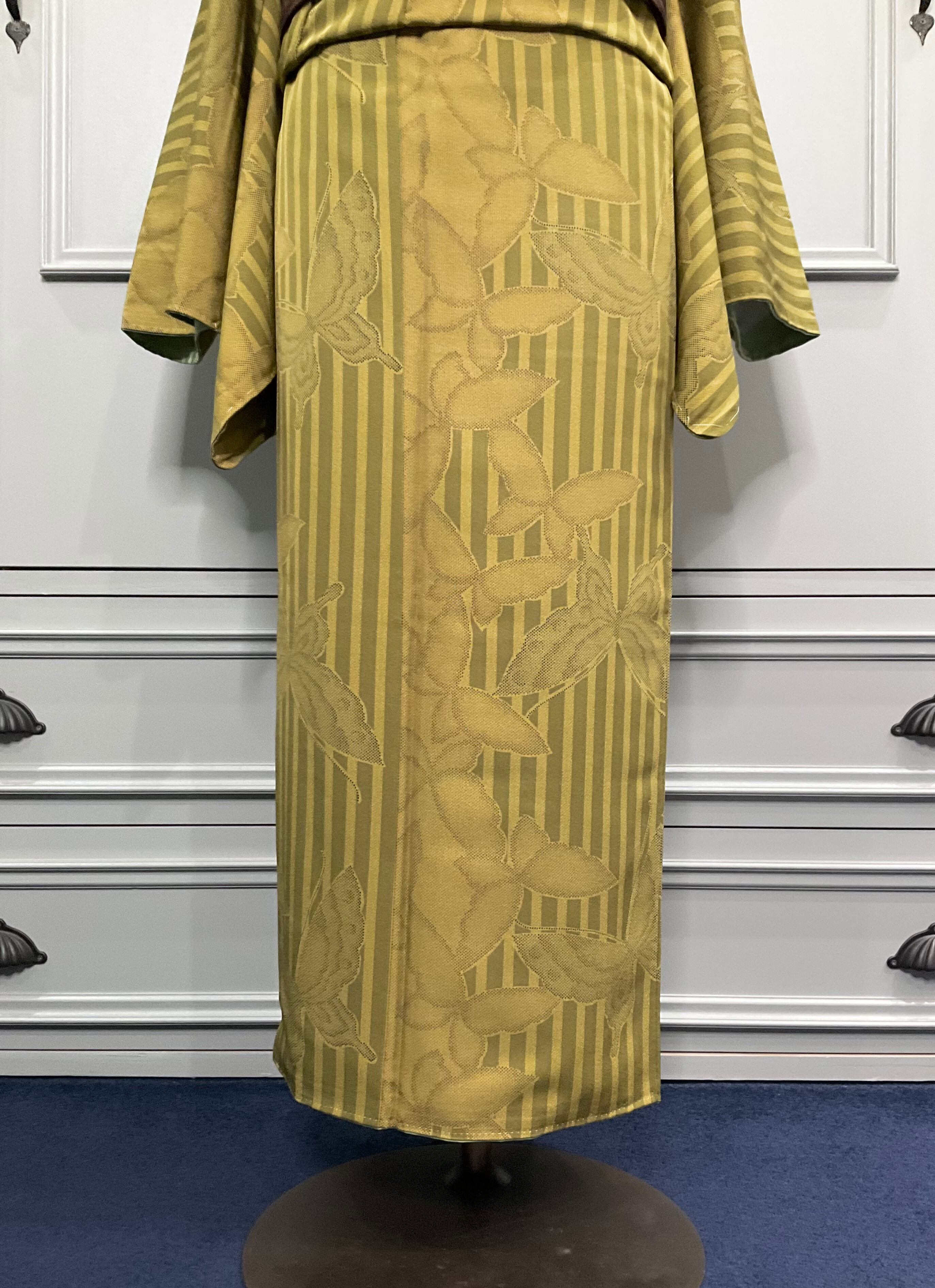 さらっとした手触りの生地感に、イエローグリーン系の地色とストライプ、そして大きな蝶々柄がオシャレなこちらのお着物。